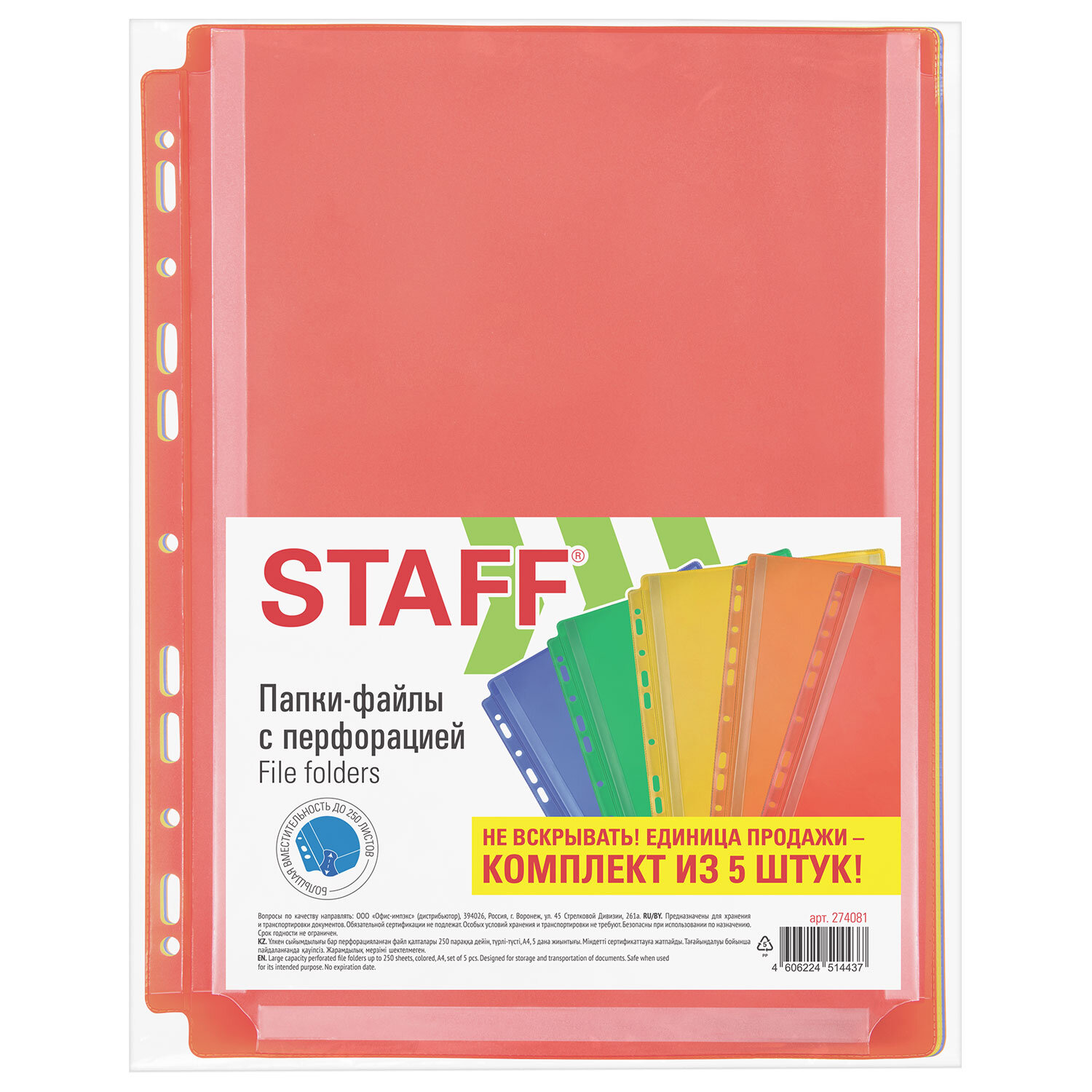 Папки-файлы с перфорацией БОЛЬШОЙ ВМЕСТИМОСТИ до 250 листов, ЦВЕТНЫЕ, А4, КОМПЛЕКТ 5 шт., STAFF Код товара: 274081 502,5 ₽ Купить Производитель:STAFF Цветные перфорированные папки-файлы STAFF большой вместимости предназначены для использования в архивных папках. Папки расширяются до 25 мм по бокам и снизу, что способствует хранению большого объема документов, каталогов, презентаций. Перфопапки формата А4 с вертикальным размещением и универсальной перфорацией имеют матовую поверхность и прочные швы. Лицевая сторона прозрачная, оборотная – тонированная. Увеличенная толщина ПВХ-пленки 180 мкм допускает более интенсивную эксплуатацию, что подходит для хранения документов количеством до 250 листов. Папки расширяются по боковой и по нижней стороне. В комплекте 5 штук.Производство: РоссияФормат: А4Количество в комплекте: 5 шт.Толщина пленки: 180 мкмОриентация: вертикальнаяФактура: матоваяВозможность расширения: даЦвет: ассортиВес: 210 грРазмер упаковки: 1.2 × 31.8 × 23.7 смОбъём: 0.0004 м3Промежуточная упаковка: 60 штТранспортная упаковка: 60 штШтрих-код: 4606224514437 Файлы Сертификат-1.jpg Сертификат-2.jpg Сертификат-3.jpg Сертификат-4.jpg Сертификат-5.jpg Сертификат-6.jpg Сертификат-7.jpg Сертификат-8.jpg Сертификат-9.jpg Сертификат-10.jpg Сертификат-11.jpg Сертификат-12.jpg Сертификат-13.jpg Сертификат-14.jpg Сертификат-15.jpg Сертификат-16.jpg Сертификат-17.jpg Сертификат-18.jpg Сертификат-19.jpg Сертификат-20.jpg Сертификат-21.jpg Сертификат-22.jpg Сертификат-23.jpg Сертификат-24.jpg Сертификат-25.jpg Сертификат-26.jpg