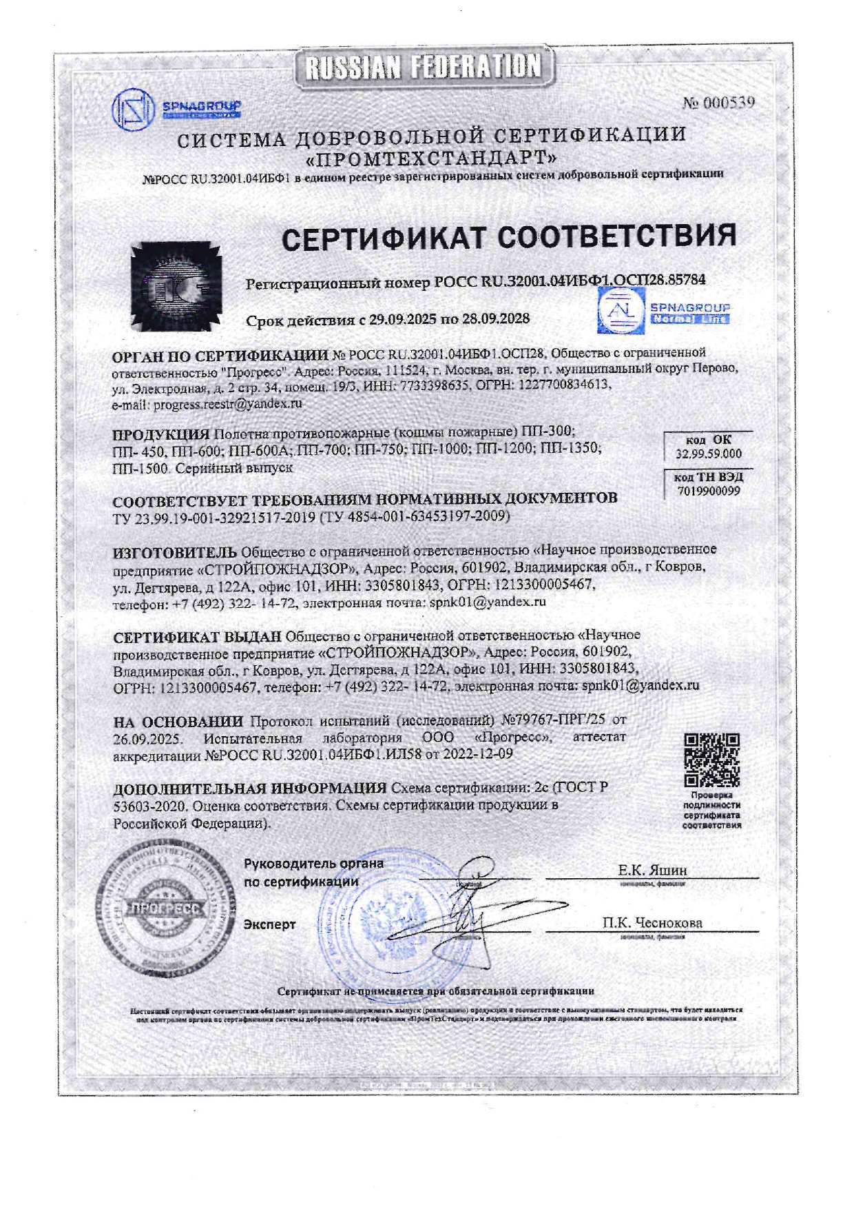 Полотно противопожарное ПП-600, размер 1,5х2 м, СТРОЙПОЖНАДЗОР Код товара: 610880 509,2 ₽ Купить Производитель:СТРОЙПОЖНАДЗОР Противопожарное полотно ПП-600 – первичное средство пожаротушения для устранения локальных очагов возгорания, тушения горящей одежды на пострадавшем, защиты горючих конструкций и оборудования при проведении огневых работ (возгорания классов А, В, Е). Характеристики: Материал – стеклоткань. Размер – 1500x2000 мм. Размер в сложенном виде – 270x200x50 мм.Производство: РоссияТип товара: полотноМатериал: стеклотканьРазмер: 1500x2000 ммРазмер в сложенном виде: 270x200x50 ммМаксимальная температура кратковременного использования до 5 сек: 650 °СМаксимальная температура длительного использования : 600 °СУпаковка: пакетВес: 555 грРазмер упаковки: 4.8 × 20.8 × 13.8 смОбъём: 0.0013 м3Промежуточная упаковка: 40 штТранспортная упаковка: 40 штШтрих-код: 4631140657548 Сертификат-1.jpg Сертификат-2.jpg Сертификат-3.jpg