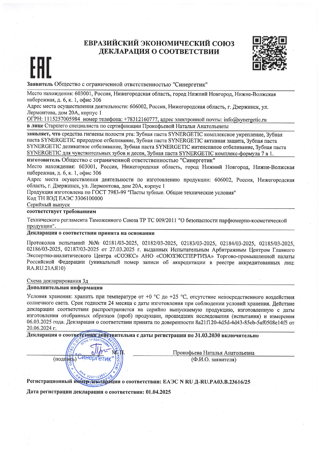 Зубная паста активно защищает зубную эмаль и растворяет зубной налет. Активные компоненты в этой пасте – безопасные цитрат цинка, гидроксиапатит и дикальцийфосфат дигидрат. Эффективный комплекс этих компонентов проникает в мельчайшие трещинки эмали и "запечатывает" их, формирует защитный минеральный слой и регулирует фосфорно-кальциевый обмен, восполняя дефицит кальция в зубной эмали.