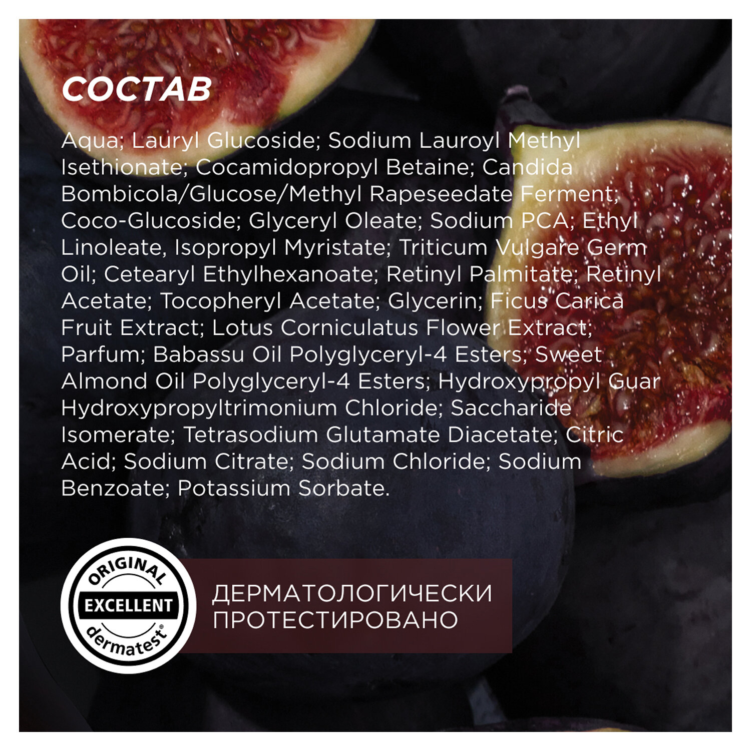 Состав: Aqua, Lauryl Glucoside, Sodium Lauroyl Methyl Isethionate, Cocamidopropyl Betaine, Candida Bombicola/Glucose/Methyl Rapeseedate Ferment, Coco-Glucoside, Glyceryl Oleate, Sodium PCA, Ethyl Linoleate, Isopropyl Myristate, Triticum Vulgare Germ Oil, Cetearyl Ethylhexanoate, Retinyl Palmitate, Retinyl Acetate, Tocopheryl Acetate, Glycerin, Ficus Carica Fruit Extract, Lotus Сorniculatus Flower Extract, Parfum, Babassu Oil Polyglyceryl-4 Esters, Sweet Almond Oil Polyglyceryl-4 Esters, Hydroxypropyl Guar Hydroxypropyltrimonium Chloride, Saccharide Isomerate, Tetrasodium Glutamate Diacetate, Citric Acid, Sodium Citrate, Sodium Chloride, Sodium Benzoate, Potassium Sorbate.