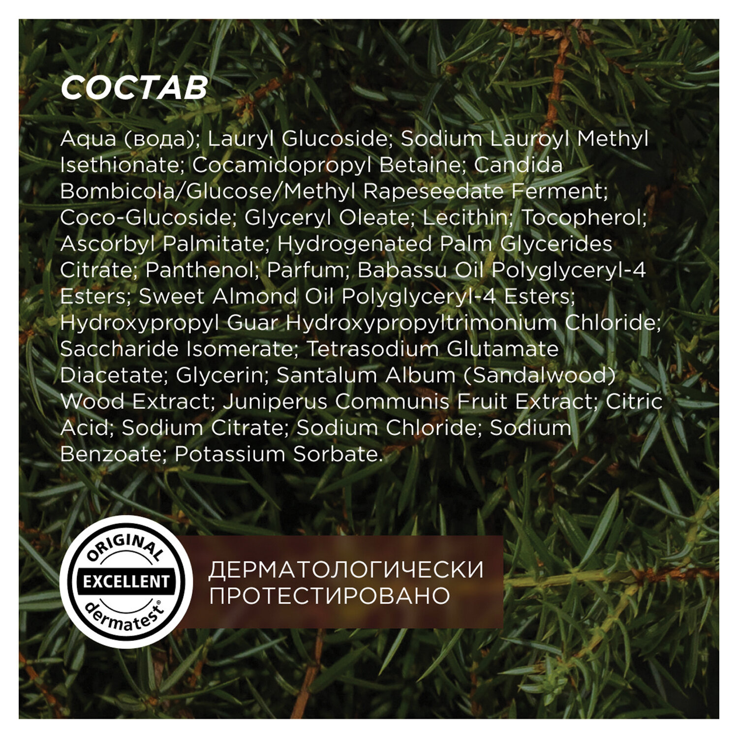 Состав: Aqua, Lauryl Glucoside, Sodium Lauroyl Methyl Isethionate, Cocamidopropyl Betaine, Candida Bombicola/Glucose/Methyl Rapeseedate Ferment, Coco-Glucoside, Glyceryl Oleate, Lecithin, Tocopherol, Ascorbyl Palmitate, Hydrogenated Palm Glycerides Citrate, Panthenol, Parfum, Babassu Oil Polyglyceryl-4 Esters, Sweet Almond Oil Polyglyceryl-4 Esters, Hydroxypropyl Guar Hydroxypropyltrimonium Chloride, Saccharide Isomerate, Tetrasodium Glutamate Diacetate, Glycerin, Santalum Album Wood Extract, Juniperus Communis Fruit Extract, Citric Acid, Sodium Citrate, Sodium Chloride, Sodium Benzoate, Potassium Sorbate.