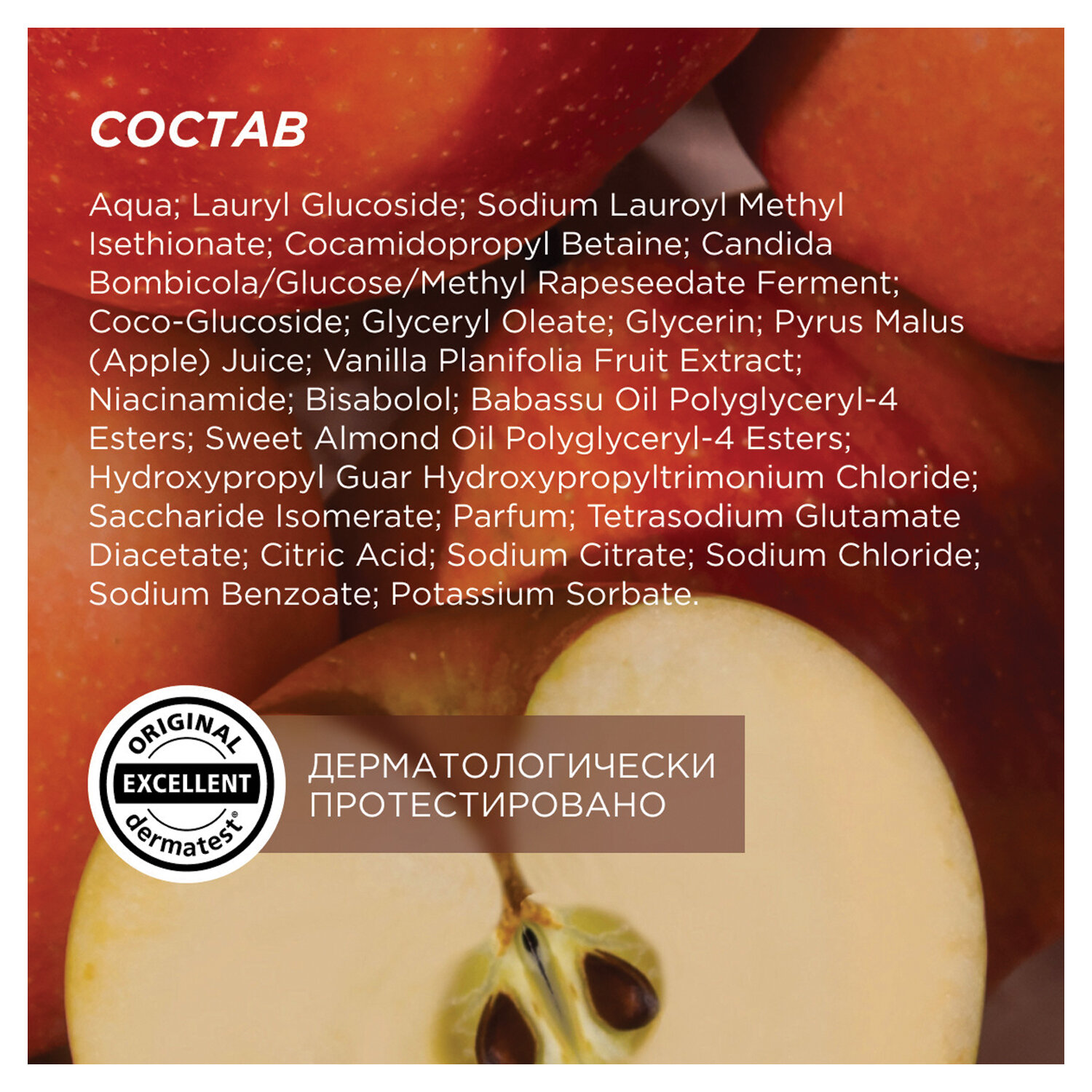 Состав: Aqua, Lauryl Glucoside, Sodium Lauroyl Methyl Isethionate, Cocamidopropyl Betaine, Candida Bombicola/Glucose/Methyl Rapeseedate Ferment, Coco-Glucoside, Glyceryl Oleate, Glycerin, Pyrus Malus Juice, Vanilla Planifolia Fruit Extract, Niacinamide, Bisabolol, Babassu Oil Polyglyceryl-4 Esters, Sweet Almond Oil Polyglyceryl-4 Esters, Hydroxypropyl Guar Hydroxypropyltrimonium Chloride, Saccharide Isomerate, Parfum, Tetrasodium Glutamate Diacetate, Citric Acid, Sodium Citrate, Sodium Chloride, Sodium Benzoate, Potassium Sorbate.