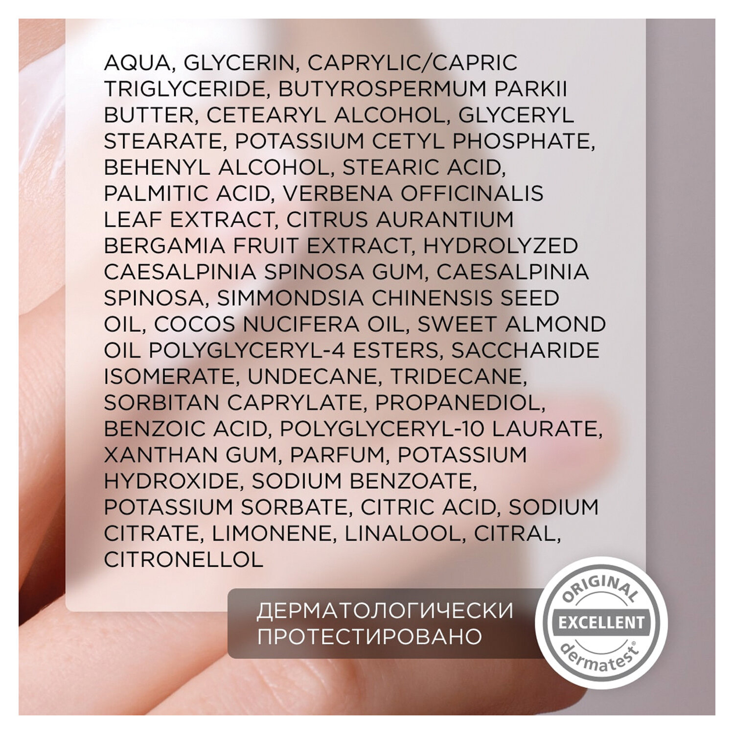 Состав INCI: Aqua, Glycerin, Caprylic/Capric Triglyceride, Butyrospermum Parkii Butter, Cetearyl Alcohol, Glyceryl Stearate, Potassium Cetyl Phosphate, Behenyl Alcohol, Stearic Acid, Palmitic Acid, Verbena Officinalis Leaf Extract, Citrus Aurantium Bergamia Fruit Extract, Hydrolyzed Caesalpinia Spinosa Gum, Caesalpinia Spinosa Gum, Simmondsia Chinensis Seed Oil, Cocos Nucifera Oil, Sweet Almond Oil Polyglyceryl-4 Esters, Saccharide Isomerate, Undecane, Tridecane, Sorbitan Caprylate, Propanediol, Benzoic Acid, Polyglyceryl-10 Laurate, Xanthan Gum, Parfum, Potassium Hydroxide, Sodium Benzoate, Potassium Sorbate, Citric Acid, Sodium Citrate, Limonene, Linalool, Citral, Citronellol.