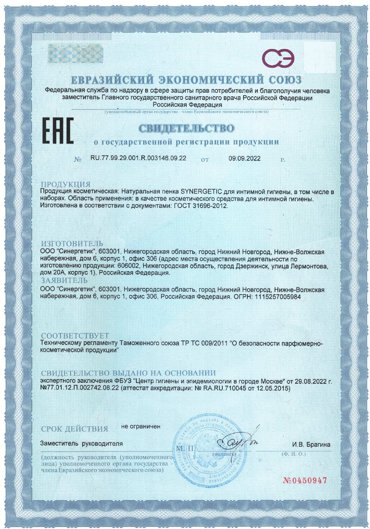 Пенка для интимной гигиены 150 мл, SYNERGETIC с молочной кислотой, натуральная Код товара: 701911 265,45 ₽ Купить Производитель:SYNERGETIC Натуральная пенка SYNERGETIC для интимной гигиены имеет легкую невесомую текстуру и обеспечивает деликатный ежедневный уход за самыми нежными местами. Бессульфатная пенка бережно очищает и увлажняет чувствительную кожу интимной зоны, поддерживая необходимый pH баланс, предотвращая раздражения и сохраняя естественную среду. Средство легко смывается, обеспечивая комфорт и чувство свежести. Мультифункциональный компонент натурального происхождения софоролипид мягко очищает и сохраняет естественный микробиом кожи. Натуральный пребиотик и природный антиоксидант трегалоза активно увлажняет и успокаивает чувствительную кожу, помогает уменьшить раздражение и дискомфорт. Противовоспалительный и заживляющий компонент бисаболол оказывает регенерирующее действие на кожу, способствует восстановлению гидробаланса. Молочная кислота способствует поддержанию естественного баланса микрофлоры, не вызывая чувство сухости. Активный увлажняющий комплекс в сочетании с соком алоэ вера обладает смягчающим, тонизирующим и противовоспалительным действием. Продукт дерматологически протестирован на чувствительной коже независимым институтом Dermatest в Германии. Пенка не содержит SLS, SLES, силиконов, минеральных масел, красителей, не тестируется на животных и сертифицирована британской организацией The Vegan Society. Знак Vegan – мировой стандарт этичной продукции. Состав ГОСТ: Aqua (вода); Sodium Cocoamphoacetate (мягкий ПАВ); Cocamidopropyl Betaine (мягкий ПАВ из кокосового масла); Glycerin (увлажняющий компонент растительного происхождения); Caprylyl/Capryl Glucoside (мягкий ПАВ); Candida Bombicola/Glucose/Methyl Rapeseedate Ferment (софоролипид, мультифункциональный компонент натурального происхождения, мягко очищает и поддерживает естественную микрофлору кожи); Trehalose (натуральный пребиотик); Aloe Barbadensis Leaf Juice (сок алоэ); Lactic Acid (молочная кислота); Saccharide Isomerate (увлажняющий компонент натурального происхождения); Citric Acid (лимонная кислота, стабилизатор кислотности); Sodium Citrate (соль лимонной кислоты, поддерживающая оптимальный уровень рН); Bisabolol (заживляющий актив); Parfum (парфюмерная композиция); Dehydroacetic Acid; Benzyl Alcohol; Benzoic Acid; Sodium Benzoate; Potassium Sorbate (консерванты природного происхождения). Состав INCI: Aqua; Sodium Cocoamphoacetate; Cocamidopropyl Betaine; Glycerin; Caprylyl/Capryl Glucoside; Candida Bombicola/Glucose/Methyl Rapeseedate Ferment; Trehalose; Aloe Barbadensis Leaf Juice; Lactic Acid; Saccharide Isomerate; Citric Acid; Sodium Citrate; Bisabolol; Parfum; Dehydroacetic Acid; Benzyl Alcohol; Benzoic Acid; Sodium Benzoate; Potassium Sorbate.Производство: РоссияОбъем: 150 млТип средства: пенаУровень pH: -Отдушка: нейтральнаяПодходящий тип кожи: для всех типовОснова состава: -Тип дозирования: дозаторСерия: Для интимной гигиеныВид упаковки: флаконГипоаллергенно: даСрок годности: 36 месВес: 231 грРазмер упаковки: 5 × 17.6 × 4.7 смОбъём: 0.0006 м3Промежуточная упаковка: 6 штТранспортная упаковка: 6 штШтрих-код: 4607971455929 Файлы Сертификат-1.jpg