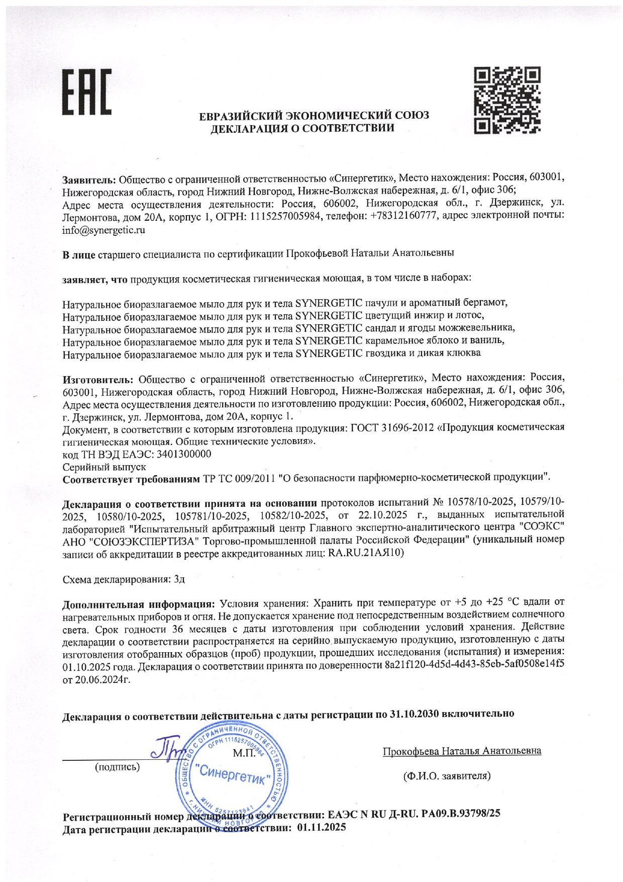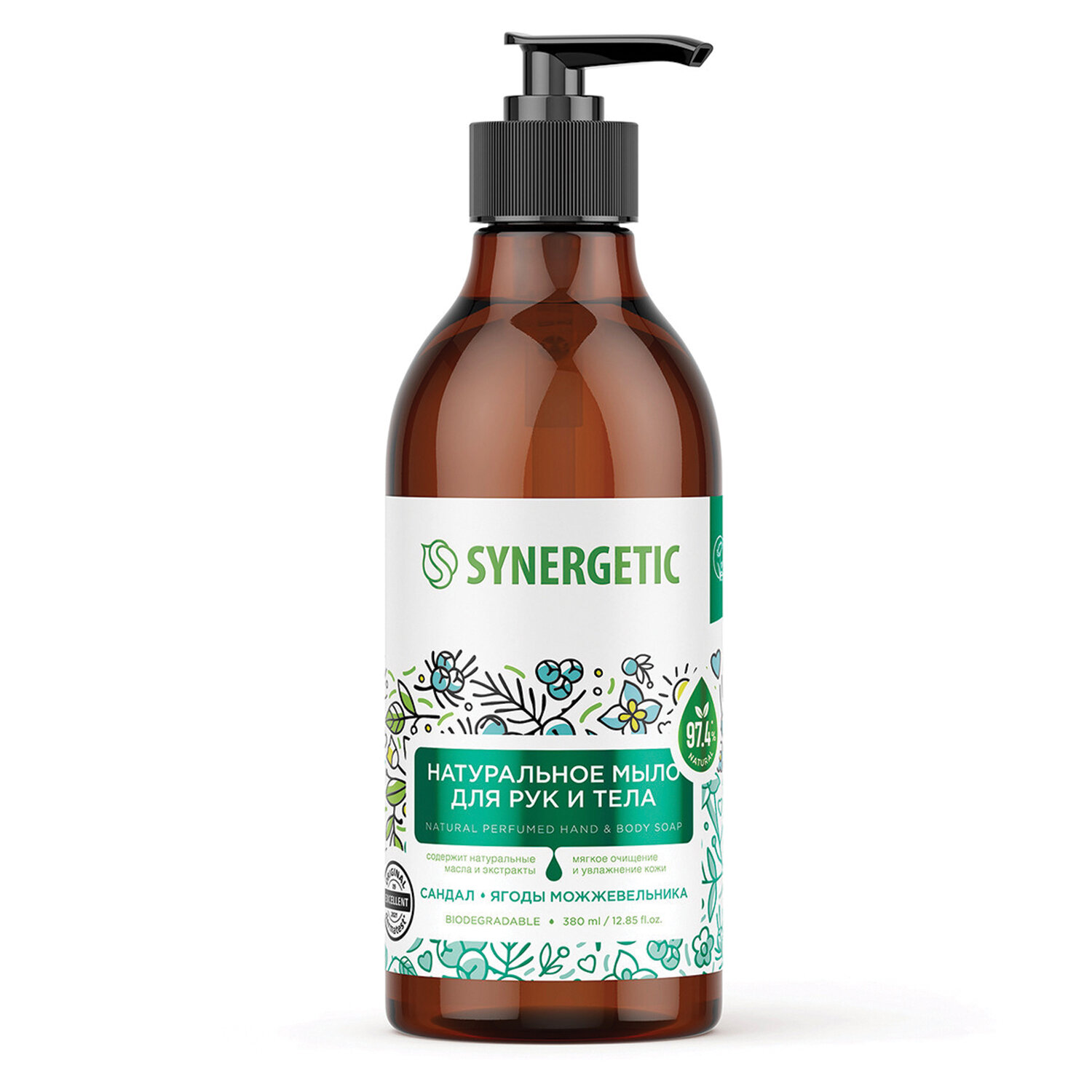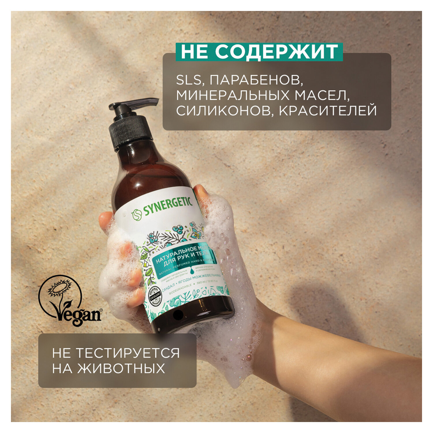 Средство не содержит SLS, силиконов, минеральных масел, красителей и компонентов животного происхождения, не тестируется на животных и сертифицировано британской организацией The Vegan Society. Знак Vegan – мировой стандарт этичной продукции. Мыло SYNERGETIC биоразлагаемое, а значит не вредит микрофлоре септических установок и разлагается в условиях естественной среды.