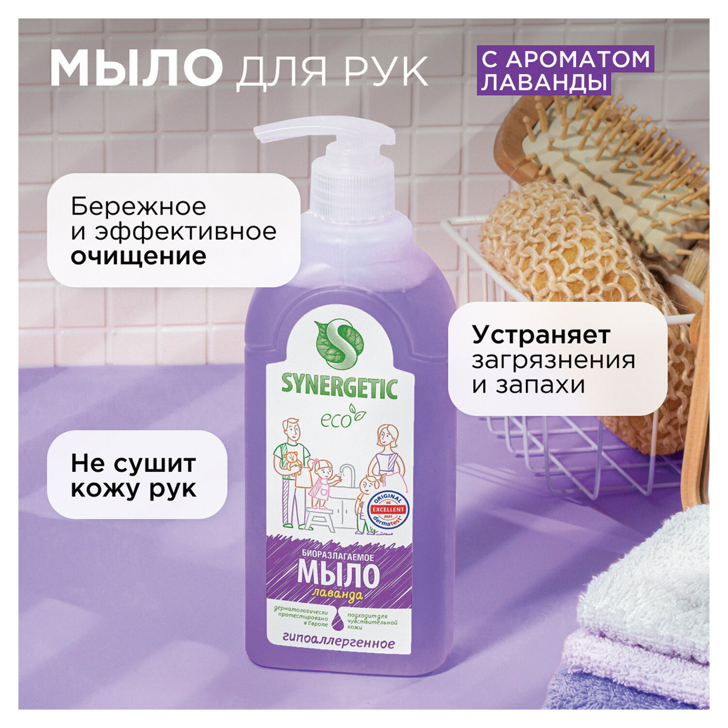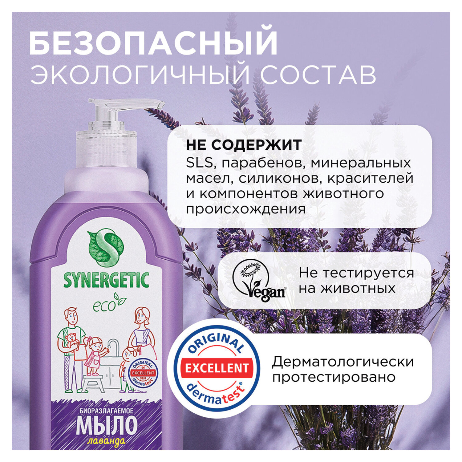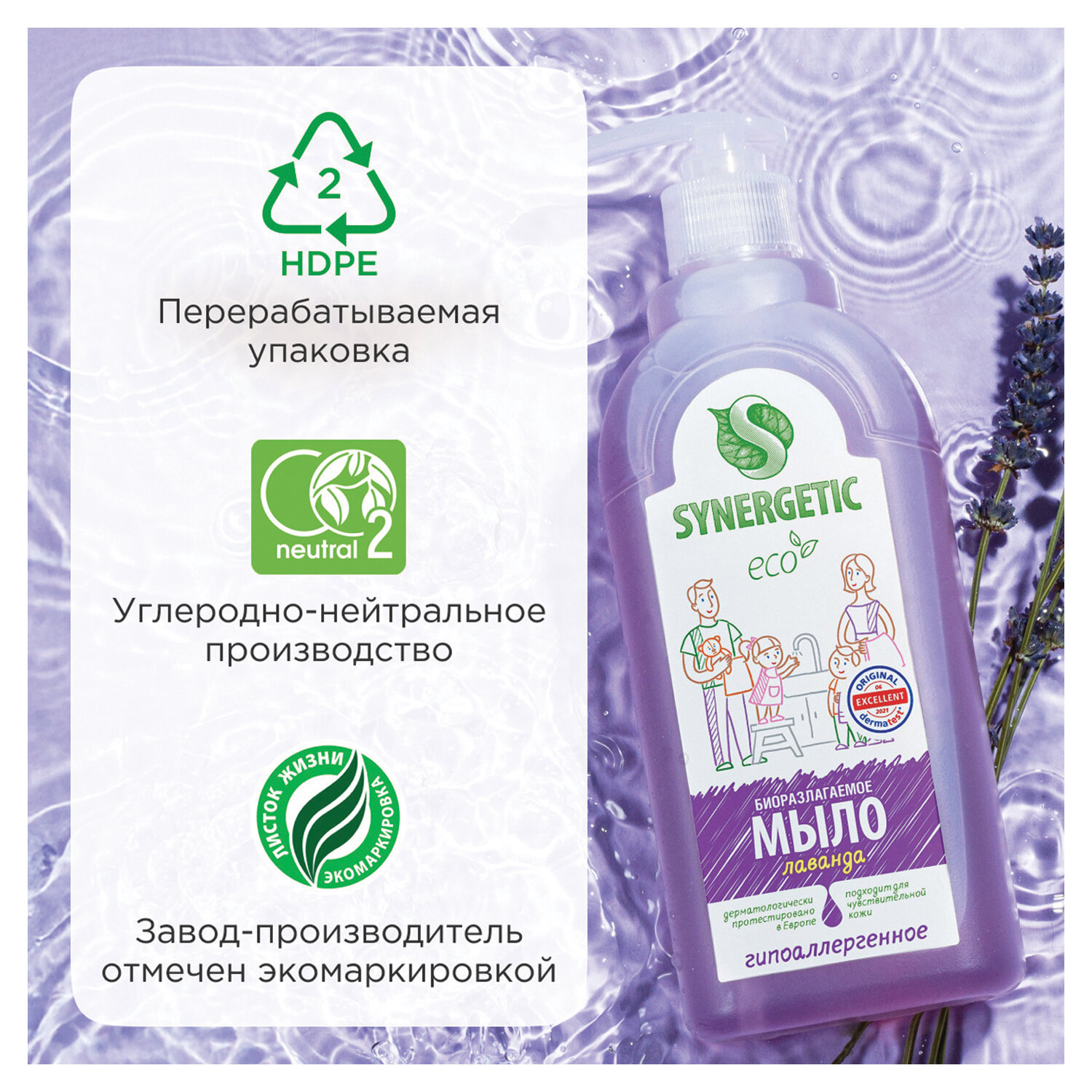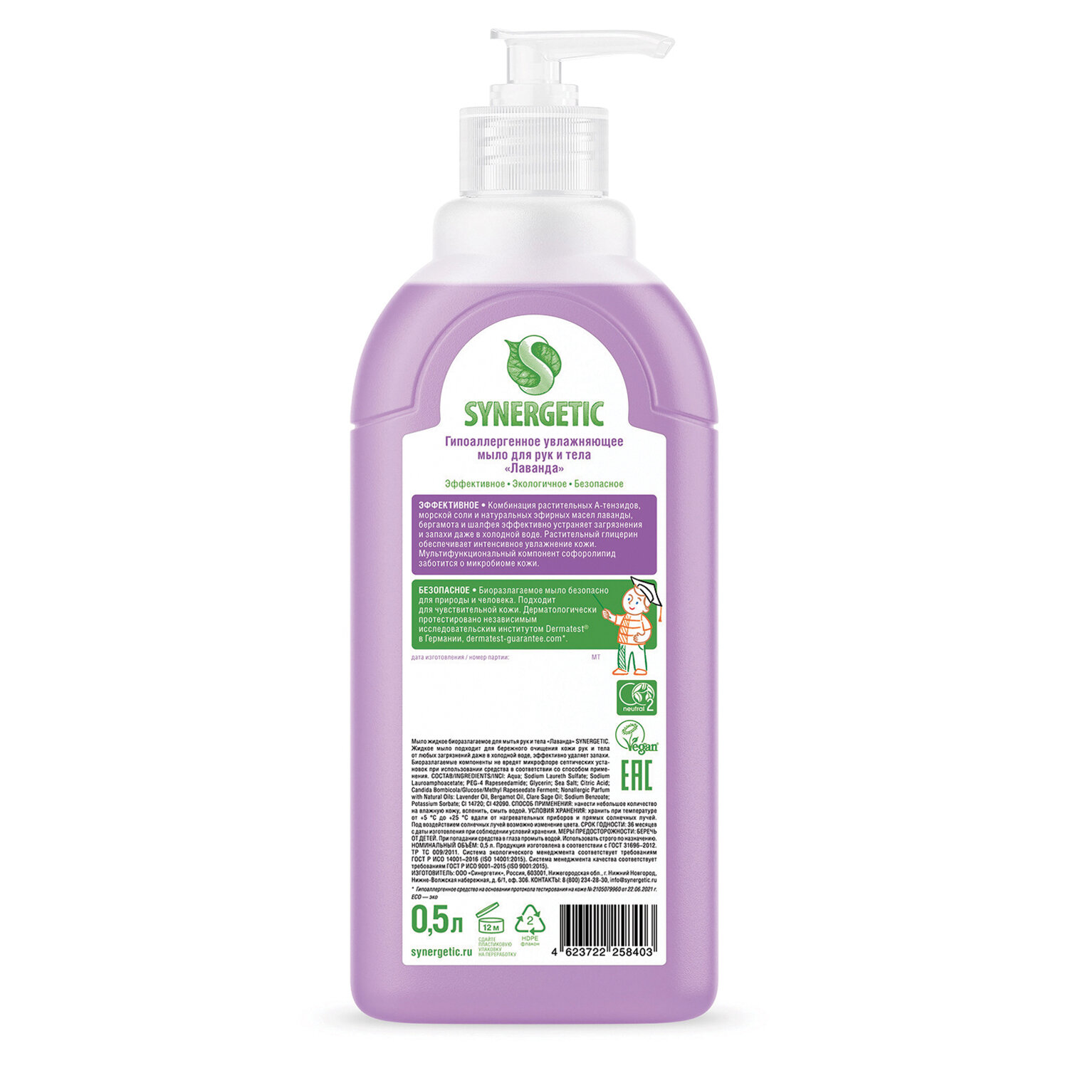 Мыло жидкое 500 мл, SYNERGETIC "Лаванда", гипоаллергенное, биоразлагаемое, дозатор Код товара: 701923 175,99 ₽ Купить Производитель:SYNERGETIC Биоразлагаемое увлажняющее мыло SYNERGETIC "Лаванда" подходит для бережного очищения кожи рук и тела от любых загрязнений. Комбинация растительных А-тензидов, морской соли и натуральных эфирных масел лаванды, бергамота и шалфея эффективно устраняет загрязнения и неприятные запахи даже в холодной воде. Растительный глицерин обеспечивает интенсивное увлажнение кожи. Мультифункциональный компонент софоролипид мягко очищает и заботится о естественном микробиоме кожи. Гипоаллергенное средство подходит для чувствительной кожи. Мыло дерматологически протестировано независимым исследовательским институтом Dermatest в Германии. Биоразлагаемые компоненты безопасны для природы и человека и не вредят микрофлоре септических установок при использовании средства в соответствии со способом применения. Жидкое мыло не содержит компонентов животного происхождения, не тестируется на животных и сертифицировано британской организацией The Vegan Society. Знак Vegan – мировой стандарт этичной продукции. Состав INCI: Aqua; Sodium Laureth Sulfate; Sodium Lauroamphoacetate; PEG-4 Rapeseedamide; Glycerin; Sea Salt; Citric Acid; Candida Bombicola/Glucose/Methyl Rapeseedate Ferment; Nonallergic Parfum with Natural Oils: Lavender Oil, Bergamot Oil, Clare Sage Oil; Sodium Benzoate; Potassium Sorbate; CI 14720; CI 42090. Активные компоненты: комбинация растительных А-тензидов, морской соли и натуральных эфирных масел лаванды, бергамота и шалфея, растительный глицерин, мультифункциональный компонент софоролипид.Производство: РоссияОбъем / Вес: 500 мл/гПодходящий тип кожи: для всех типовЭффект от использования: очищение, питание, смягчение, увлажнениеСерия: SOAPОтдушка: лавандаГипоаллергенно: даСбалансированный уровень рН: даТип дозирования: дозаторВид упаковки: флаконЦвет: сиреневыйСрок годности: 36 месРазмер упаковки: 4.9 × 21.4 × 7.9 смОбъём: 0.001 м3Промежуточная упаковка: 14 штТранспортная упаковка: 14 штШтрих-код: 4623722258403 Сертификат-1.jpg Сертификат-2.jpg