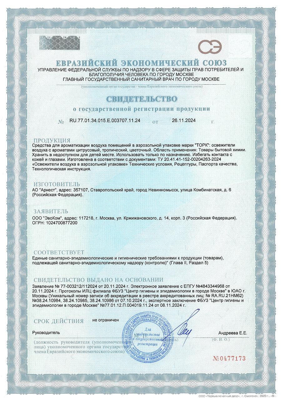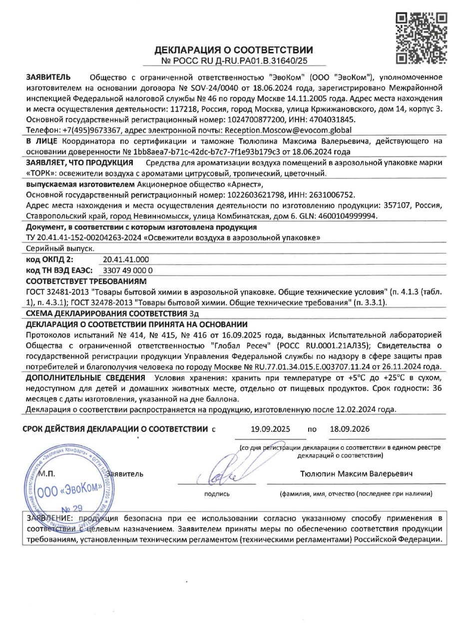 Сменный баллон 100 мл Tellus/TORK (Система АF1) СТАНДАРТ, тропический аромат Код товара: 703573 652,18 ₽ Купить Производитель:Tellus/TORK Аэрозольный освежитель воздуха Tellus позволяет эффективно контролировать запах в туалетной комнате при минимальных усилиях. Свежий тропический аромат дарит ощущение чистоты. Аэрозольный освежитель воздуха Tellus cодержит концентрированные ароматические вещества, которые устраняют неприятные запахи в помещении, наполняют его легкими, нежными ароматами, и поддерживает свежесть на протяжении долгого времени. Подходит для использования в диспенсерах Tork A1 / AF1 для аэрозольного освежителя воздуха.Производство: РоссияДиспенсерная система: А1Объем картриджа: 100 млСерия: AirОтдушка: тропическаяСрок годности: 36 месВес: 91 грРазмер упаковки: 13 × 4.5 × 4.5 смОбъём: 0.0003 м3Промежуточная упаковка: 12 штТранспортная упаковка: 12 штШтрих-код: 4670199850975 Файлы Приложение-1.pdf Сертификат-1.jpg Сертификат-2.jpg