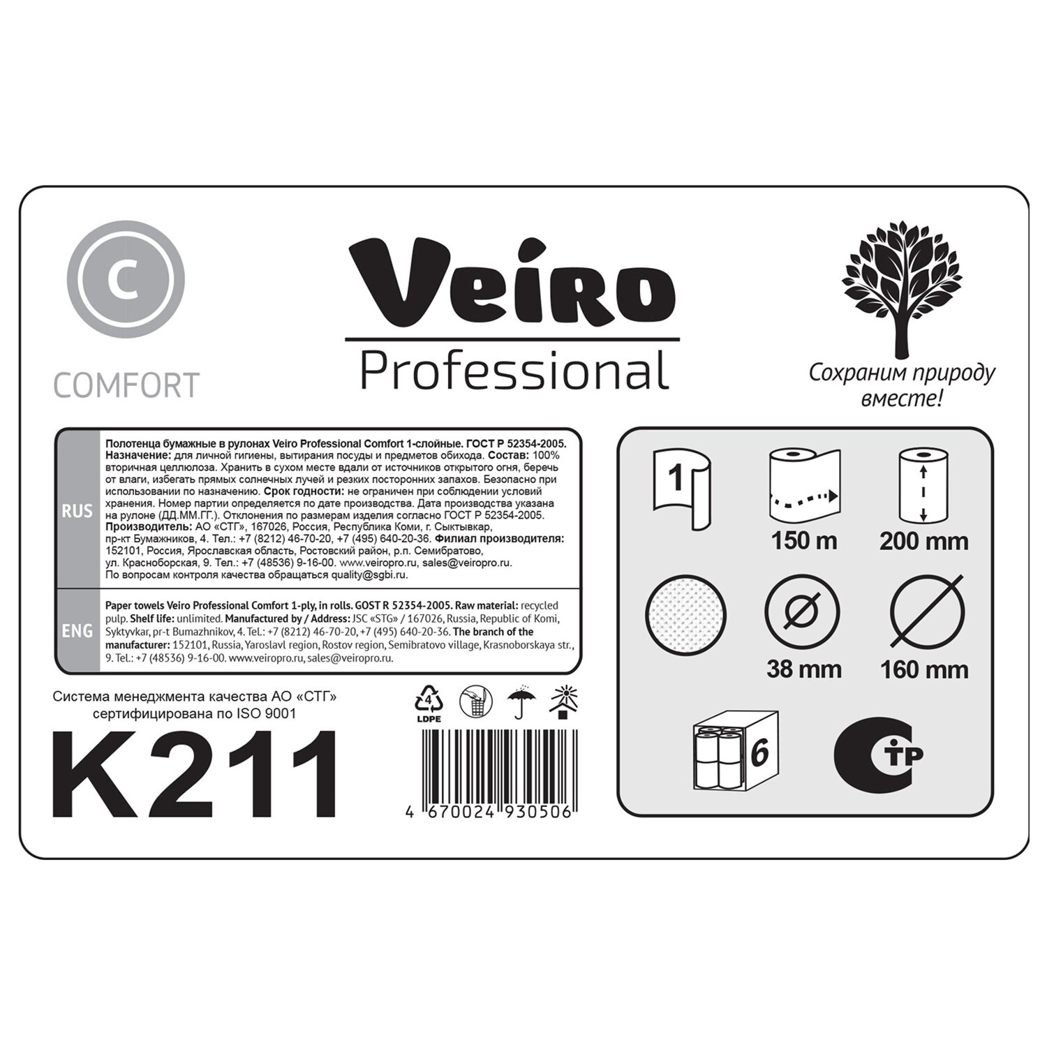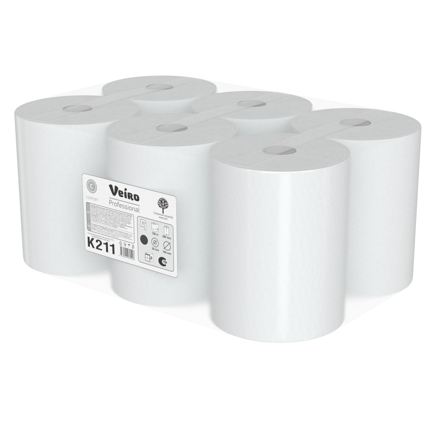 Полотенца бумажные рулонные 150 м, VEIRO Professional (H1) COMFORT, 1-слойные, КОМПЛЕКТ 6 рулонов Код товара: 118708 2 030,42 ₽ Купить Производитель:VEIRO PROFESSIONAL Бумажные полотенца в рулонах VEIRO Professional подходят к диспенсерным системам H1 ПРИ ИСПОЛЬЗОВАНИИ ОРИГИНАЛЬНЫХ ВТУЛОК от расходных материалов H1. Прекрасно подходят для мест с высокой и средней проходимостью. Тиснение придает полотенцам дополнительную мягкость. Произведены с использованием вторичного сырья. С заботой о сохранении природных ресурсов.Производство: РоссияДиспенсерная система: H1Тип сложения: рулонКоличество слоев: 1Сырье: облагороженная макулатураЦвет бумаги: натуральныйТиснение: даДоля вторичного сырья: 100 %Перфорация: нетКоличество в спайке: 6 шт.Длина намотки: 150 мКоличество листов: 0 шт.Ширина листа: 0 смДлина листа: 0 смШирина пачки/рулона: 16 смВысота пачки/рулона: 20 смГлубина пачки/рулона: 16 смВнутренний диаметр втулки: 3.8 смСочетаются с оборудованием других производителей: даАртикул: K211Серия: УниверсалВес: 5,61 кгРазмер упаковки: 20.1 × 46.8 × 31.1 смОбъём: 0.0293 м3Промежуточная упаковка: 1 штТранспортная упаковка: 1 шт