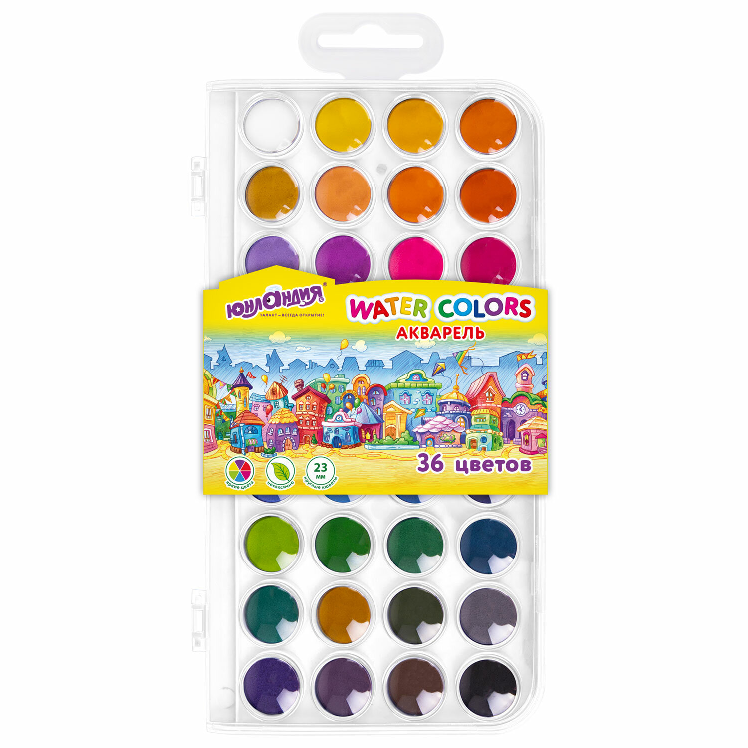 Краски акварельные ЮНЛАНДИЯ "ДОМИКИ", 36 цветов, круглые кюветы 23 мм, пенал Код товара: 192633 263,32 ₽ Купить Производитель:ЮНЛАНДИЯ Акварельные краски ЮНЛАНДИЯ "ДОМИКИ" идеально подходят для уроков детского творчества и художественного изобразительного искусства. Рисование способствует развитию образного мышления, глазомера, мелкой моторики рук, тонкого восприятия цветовой гаммы. В наборе 36 насыщенных цветов, которые отлично смешиваются, позволяя создавать множество оттенков. Краски легко наносятся, образуя интенсивное яркое покрытие даже при нанесении в один слой. Обеспечивают однородное окрашивание, быстро высыхают и не портятся со временем. Краски безопасны для детей, нетоксичны. Выпускаются в пластиковом пенале с европодвесом, прозрачной крышкой, круглой формой кювет и отделением для кисточки. Съемную пластиковую крышку можно использовать в качестве палитры для смешивания красок.Производство: КитайКоличество цветов в наборе: 36 шт.Добавка в основу: нетОтделение для кисточки: даФорма кювет: круглаяСпецэффект: классическийСерия: Юнландия домикиУпаковка: пластиковая коробка с европодвесомВес: 249 грРазмер упаковки: 1.7 × 25.5 × 13.9 смОбъём: 0.0008 м3Промежуточная упаковка: 12 штТранспортная упаковка: 48 штШтрих-код: 4606224485966 Сертификат-1.jpg Сертификат-2.jpg