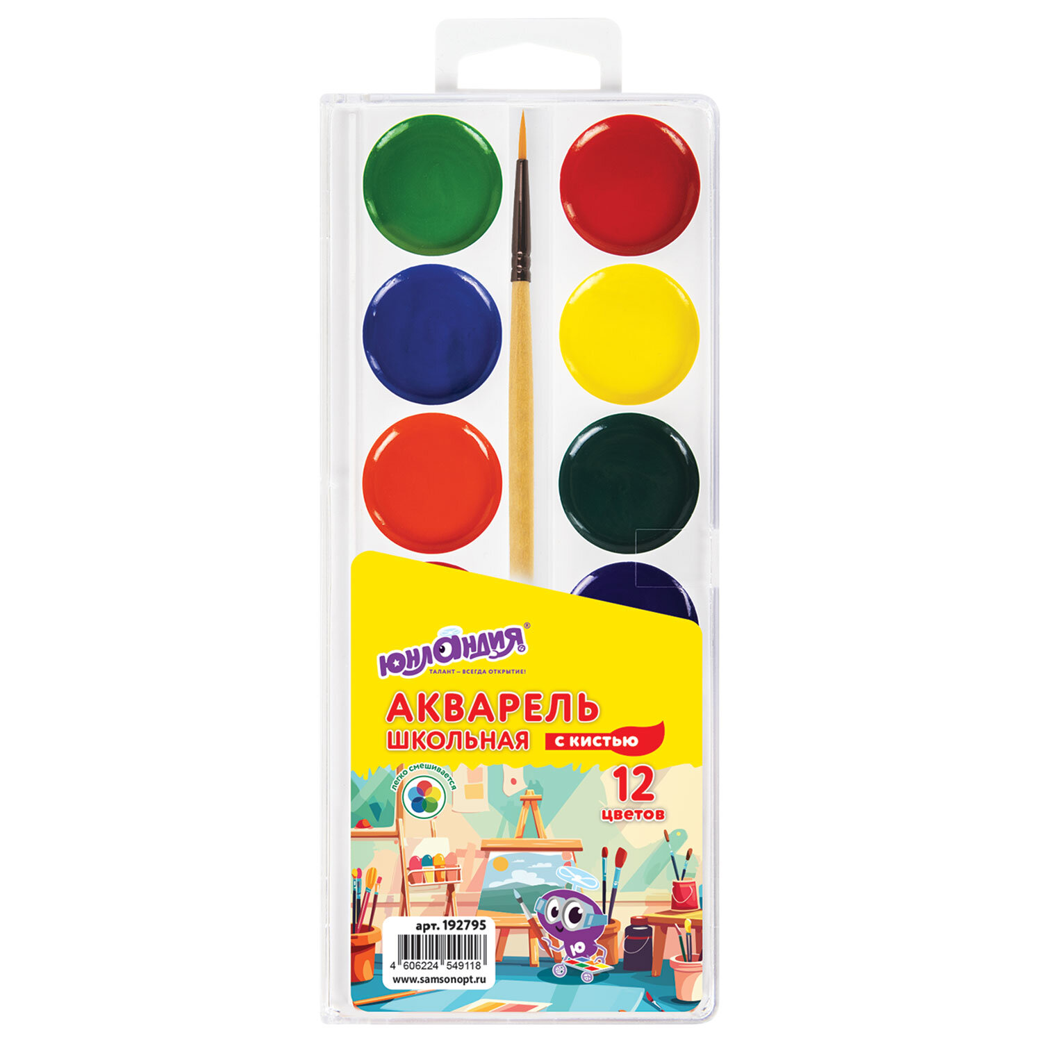 Краски акварельные ЮНЛАНДИЯ "ШКОЛЬНЫЕ", 12 цветов, медовые, КИСТЬ в комплекте, пластиковый пенал Код товара: 192795 132,57 ₽ Купить Производитель:ЮНЛАНДИЯ Краски акварельные ЮНЛАНДИЯ обладают отличной укрывистостью, прекрасно смешиваются и сохраняют яркость при высыхании. Отлично ложатся на бумагу. Изготовлены с добавлением натуральной патоки и пчелиного меда. 12 ярких насыщенных цветов отлично смешиваются между собой и позволяют создать множество оттенков, обеспечивают однородное окрашивание. Краски быстро высыхают и не портятся со временем. Безопасны для детей, нетоксичны. Идеально подойдут для детского творчества и художественного изобразительного искусства. Краски выпускаются в пластиковом пенале с европодвесом, прозрачной крышкой, круглой формой кювет и отделением для кисточки. Кисть в комплекте является отличным дополнением. Упаковка обладает компактными размерами и легким весом.Производство: РоссияКоличество цветов в наборе: 12 шт.Добавка в основу: патокаС кистью: даОтделение для кисточки: даФорма кювет: круглаяСпецэффект: нетСерия: ШкольныеДизайн: нетУпаковка: пластиковая коробка с европодвесомВес: 89 грРазмер упаковки: 1.2 × 20.4 × 7.8 смОбъём: 0.0002 м3Промежуточная упаковка: 27 штТранспортная упаковка: 27 штШтрих-код: 4606224549118 Файлы