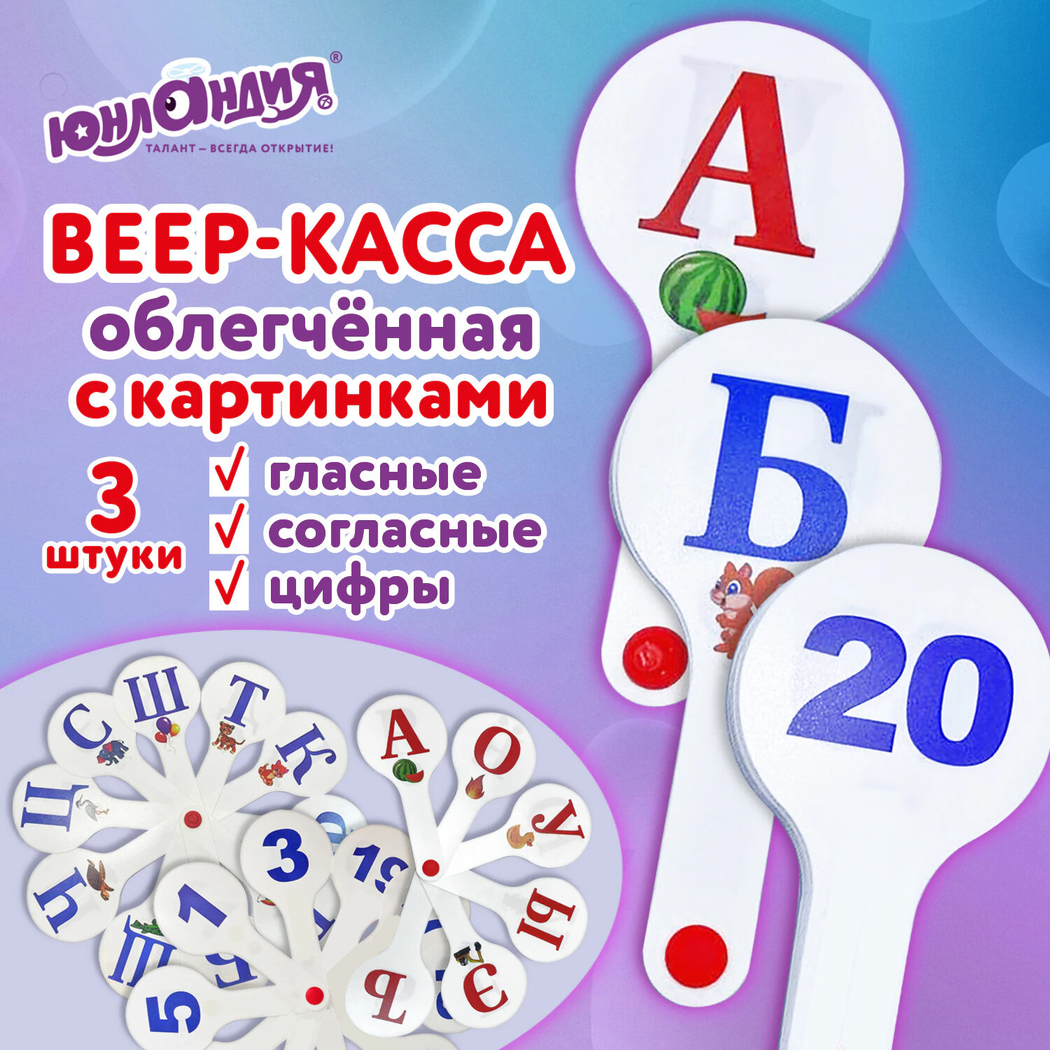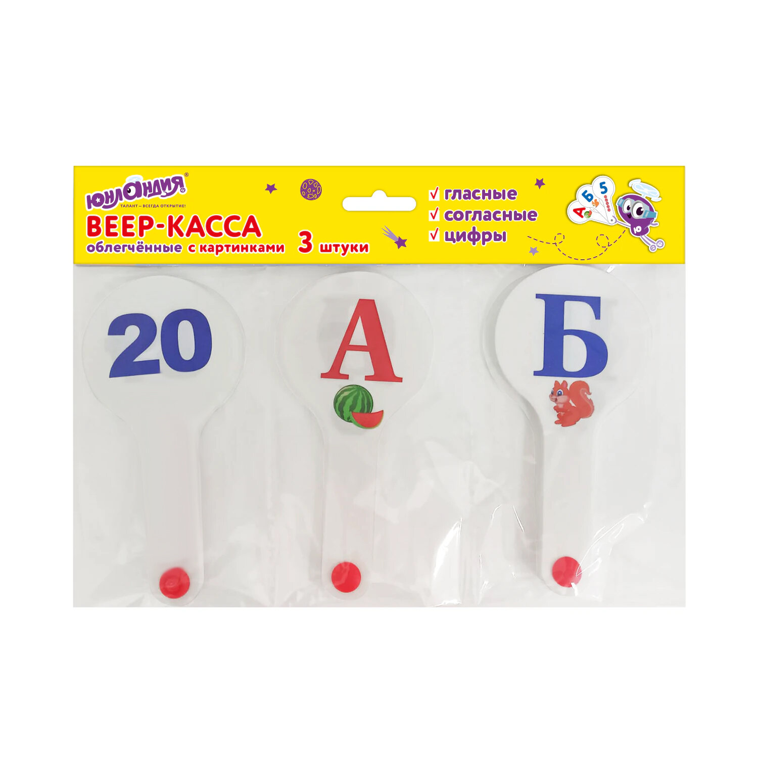 Веер-касса с картинками (гласные, согласные, цифры), ОБЛЕГЧЕННЫЕ, гибкие, НАБОР 3 шт., ЮНЛАНДИЯ, 274054 Код товара: 274054 255 ₽ Купить Производитель:ЮНЛАНДИЯ Обучающая веер-касса ЮНЛАНДИЯ – незаменимый инструмент для быстрого изучения букв русского алфавита и цифр от 1 до 20! Универсальный набор обучающих веер-касс – идеальное решение для комплексного развития вашего ребенка и подготовки его к школе. В комплект входят три веера, охватывающие основные аспекты начального обучения: Эти веер-кассы помогут вашему ребенку быстро и весело выучить буквы алфавита и цифры от 1 до 20, а также развить ассоциативное мышление благодаря ярким картинкам.Производство: РоссияСимволы: гласные буквы русского алфавита, согласные буквы русского алфавита, цифрыКоличество вееров в наборе: 3 шт.Символы нанесены с двух сторон: даВысота: 135 ммШирина: 62 ммГлубина: 1 ммМатериал: ПВХУпаковка: пакет с европодвесомВес: 65 грРазмер упаковки: 1.2 × 25.6 × 13.7 смОбъём: 0.0003 м3Промежуточная упаковка: 50 штТранспортная упаковка: 50 штШтрих-код: 4606224513478 Файлы Сертификат-1.jpg Сертификат-2.jpg Сертификат-3.jpg Сертификат-4.jpg