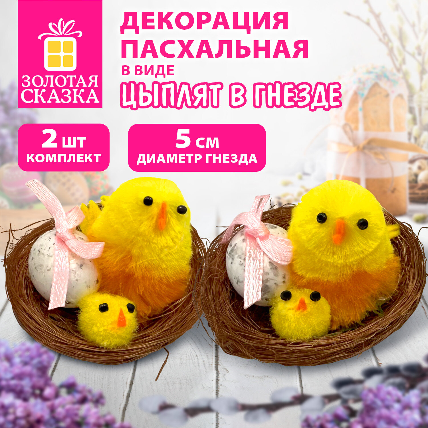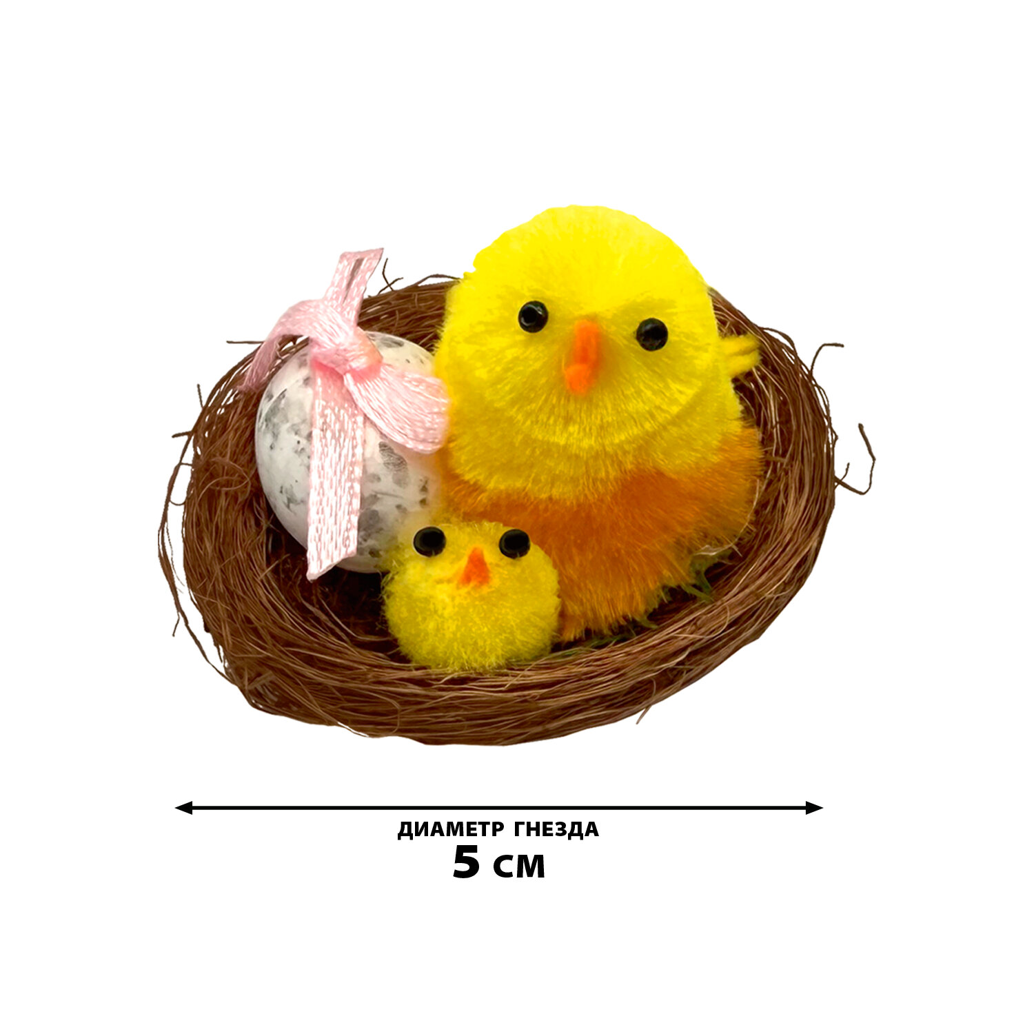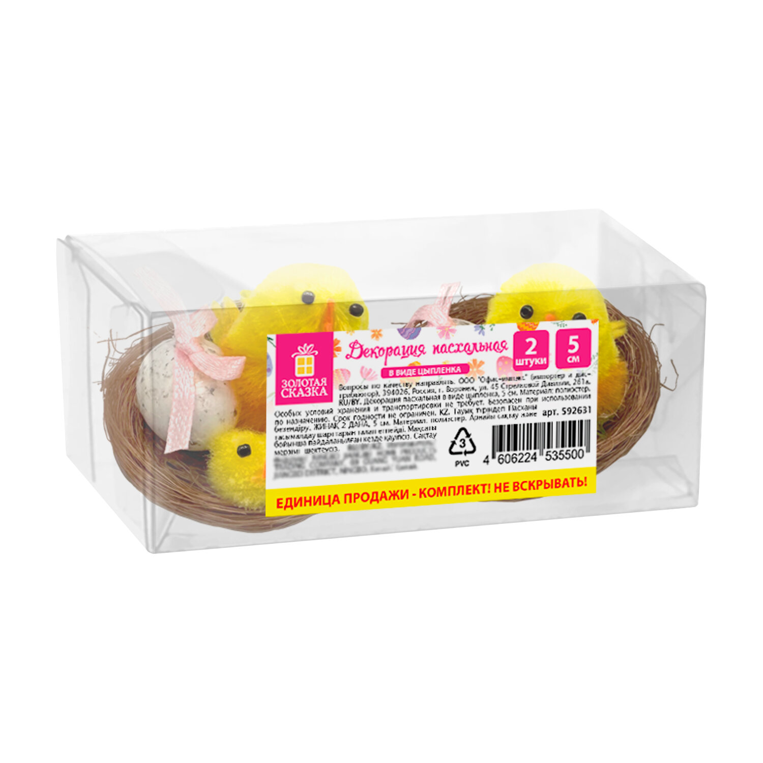 Декорация пасхальная 5 см "Птенцы в гнезде", КОМПЛЕКТ 2 штуки, полиэстер, ЗОЛОТАЯ СКАЗКА Код товара: 592631 128,16 ₽ Купить Производитель:ЗОЛОТАЯ СКАЗКА Украсьте свой праздник тёплыми символами весны и возрождения с очаровательной декорацией "Птенцы в гнезде" ЗОЛОТАЯ СКАЗКА. Миниатюрные фигурки изображают милых птенцов, уютно устроившихся в плетёном гнёздышке – трогательный образ новой жизни, гармонии и семейного тепла. Такой декор станет изюминкой интерьерного оформления дома, офиса или витрины, фотозоны на празднике, подарочной упаковки. В комплекте 2 декоративных украшения диаметром 5 см. Выполнены из полиэстера, полипропилена, полистирола, медной проволоки. Упакованы в прозрачный ПВХ-бокс.Производство: КитайТип товара: пасхальная декорацияМатериал: полиэстер, полипропилен, полистирол, медная проволокаРазмер: 5х5 смКоличество в комплекте: 2 шт.Цвет: желтыйДизайн: Птенцы в гнездеУпаковка: ПВХ-боксВес: 35 грРазмер упаковки: 4.2 × 5.2 × 10.7 смОбъём: 0.0009 м3Промежуточная упаковка: 5 штТранспортная упаковка: 60 штШтрих-код: 4606224535500 Сертификат-1.jpg Сертификат-2.jpg