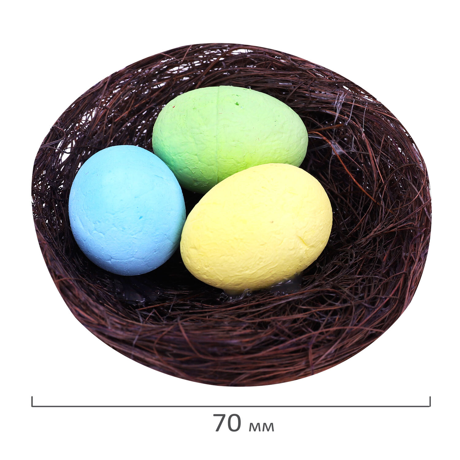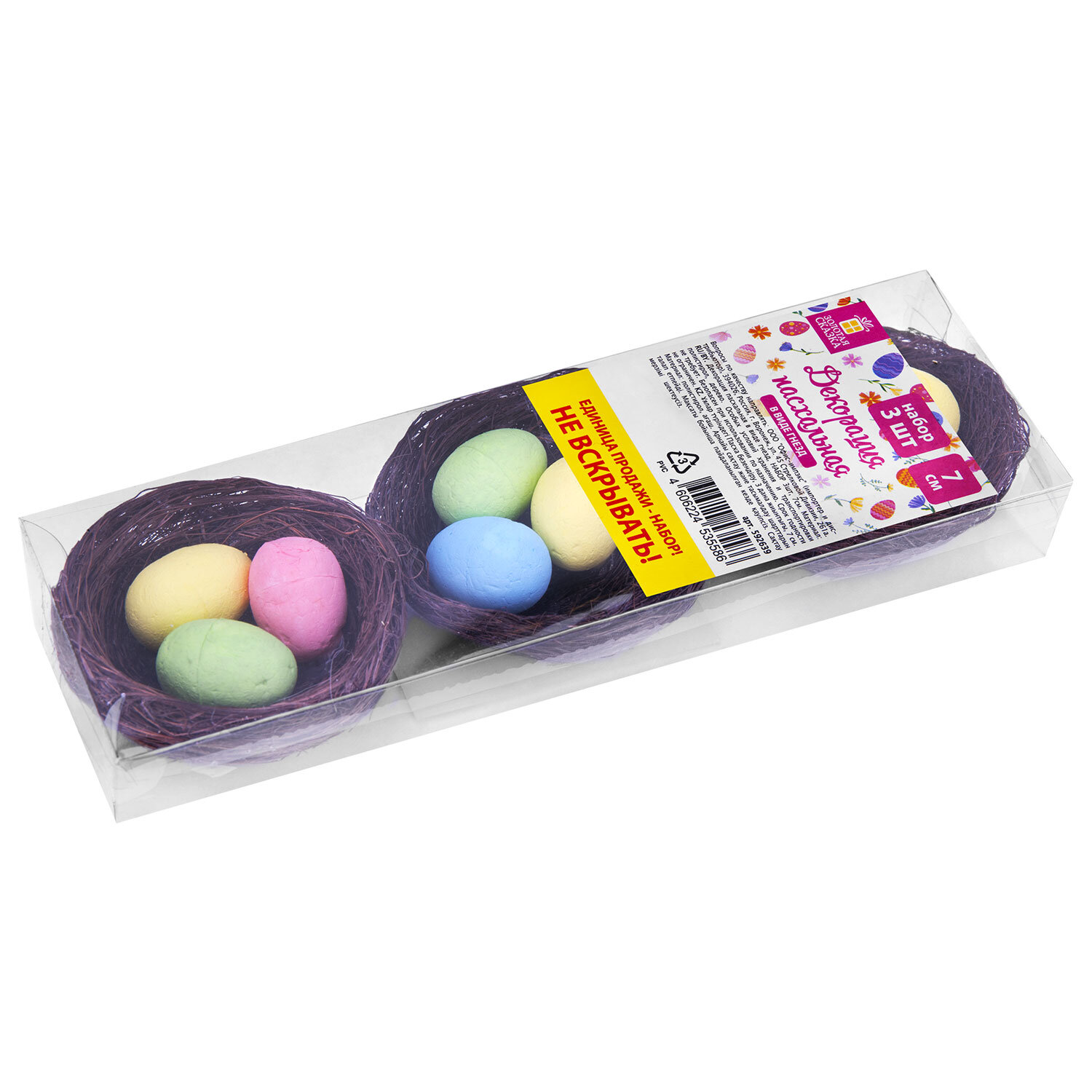 Декорация пасхальная 7 см "Гнездо", КОМПЛЕКТ 3 штуки, пластик, ЗОЛОТАЯ СКАЗКА Код товара: 592639 117,88 ₽ Купить Производитель:ЗОЛОТАЯ СКАЗКА Окунитесь в атмосферу тёплого, светлого праздника Пасхи с очаровательной декорацией "Гнездо" ЗОЛОТАЯ СКАЗКА. Комплект гнезд из 3 штук диаметром 7 см каждое с яичками внутри – идеальный выбор для тех, кто хочет создать тёплую, уютную атмосферу праздника, наполненную символами обновления и заботы. Идеально подходит для оформления праздничного стола, интерьера, подарка или выпечки. Упакованы в прозрачный ПВХ-бокс.Производство: КитайТип товара: пасхальная декорацияМатериал: полистирол, деревоРазмер: 7 смКоличество в комплекте: 3 шт.Цвет: ассортиДизайн: ГнездоУпаковка: ПВХ-боксВес: 33 грРазмер упаковки: 2.5 × 18.7 × 6.3 смОбъём: 0.0005 м3Промежуточная упаковка: 6 штТранспортная упаковка: 60 штШтрих-код: 4606224535586 Файлы Сертификат-1.jpg Сертификат-2.jpg