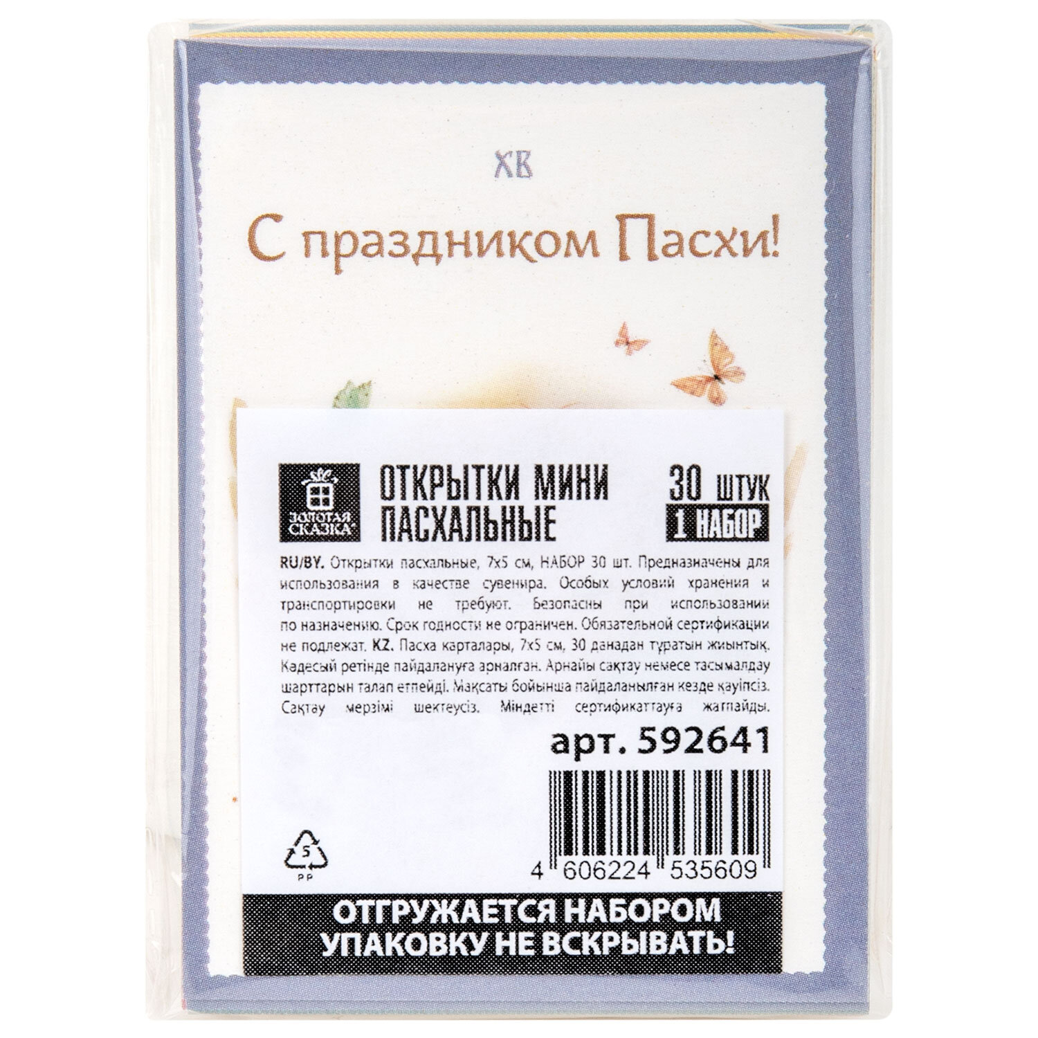 Открытки МИНИ пасхальные НАБОР 30 шт., 7х5 см, "Пасхальное чудо", картон, ЗОЛОТАЯ СКАЗКА Код товара: 592641 210,6 ₽ Купить Производитель:ЗОЛОТАЯ СКАЗКА Пасхальное настроение в каждой детали – с мини-открытками ЗОЛОТАЯ СКАЗКА, созданными, чтобы дарить тепло и улыбки! В наборе 30 открыток размером 7х5 см, изготовленных из плотного картона 250 г/м2 с глянцевой поверхностью. В наборе представлено 10 уникальных дизайнов: с пасхальными яйцами, цыплятами, кроликами, куличами, ангелочками, цветочными мотивами и нежными весенними узорами (по 3 штуки каждого дизайна). МИНИ формат идеален для того, чтобы положить в пакетик к куличу, прикрепить на упаковку, использовать как бирку или в качестве сувенира. А насыщенные краски и глянец придают открыткам праздничный блеск и делают их настоящим акцентом в любом оформлении.Производство: РоссияТип товара: открытка пасхальнаяРазмер: 7х5 смКоличество в комплекте: 30 шт.Дизайн: Пасхальное чудоУпаковка: пакетВес: 29 грРазмер упаковки: 1.3 × 7 × 4.9 смОбъём: 0.0001 м3Промежуточная упаковка: 160 штТранспортная упаковка: 160 штШтрих-код: 4606224535609 Файлы Сертификат-1.jpg Сертификат-2.jpg Сертификат-3.jpg Сертификат-4.jpg Сертификат-5.jpg Сертификат-6.jpg Сертификат-7.jpg Сертификат-8.jpg Сертификат-9.jpg Сертификат-10.jpg Сертификат-11.jpg Сертификат-12.jpg Сертификат-13.jpg Сертификат-14.jpg Сертификат-15.jpg Сертификат-16.jpg Сертификат-17.jpg Сертификат-18.jpg Сертификат-19.jpg Сертификат-20.jpg Сертификат-21.jpg Сертификат-22.jpg Сертификат-23.jpg Сертификат-24.jpg Сертификат-25.jpg Сертификат-26.jpg