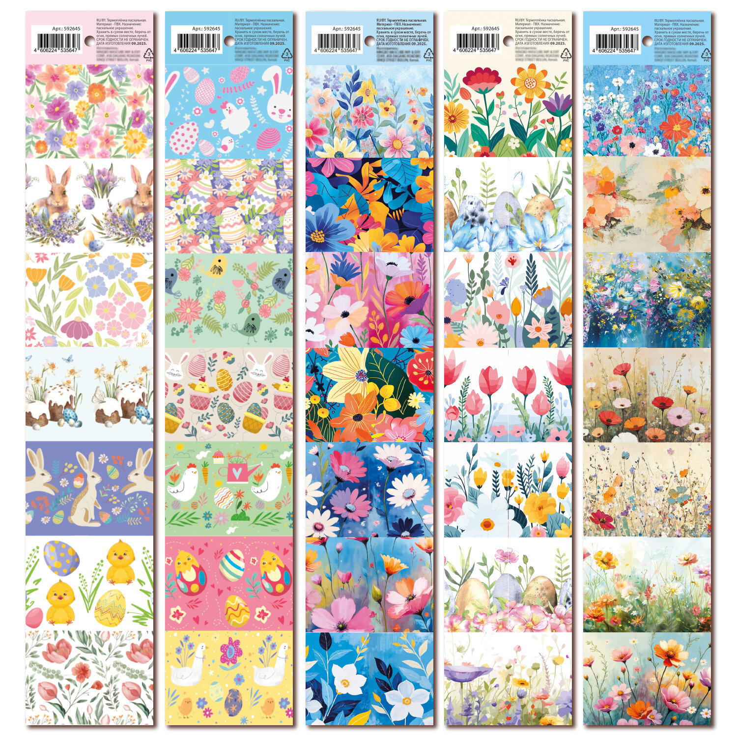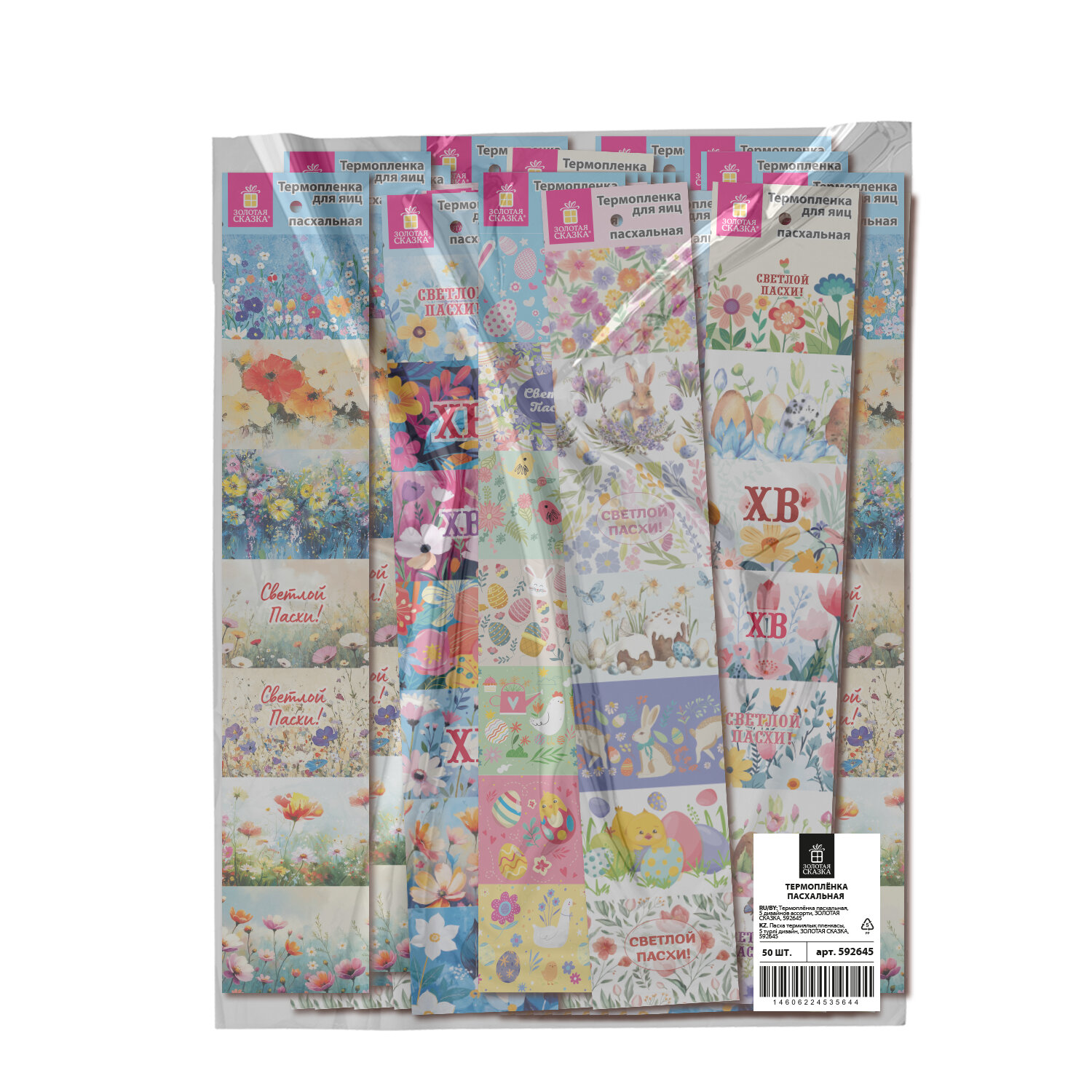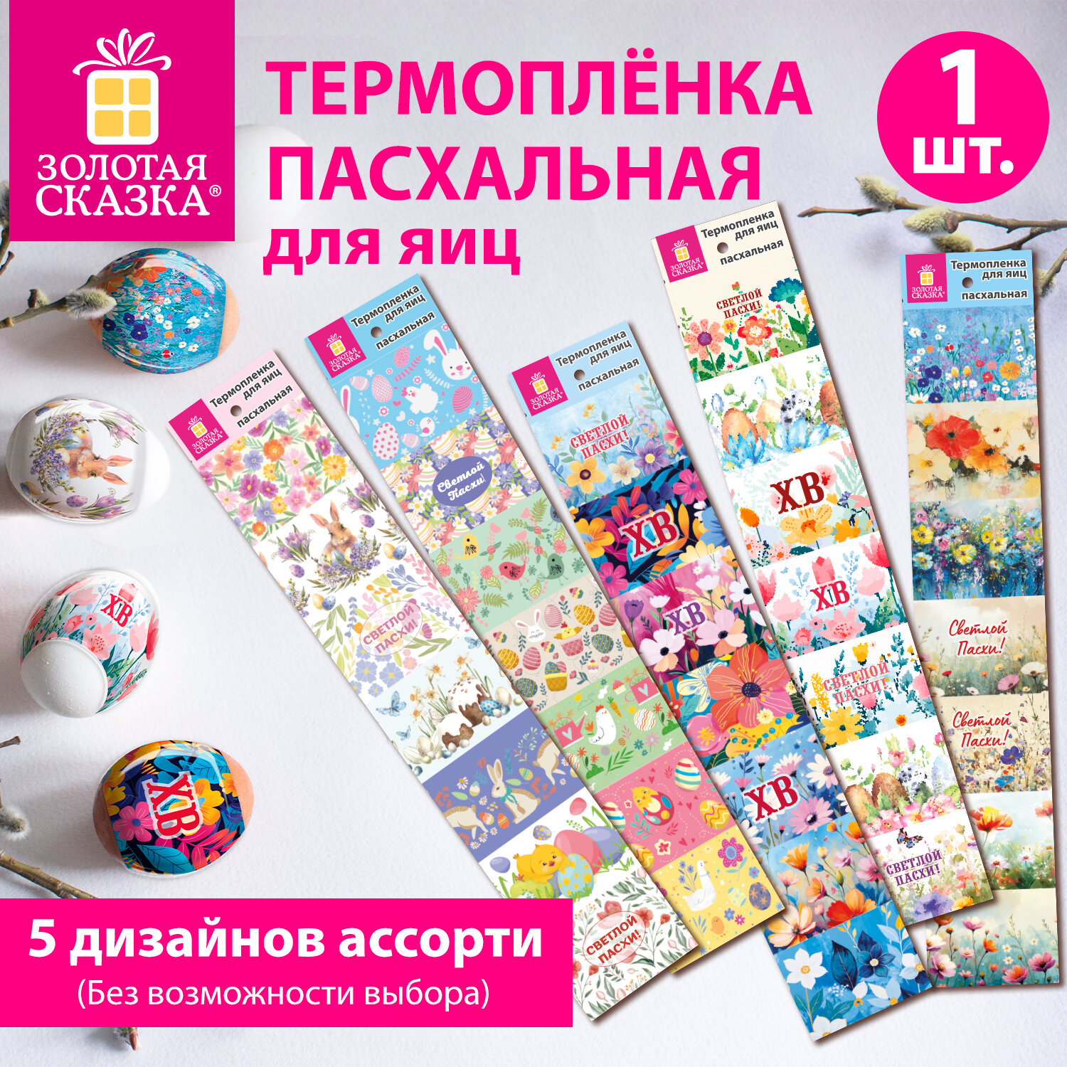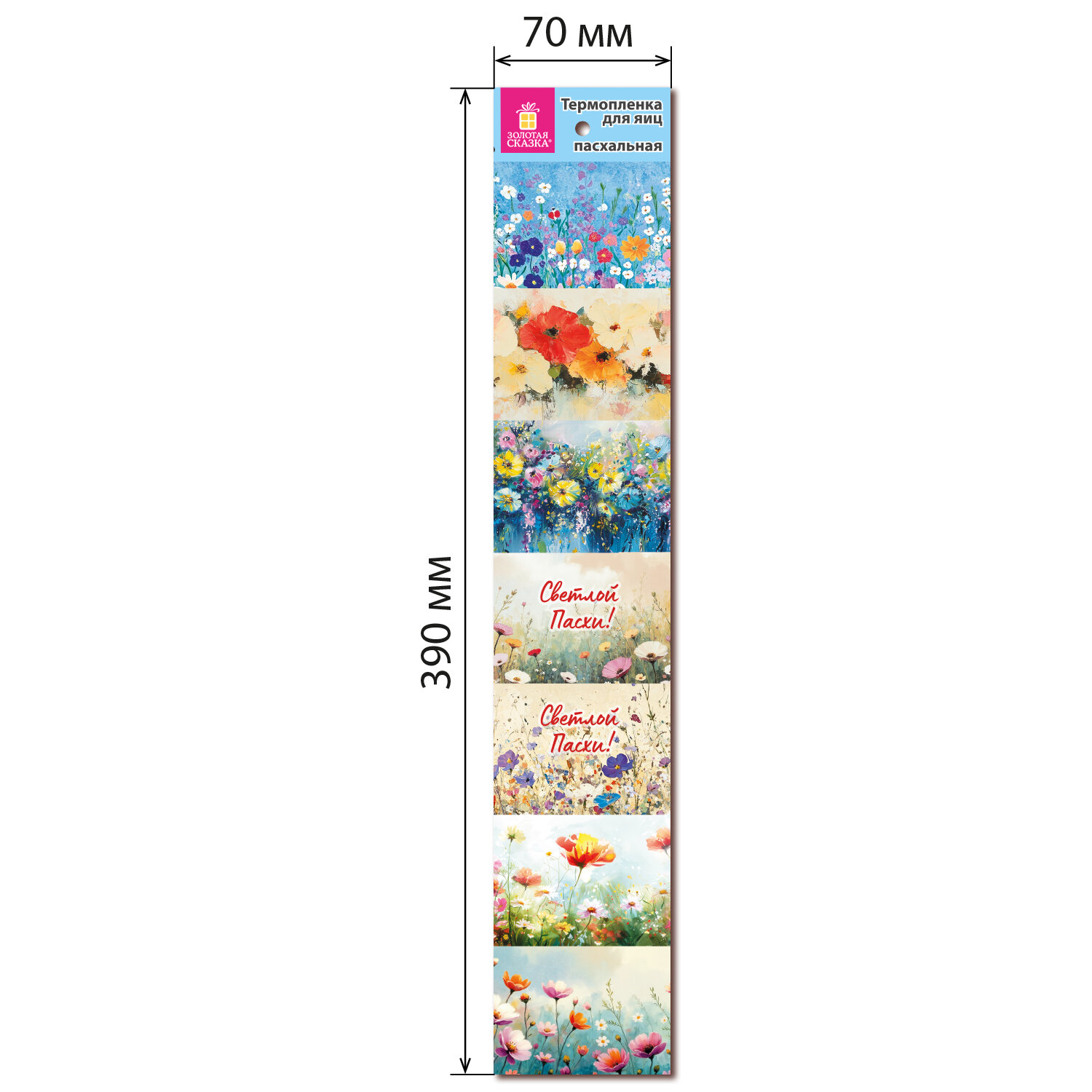 Термоплёнка для яиц пасхальная, 1 ЛЕНТА на 7 яиц, "Чудеса", ассорти, ЗОЛОТАЯ СКАЗКА Код товара: 592645 20,74 ₽ Купить Производитель:ЗОЛОТАЯ СКАЗКА Превратите обычное яйцо в настоящее пасхальное чудо – быстро, красиво и без лишних усилий с термопленкой пасхальной "Чудеса" ЗОЛОТАЯ СКАЗКА! Лента из ПВХ длиной 39 см рассчитана на 7 яиц. Поставляется в 5 дизайнах (без возможности выбора). Каждый дизайн уникален – цветочные мотивы, весенние узоры, символы праздника в ярких и нежных тонах. Просто разрежьте дизайны по линии, наденьте термопленку на сваренное охлаждённое яйцо, затем окуните его в кипяток на 5-10 секунд. Под воздействием тепла плёнка плотно обтянет яйцо, идеально принимая его форму. Готовые яйца станут украшением праздничного стола, отличным подарком или элементом декора для пасхальной корзины и фотозоны. В верхней части каждой ленты – круглое отверстие 6 мм.Производство: КитайТип товара: термоплёнка пасхальнаяМатериал: ПВХРазмер: 39х7 смКоличество в комплекте: 1 шт.Упаковка: -Вес: 2 грРазмер упаковки: 0.1 × 7 × 39 смПромежуточная упаковка: 50 штТранспортная упаковка: 3000 штШтрих-код: 4606224535647