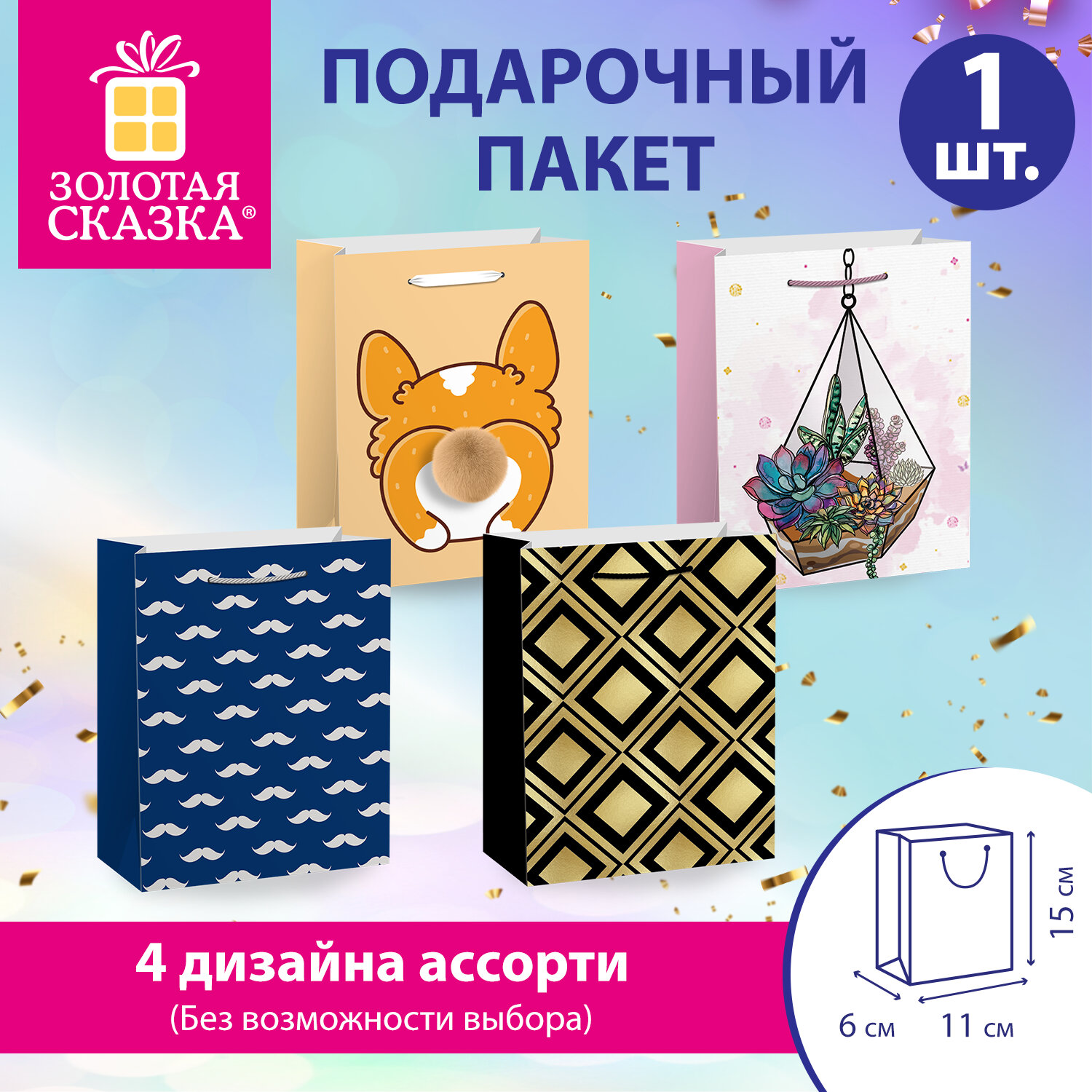 Пакет подарочный (1 штука) 11х6х15 см (S), "Collection Small", ассорти, глиттер, фольга, пушистый хвостик, ЗОЛОТАЯ СКАЗКА Код товара: 700803 34,81 ₽ Купить Производитель:ЗОЛОТАЯ СКАЗКА Подарочный пакет "Collection Small" ЗОЛОТАЯ СКАЗКА – отличное решение для упаковки любого презента: пакет позволит с легкостью и со вкусом оформить выбранный подарок. Изготовлен из мелованной бумаги с веревочными ручками из полипропилена. Подарочный пакет из мелованной бумаги – идеальное решение для вашего праздника! Благодаря плотности 210 г/м2 пакет надежно удерживает свою форму и защищает содержимое, сохраняя ваш подарок в идеальном состоянии. Яркие и оригинальные дизайны (4 варианта ассорти), дополненные изысканным тиснением фольгой и сверкающим глиттером, придадут вашему подарку особый шарм и праздничное настроение. А милый пушистый хвостик добавит упаковке игривости и сделает её по-настоящему запоминающейся. Оптимальный размер (11х6х15 см) идеально подходит для различных подарков – от маленького сюрприза до крупного презента. Удобные плетеные ручки обеспечивают комфортное ношение, добавляя элегантности и стиля вашему подарку.Производство: КитайФормат: вертикальныйВид пакета: штучныйДизайн: Collection SmallМатериал: мелованная бумагаКоличество в комплекте: 1 шт.С рисунком: даЦвет: ассортиРазмер пакета: S (11x6x15) смФормат размера пакета: SВес: 23 грРазмер упаковки: 0.5 × 14.5 × 11.2 смОбъём: 0.0001 м3Промежуточная упаковка: 12 штТранспортная упаковка: 288 штШтрих-код: 4606224498430 Файлы Сертификат-1.jpg Сертификат-2.jpg