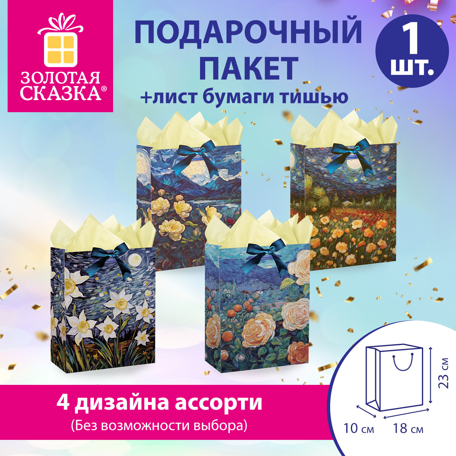 Пакет подарочный (1 штука) 18х10х23 см (M), "3D Flowers", ассорти, с тишью, ЗОЛОТАЯ СКАЗКА Код товара: 700809 50,02 ₽ Купить Производитель:ЗОЛОТАЯ СКАЗКА Подарочный пакет "3D Flowers" ЗОЛОТАЯ СКАЗКА -– отличное решение для упаковки любого презента: пакет позволит с легкостью и со вкусом оформить выбранный подарок. Изготовлен из мелованной бумаги с ленточными ручками из полиэстера. Подарочный пакет из мелованной бумаги – идеальное решение для вашего праздника! Благодаря плотности 210 г/м2 пакет надежно удерживает свою форму и защищает содержимое, сохраняя ваш подарок в идеальном состоянии. Яркие и оригинальные дизайны (4 варианта ассорти) придадут вашему подарку особый шарм и праздничное настроение. В комплекте – нежная бумага тишью, которая подчеркнёт значимость сюрприза и добавит упаковке изысканности. Оптимальный размер (18х10х23 см) идеально подходит для различных подарков – от маленького сюрприза до крупного презента. Удобные ленточные ручки обеспечивают комфортное ношение, добавляя элегантности и стиля вашему подарку.Производство: КитайФормат: вертикальныйВид пакета: штучныйДизайн: 3D FlowersМатериал: мелованная бумагаКоличество в комплекте: 1 шт.С рисунком: даЦвет: ассортиРазмер пакета: М (18х10х23) смФормат размера пакета: MВес: 54 грРазмер упаковки: 0.4 × 22.7 × 17.6 смОбъём: 0.0002 м3Промежуточная упаковка: 12 штТранспортная упаковка: 144 штШтрих-код: 4606224498492 Файлы Сертификат-1.jpg Сертификат-2.jpg