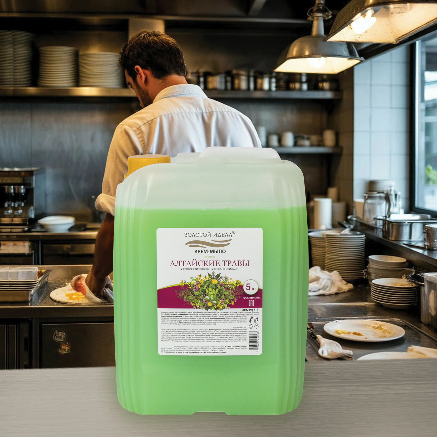 Мыло-крем 5 кг ЗОЛОТОЙ ИДЕАЛ, "Алтайские травы" Код товара: 606417 451,26 ₽ Купить Производитель:ЗОЛОТОЙ ИДЕАЛ Жидкое мыло ЗОЛОТОЙ ИДЕАЛ идеально подходит для использования в офисах, отелях, ресторанах и других общественных местах. Средство универсального применения отлично очищает и смягчает кожу, обеспечивает уход и увлажнение, обладает приятным ароматом. Подходит для всех типов кожи и не содержит формальдегида. Легко очищает, ухаживает и увлажняет, равномерно распределяется по коже и легко смывается водой, даря удовольствие всей семье. Благодаря входящим в состав смягчающим компонентам сохраняет защитные функции кожи, не вызывая сухости и раздражения. Объем - 5 л. Способ применения: небольшое количество мыла нанести на влажную кожу, взбить пену и смыть её водой. Меры предосторожности: Использовать только по назначению! Хранить в недоступном для детей месте. При попадании мыла в глаза немедленно промыть их чистой водой. Соответствует ГОСТ 31696-2012. Срок годности: 24 месяца. Состав: Aqua, Sodium Chloride, Sodium Laureth Sulfate, Cocamide DEA, Styrene/Acrylates Copolymer, Parfum, DMDM Hydantoin, Methylchloroisothiazolinone, Methylisothiazolinone, C.I. 19140, C.I. 42090.Производство: РоссияОбъем / Вес: 5000 мл/гМыло-крем: даПодходящий тип кожи: для всех типовЭффект от использования: очищение, увлажнениеСерия: SOAPОтдушка: травыСбалансированный уровень рН: даТип дозирования: нетВид упаковки: канистраЦвет: зелёныйСрок годности: 24 месРазмер упаковки: 25.1 × 18.6 × 14.4 смОбъём: 0.0077 м3Промежуточная упаковка: 4 штТранспортная упаковка: 4 штШтрих-код: 4606224259505 Файлы Сертификат-1.jpg Сертификат-2.jpg