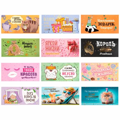 Конверты для денег Популярное Новинки По размеру скидки Дешевле Дороже По названию А-Я По названию Я-А Код: 113747Конверт для денег "ТЕБЕ НА РАДОСТЬ!", Авокадо, 166х82 мм, выборочный лак, ЗОЛОТАЯ СКАЗКА 46,15 ₽Купить Код: 113748Конверт для денег "HAPPY BIRTHDAY!", Цветы, 166х82 мм, выборочный лак, ЗОЛОТАЯ СКАЗКА 46,15 ₽Купить Код: 113749Конверт для денег "ПОЗДРАВЛЯЕМ!", Деловой стиль, 166х82 мм, выборочный лак, ЗОЛОТАЯ СКАЗКА 34,61 ₽Купить Код: 113750Конверт для денег "ЛУЧШЕМУ ИЗ ЛУЧШИХ", Бабочка, 166х82 мм, выборочный лак, ЗОЛОТАЯ СКАЗКА 46,15 ₽Купить Код: 113751Конверт для денег "HAPPY BIRTHDAY TO YOU!", Шары, 166х82 мм, выборочный лак, ЗОЛОТАЯ СКАЗКА 46,15 ₽Купить Код: 113752Конверт для денег "С ДНЕМ РОЖДЕНИЯ ТЕБЯ", Фиолетовый, 166х82 мм, блестки, ЗОЛОТАЯ СКАЗКА 46,13 ₽Купить Код: 113753Конверт для денег "ПОЗДРАВЛЯЮ ОТ ВСЕЙ ДУШИ!", Цветы, 166х82 мм, блестки, ЗОЛОТАЯ СКАЗКА 46,13 ₽Купить Код: 113754Конверт для денег "С ДНЁМ СВАДЬБЫ", Just married, 166х82 мм, блестки, ЗОЛОТАЯ СКАЗКА 46,13 ₽Купить Код: 113755Конверт для денег "САМОЙ КРАСИВОЙ ПАРЕ", 166х82 мм, блестки, ЗОЛОТАЯ СКАЗКА 46,13 ₽Купить Код: 113756Конверт для денег "НА СЛАДКУЮ ЖИЗНЬ!", Десерт, 166х82 мм, блестки, ЗОЛОТАЯ СКАЗКА 46,13 ₽Купить Код: 113757Конверт для денег "С ДНЁМ РОЖДЕНИЯ", Розы, 166х82 мм, блестки, ЗОЛОТАЯ СКАЗКА 46,13 ₽Купить Код: 113758Конверт для денег "ДЛЯ САМОЙ КРАСИВОЙ", Блеск, 166х82 мм, фольга, ЗОЛОТАЯ СКАЗКА 46,17 ₽Купить Код: 113759Конверт для денег "BEST MAN IN THE WORLD", Мужской стиль, 166х82 мм, фольга, ЗОЛОТАЯ СКАЗКА 46,17 ₽Купить Код: 113760Конверт для денег "ТЕБЕ ОТ ВСЕХ НАС", Орнамент, 166х82 мм, фольга, ЗОЛОТАЯ СКАЗКА 46,17 ₽Купить Код: 113761Конверт для денег "МЕЧТЫ СБЫВАЮТСЯ!", Девушка с букетом, 166х82 мм, фольга, ЗОЛОТАЯ СКАЗКА 46,17 ₽Купить Код: 113762Конверт для денег "С ДНЁМ РОЖДЕНИЯ!", Панда, розовый, 166х82 мм, фольга, ЗОЛОТАЯ СКАЗКА 46,17 ₽Купить Код: 113763Конверт для денег "С ДНЁМ РОЖДЕНИЯ!", Панда, голубой, 166х82 мм, фольга, ЗОЛОТАЯ СКАЗКА 46,17 ₽Купить Код: 113746Конверт для денег "ДОЛГО ДОХОДИТ, ЧТО ДАРИТЬ...", 166х82 мм, выборочный лак, ЗОЛОТАЯ СКАЗКА 46,15 ₽Купить Код: 116360Конверт для денег "Классика" 166х82 мм, глиттер, фольга, ЗОЛОТАЯ СКАЗКА, 12 дизайнов 39,25 ₽Купить Код: 116361Конверт для денег "Креатифф" 166х82 мм, глиттер, фольга ЗОЛОТАЯ СКАЗКА, 12 дизайнов 39,25 ₽Купить Ничего не найдено Показать ещё Показано 20 из 21 товаров.