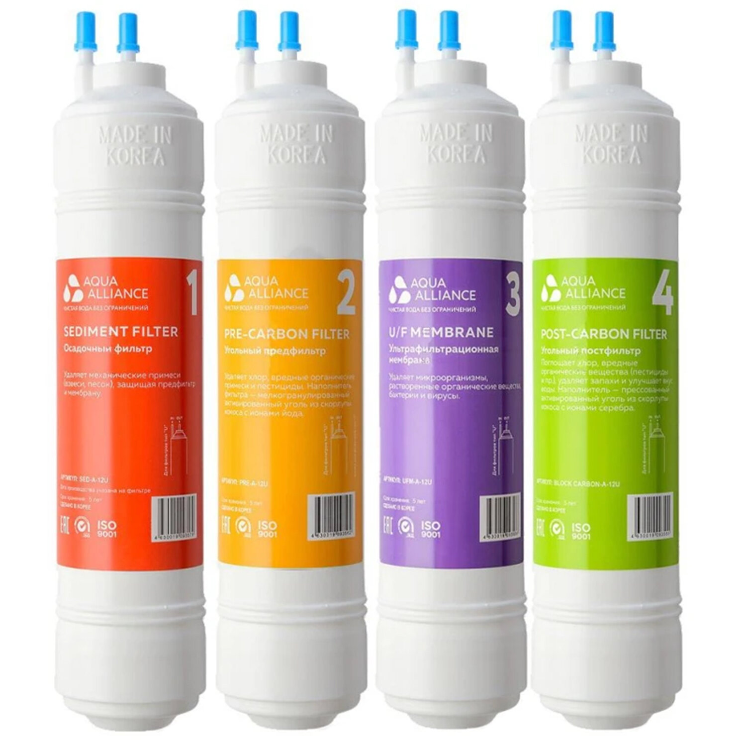 Фильтры для пурифайеров 12 дюймов, ресурс 10000 л, КОМПЛЕКТ 4 шт., AQUA ALLIANCE A-12U Код товара: 458663 6 107,73 ₽ Купить Производитель:AEL Фильтры для пурифайеров обеспечивают четырёхступенчатую ультрафильтрацию воды. Они удаляют механические примеси, хлор, хлорорганические соединения, вирусы, микробы и другие загрязнения. Комплект фильтров AQUA ALLIANCE UF 12" подходит для большинства пурифайеров (кулеров без бутылей/проточных кулеров) с ультрафильтрационной (UF) системой очистки воды: A.E.L., Ecotronic и пр. В комплекте идет 4 картриджа: Картридж AQUA ALLIANCE SED-A-12U (12" U-тип, седиментный); Картридж AQUA ALLIANCE PRE-A-12U (12" U-тип, прекарбон); UF-мембрана AQUA ALLIANCE UFM-A-12U (12" U-тип, UF-мембрана); Картридж AQUA ALLIANCE BLOCK CARBON-A-12U (12" U-тип, блок-карбон). Рекомендованный срок замены картриджей – не реже 1 раза в 6 месяцев. Размер – 12 дюймов. Производство – Южная Корея. Производитель оставляет за собой право без предварительного уведомления вносить изменения в технические характеристики, комплектацию и конструкцию, не ухудшающие эксплуатационные характеристики изделия.Производство: Корея, РеспубликаТип фильтра: для пурифайеровСерия: A-12UВид фильтрации: УльтрафильтрацияКоличество в комплекте: 4 шт.Размер фильтра: 12 дюймовРесурс (зависит от качества исходной воды): 10000 лМатериал корпуса: пластикЦвет корпуса: белыйВес: 1,69 кгРазмер упаковки: 19.6 × 31.8 × 25.3 смОбъём: 0.0158 м3Промежуточная упаковка: 1 штТранспортная упаковка: 1 штШтрих-код: 4630019093760 Сертификат-1.jpg Сертификат-2.jpg Сертификат-3.jpg