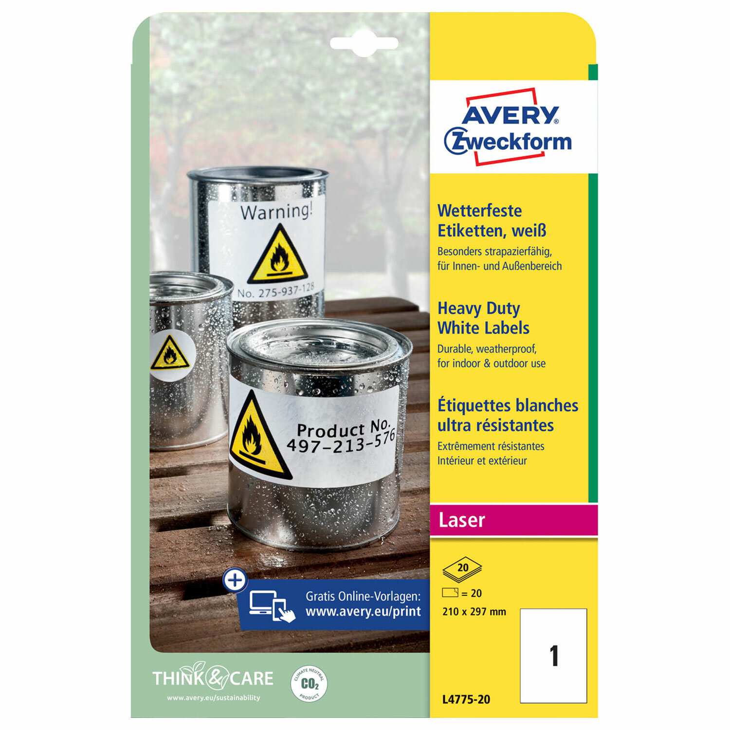 Этикетка самоклеящаяся ВСЕПОГОДНАЯ 210x297 мм, 1 этикетка, полиэстер, белая, 20 листов, Avery Zweckform Код товара: 115388 5 252,93 ₽ Купить Производитель:AVERY ZWECKFORM Самоклеящиеся этикетки Avery позволят быстро и качественно подготовить адресные наклейки, регистрационные номера, аннотации при помощи лазерного принтера. Предназначены для надежной маркировки как внутри помещений, так и на улице. Прочные белые водостойкие этикетки из полиэстера белого цвета плотностью 75 г/м2. Этикетки обладают особой устойчивостью к воздействию загрязняющих веществ, влаги, перепадам температуры. Совместимы с лазерными принтерами. Упаковка содержит 20 листов формата А4, на каждом листе - одна этикетка размером 210х297 мм. Благодаря сильному клеевому составу этикетки предназначены для надежной и прочной маркировки на улице или в складских помещениях. Они масло- и грязестойкие, термостойкие, выдерживают перепады температур (от -20°C до +80°C) и водонепроницаемые. Идеальный вариант для инвентаризации в складских помещениях, маркировки коробок, ящиков, складских вещей. Благодаря бесплатному программному обеспечению и шаблонам Avery Zweckform совсем не нужно тратить время на дизайн и печать этикеток и самоклеящейся бумаги А4. Производитель предлагает большой выбор дизайнов и готовых шаблонов для печати. Просто введите номер артикула с упаковки, выберите нужный дизайн, создайте свою этикетку и распечатайте! Готово!Производство: ГерманияКоличество этикеток на листе: 1 шт.Размер этикетки (ДхШ): 210х297 ммФорма: прямоугольнаяКоличество листов в упаковке: 20 шт.Технология печати: для лазерной печатиВсепогодная: даПлотность: 75 г/м2Тип поверхности: матоваяЦвет этикетки: белыйШаблон для скачивания: даУпаковка с европодвесом: даВес: 340 грРазмер упаковки: 0.9 × 32.5 × 21.8 смОбъём: 0.0008 м3Промежуточная упаковка: 30 штТранспортная упаковка: 30 штШтрих-код: 4004182047750 Файлы Приложение-1.doc Сертификат-1.jpg Сертификат-2.jpg Сертификат-3.jpg Сертификат-4.jpg Сертификат-5.jpg Сертификат-6.jpg Сертификат-7.jpg Сертификат-8.jpg Сертификат-9.jpg Сертификат-10.jpg Сертификат-11.jpg Сертификат-12.jpg Сертификат-13.jpg Сертификат-14.jpg Сертификат-15.jpg Сертификат-16.jpg Сертификат-17.jpg Сертификат-18.jpg Сертификат-19.jpg Сертификат-20.jpg Сертификат-21.jpg Сертификат-22.jpg Сертификат-23.jpg Сертификат-24.jpg Сертификат-25.jpg Сертификат-26.jpg