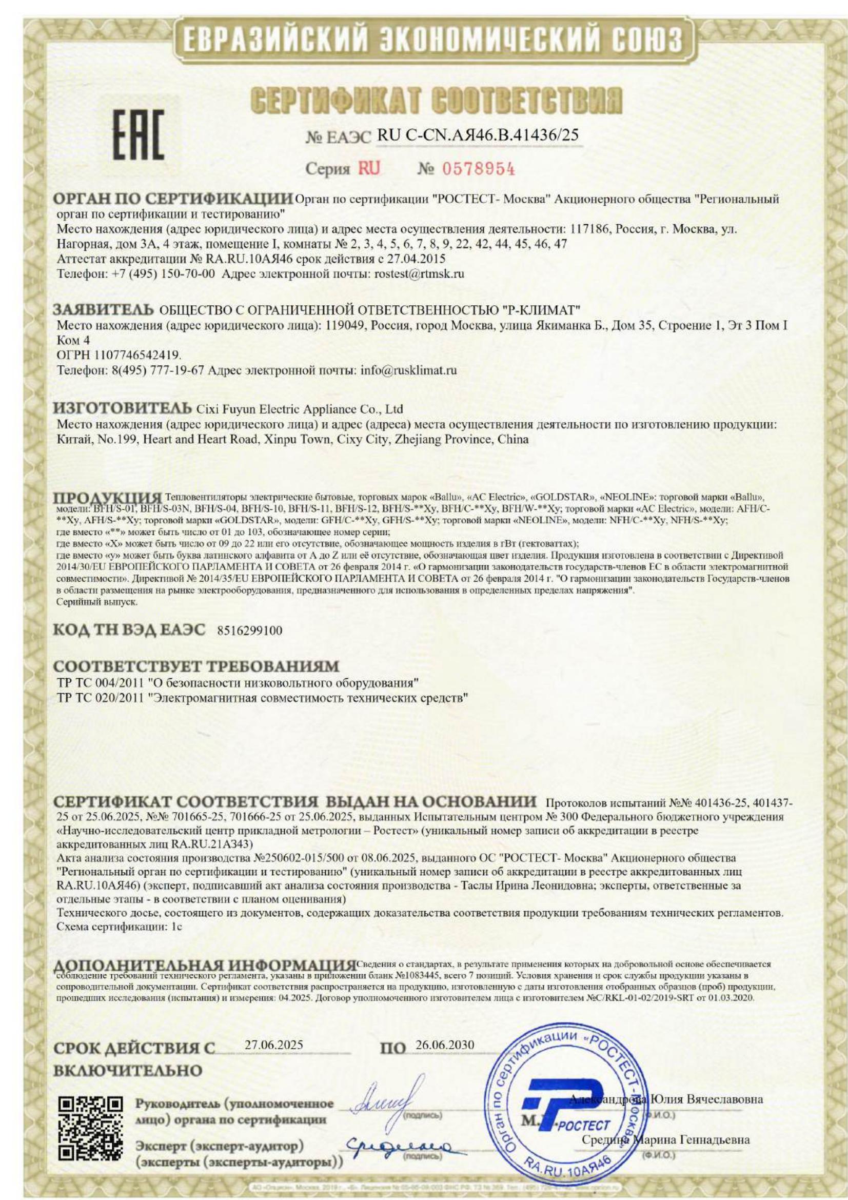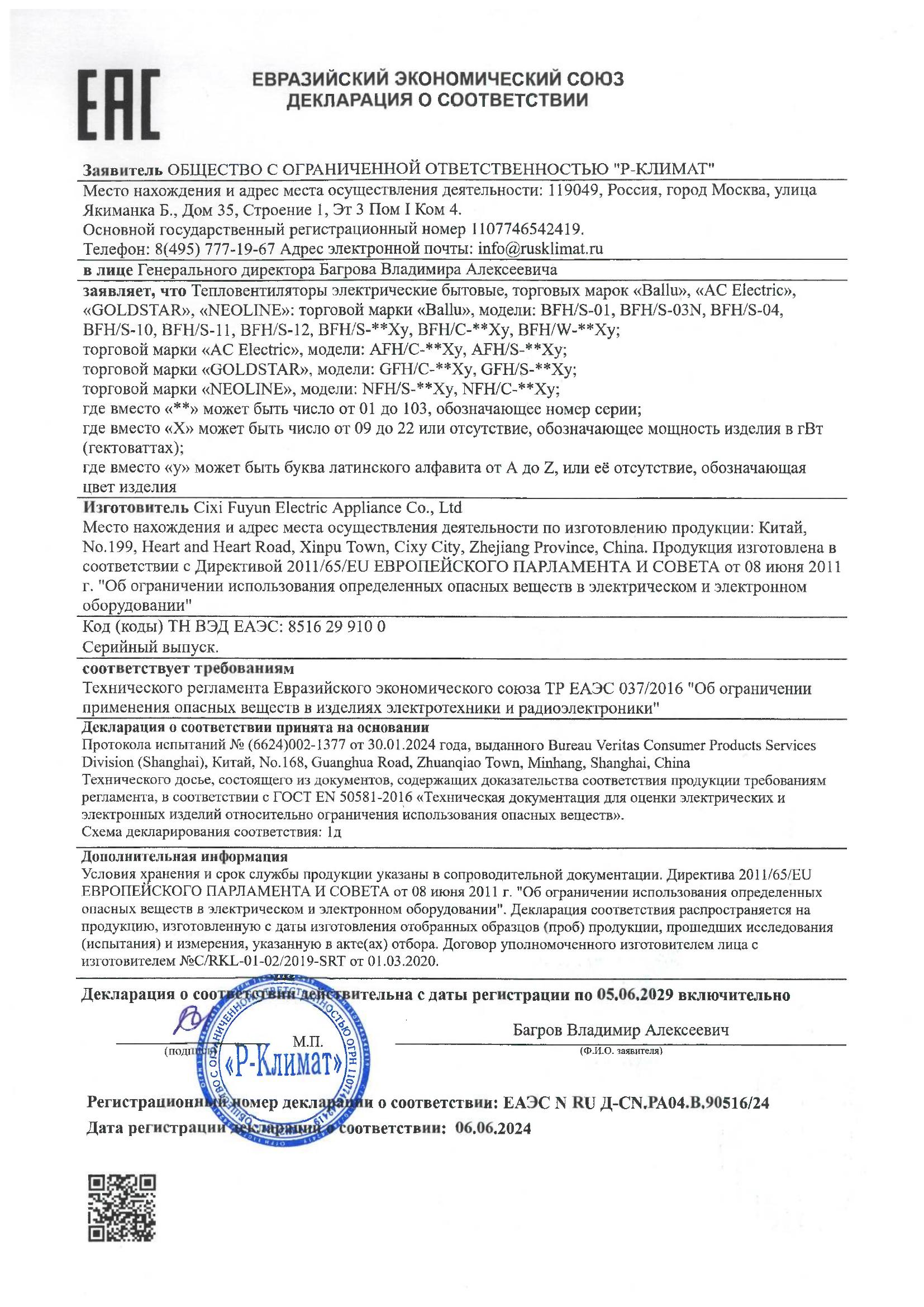 Мини-тепловентилятор BALLU BFH/S-03N, 900 Вт, 1 режим работы, белый Код товара: 457463 1 391,76 ₽ Купить Производитель:BALLU Мини-тепловентилятор BALLU BFH/S-03N – идеальное решение для дополнительного обогрева небольших помещений! Благодаря компактным размерам и спиральному нагревательному элементу мощностью 900 Вт этот прибор быстро и эффективно согревает воздух в комнате. Устройство подойдет для использования во многих помещениях и создаст комфортную температуру. Прибор эффективен при обогреве помещений площадью до 14 м2. Управление осуществляется с помощью удобной ручки включения. Тепловентилятор оснащен защитой от перегрева. Прибор автоматически отключится в случае перегрева, возникающего, например, при полном или частичном перекрытии решетки тепловентилятора. Система защиты при опрокидывании автоматически прекратит работу прибора в случае, если он упадет. Использование тепловентилятора максимально комфортно благодаря пониженному уровню шума в процессе работы. Благодаря стильному дизайну и очень компактным размерам (высота всего 19,5 см) прибор станет удачным дополнением интерьера и легко разместится даже в небольшом помещении. Производитель оставляет за собой право без предварительного уведомления вносить изменения в технические характеристики, комплектацию и конструкцию, не ухудшающие эксплуатационные характеристики изделия.Производство: КитайМощность: 900 ВтТип нагревательного элемента: спиральныйКоличество режимов работы: 1Рекомендованная площадь обогрева: 14 м2Автоматическое отключение: даДлина шнура: 1.2 мВысота: 195 ммШирина: 115 ммГлубина: 105 ммОсновной цвет: белыйДополнительный цвет: серыйВес (без упаковки): 0.48 кгВес: 600 грРазмер упаковки: 20.3 × 12.5 × 12.1 смОбъём: 0.0035 м3Промежуточная упаковка: 20 штТранспортная упаковка: 20 штШтрих-код: 4610021227285 Файлы Приложение-1.pdf Сертификат-1.jpg Сертификат-2.jpg Сертификат-3.jpg Сертификат-4.jpg Сертификат-5.jpg