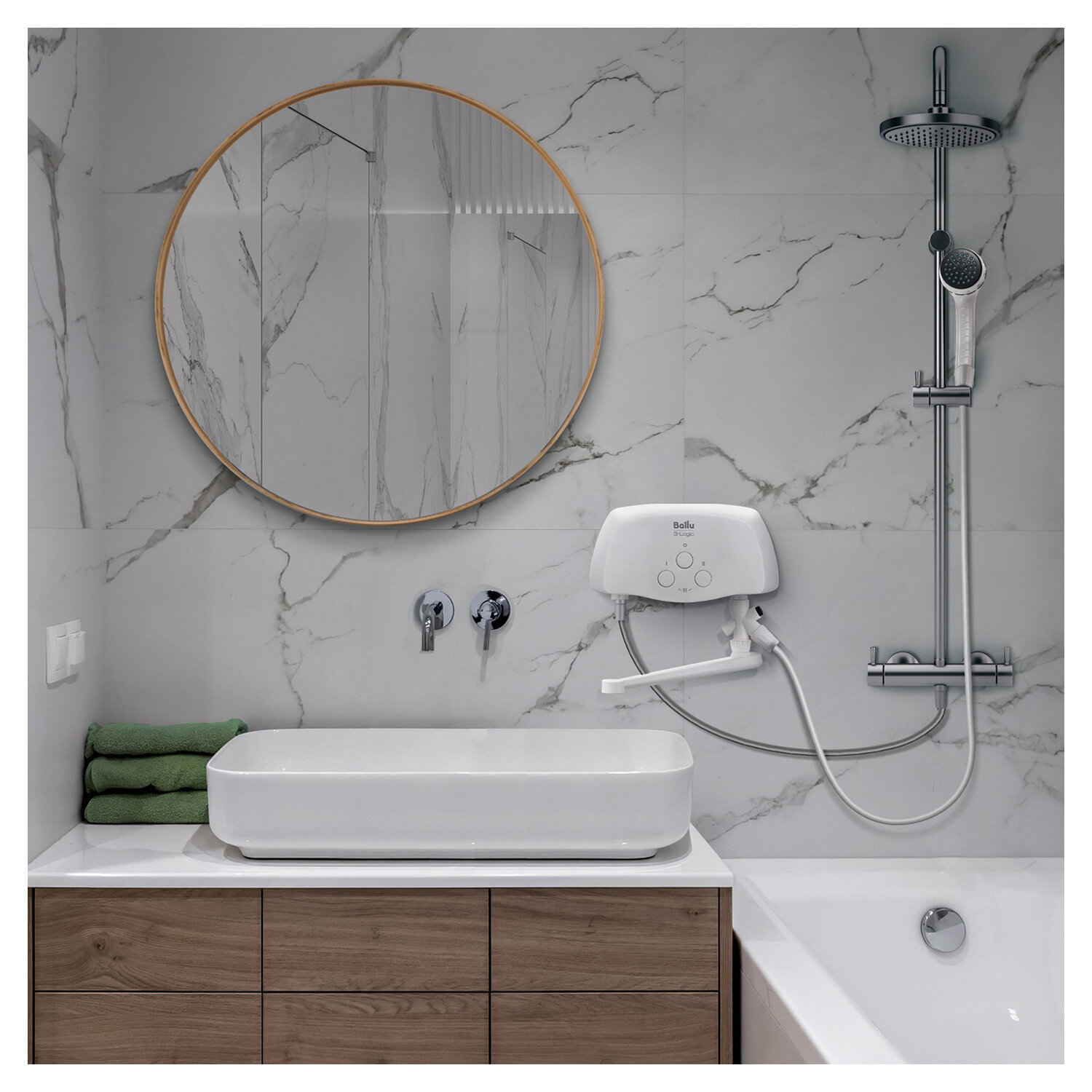 Водонагреватель проточный электрический BALLU 3-Logic TS, ненапорный 6,5 кВт 3,7л/м к Код товара: 458998 3 563,32 ₽ Купить Производитель:BALLU BALLU 3-Logic TS — ваш надёжный источник горячей воды в любое время суток! Стильный белый дизайн, компактные размеры и простота использования делают его незаметным, но незаменимым помощником в быту. Получайте горячую воду мгновенно с проточным водонагревателем BALLU 3-Logic TS — компактным и безопасным решением для душа, кухни или раковины. Этот настенный электрический нагреватель с мощностью 6,5 кВт обеспечивает подачу воды со скоростью 3,7 л/мин при температуре до 60°C, избавляя от ожидания и переплат за накопительные системы. Благодаря миниатюрным размерам (27 х 13,5 х 10 см) и белому цвету, он легко впишется в интерьер даже самой маленькой ванной комнаты, не нарушая эстетики пространства. Модель оснащена тремя режимами мощности, что позволяет точно регулировать температуру и экономить до 30% электроэнергии в зависимости от потребностей. Медный нагревательный элемент обеспечивает быстрый и равномерный нагрев, а гидравлическая система управления делает использование интуитивно понятным — достаточно открыть кран. Два уровня защиты: автоматическое отключение при перегреве и сухом включении предотвращают аварийные ситуации и продлевают срок службы прибора. Класс пылевлагозащиты IPX4 гарантирует безопасность в условиях повышенной влажности. Вертикальная настенная установка занимает минимум места, а в комплекте идут душ и кран, что упрощает монтаж для одной водоразборной точки. Рабочее давление — от 0,7 до 6 бар, подключение — нижнее (1/2 дюйма). Для подключения требуется сетевой кабель с вилкой, сечением 4 мм2 или больше, в комплектацию сетевой кабель не входит, его необходимо докупать отдельно, питание — от сети 220–240 В. Производитель оставляет за собой право без предварительного уведомления вносить изменения в технические характеристики, комплектацию и конструкцию, не ухудшающие эксплуатационные характеристики изделия.Производство: КитайОбъем бака: 0 лВид установки (крепления): настенноеМощность: 6.5 кВтВариант размещения: вертикальноеТип подключения: нижнееТип нагревательного элемента: ТЭНЗащита от перегрева: даЗащита от включения без воды: даКоличество режимов нагрева: 3Макс. температура воды: 60 °СМин. температура воды: 0 °СВремя нагрева воды от 10°С до 75°С: 0 мин.Материал внутреннего бака: 0Материал внешнего корпуса: пластикСерия: 3-LogicЦвет: белыйВысота: 13.5 смШирина: 27 смГлубина: 10 смВес (без упаковки): 1.02 кгВес: 1,43 кгРазмер упаковки: 20.2 × 29.1 × 11.7 смОбъём: 0.0069 м3Промежуточная упаковка: 1 штТранспортная упаковка: 1 штШтрих-код: 4660294157222 Файлы Приложение-1.pdf