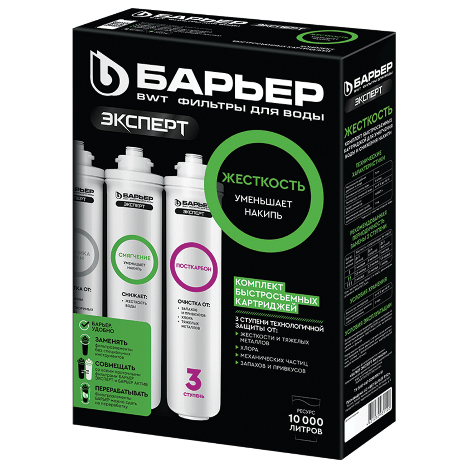 Картриджи сменные БАРЬЕР "Эксперт Жесткость", для холодной воды, 3 ступени, ресурс 10000 л, комплект 3 шт. Код товара: 605402 2 806,75 ₽ Купить Производитель:БАРЬЕР Сменные картриджи для фильтров БАРЬЕР "Эксперт Жесткость" обеспечивают защиту от жесткости и тяжелых металлов, механических частиц, хлора, а также запахов и привкусов. Фильтроэлементы необходимо использовать только в системах холодного водоснабжения. Сменные быстросъемные картриджи для проточного фильтра БАРЬЕР ЭКСПЕРТ. Комплект сменных картриджей БАРЬЕР ЭКСПЕРТ Жесткость позволяет забыть о накипи в чайнике, очищает воду от тяжелых металлов, хлора, посторонних привкусов и запахов. Производительность – 2 л/мин, ресурс – 10 000 литров. Вода проходит три этапа очистки: 1 ступень – картридж "Механика" для фильтра БАРЬЕР ЭКСПЕРТ. Удаляет любые механические примеси более 5 мкм — песок, пластик, ржавчину. 2 ступень – картридж "Смягчение" для фильтра БАРЬЕР ЭКСПЕРТ. Предотвращает образование накипи: эффективно снижает карбонатную жесткость, из-за которой образуется осадок в чайнике. Рекомендованная частота замены картриджа — не реже 1 раза в 6 месяцев. 3 ступень – картридж "ПостКарбон" для фильтра БАРЬЕР ЭКСПЕРТ. Осуществляет финишную очистку и кондиционирование, устраняет хлор, тяжелые металлы и неприятные привкусы. Технология OneTouch – быстрая замена картриджей без специальных знаний, инструментов или ключей. 100% защита от протечек, все соединения выполнены с использованием Push-in фитингов. Технология SmartLock предотвращает срыв картриджа под давлением. Картриджи подходят к фильтрам линеек БАРЬЕР ЭКСПЕРТ, БАРЬЕР ЭКСПЕРТ СЛИМ, БАРЬЕР АКТИВ, БАРЬЕР ОНИКС. Не требуют для замены специальных ключей, инструментов или навыков.Производство: РоссияТип модуля: картриджСерия: ЭкспертТип воды: жесткийСпециализация: умягчение водыСредний ресурс кассеты: 10000 лКоличество в комплекте: 3 шт.Производительность: 2 л/минСрок годности: 36 месВес: 2,13 кгРазмер упаковки: 8.1 × 33.8 × 23.2 смОбъём: 0.0073 м3Промежуточная упаковка: 5 штТранспортная упаковка: 5 штШтрих-код: 4601032931100 Файлы Сертификат-1.jpg Сертификат-2.jpg Сертификат-3.jpg Сертификат-4.jpg Сертификат-5.jpg Сертификат-6.jpg