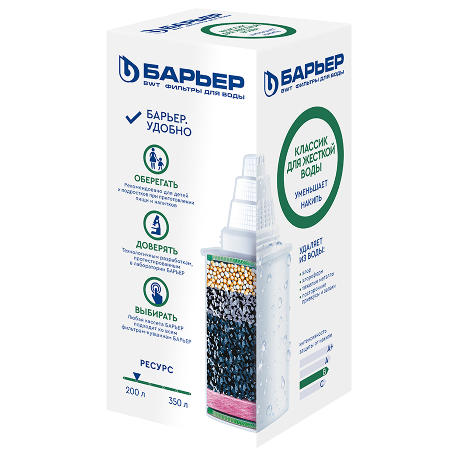 Сменная кассета БАРЬЕР "Классик для жесткой воды", для жесткой воды, ресурс 200 литров Код товара: 702814 291,2 ₽ Купить Производитель:БАРЬЕР Сменная кассета БАРЬЕР "Классик для жёсткой воды" – это умное решение для городских квартир, где водопроводная вода оставляет белый налёт на чайнике, снижает эффективность бытовой техники и придаёт напиткам неприятный привкус! Эта кассета не только обеспечивает базовую очистку, но и мягко умягчает воду, снижая содержание солей кальция и магния – главных причин образования накипи. В основе – специальная смесь ионообменных смол, которая одновременно уменьшает жёсткость, удаляет растворённое железо и защищает от тяжёлых металлов. Дополнительно, кокосовый активированный уголь, обработанный серебром, эффективно устраняет хлор, хлороформ, посторонние запахи и привкусы, а также подавляет рост бактерий внутри фильтра. Благодаря герметичному резьбовому соединению вы можете быть уверены: неочищенная вода никогда не попадёт в ваш стакан. Ресурс кассеты – до 200 литров (примерно 45 дней для средней семьи), что делает её практичной и экономичной. Как и все кассеты БАРЬЕР, она универсальна: подходит ко всем фильтрам-кувшинам бренда без исключений. Предприятие-изготовитель оставляет за собой право вносить изменения в конструкцию, не влияющие на правила и условия эксплуатации, без отражения в документации. Представленные ниже характеристики носят справочный характер.Производство: РоссияТип модуля: кассетаСерия: Классик для жесткой водыТип воды: жесткийСпециализация: умягчение и очистка водыСредний ресурс кассеты: 200 лКоличество в комплекте: 1 шт.Производительность: 0.3 л/минСрок годности: 36 месВес: 178 грРазмер упаковки: 6.5 × 14.5 × 6.5 смОбъём: 0.0007 м3Промежуточная упаковка: 12 штТранспортная упаковка: 12 штШтрих-код: 4601032993696 Файлы Сертификат-1.jpg Сертификат-2.jpg Сертификат-3.jpg Сертификат-4.jpg Сертификат-5.jpg