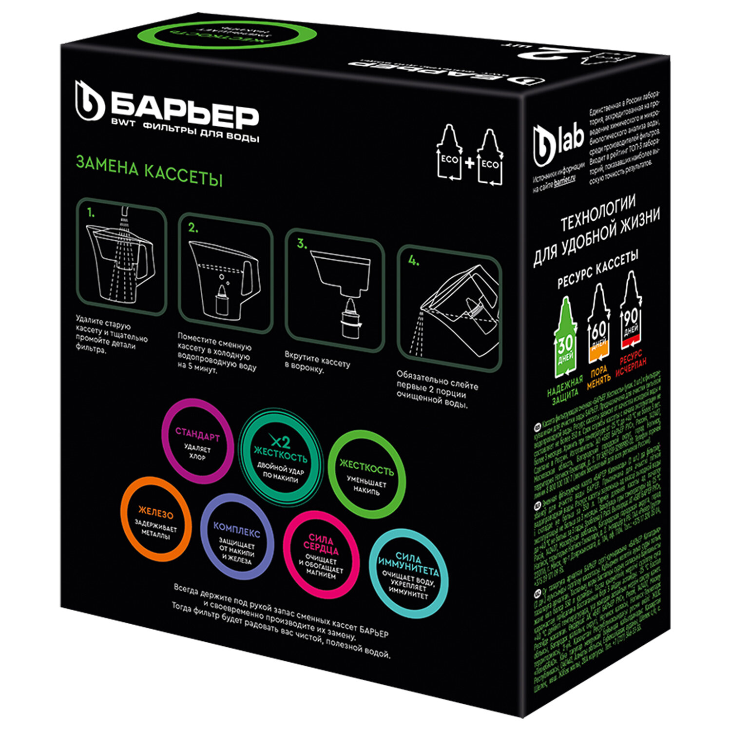 Сменная кассета БАРЬЕР "Жесткость", для жесткой воды, КОМПЛЕКТ 2 шт., ресурс 2х350 л Код товара: 702820 731,2 ₽ Купить Производитель:БАРЬЕР Комплект из двух кассет БАРЬЕР "Жесткость" – это практичное решение для домов и квартир с жёсткой водопроводной водой, где белый налёт в чайнике, известковый осадок на кранах и снижение срока службы бытовой техники становятся повседневной проблемой. Каждая кассета в наборе эффективно уменьшает содержание солей кальция и магния, которые вызывают жёсткость, тем самым предотвращая образование накипи в кофемашинах, утюгах, чайниках и других приборах. При этом вода проходит многоступенчатую очистку: хлор и его соединения, тяжёлые металлы, пестициды, нефтепродукты, органические загрязнители и механические примеси надёжно удаляются благодаря комбинации ионообменных смол и активированного угля. В основе конструкции – герметичное резьбовое соединение, исключающее подмешивание неочищенной воды, и высококачественный пищевой пластик, безопасный для контакта с питьевой водой. Скорость фильтрации составляет 300 мл/мин, а ресурс каждой кассеты – до 350 литров (или до 3 месяцев использования, в зависимости от интенсивности). Для семьи из 2–3 человек комплект обеспечит чистую, мягкую воду на 2–4 месяца. Все кассеты БАРЬЕР универсальны – этот комплект подходит ко всем фильтрам-кувшинам бренда без исключений. Предприятие-изготовитель оставляет за собой право вносить изменения в конструкцию, не влияющие на правила и условия эксплуатации, без отражения в документации. Представленные ниже характеристики носят справочный характер.Производство: РоссияТип модуля: кассетаСерия: ЖесткостьТип воды: жесткий, средней жесткостиСпециализация: умягчение и очистка водыСредний ресурс кассеты: 350 лКоличество в комплекте: 2 шт.Производительность: 0.3 л/минСрок годности: 36 месВес: 318 грРазмер упаковки: 6.5 × 14.6 × 12.5 смОбъём: 0.0014 м3Промежуточная упаковка: 18 штТранспортная упаковка: 18 штШтрих-код: 4601032004224 Файлы Сертификат-1.jpg Сертификат-2.jpg Сертификат-3.jpg Сертификат-4.jpg Сертификат-5.jpg