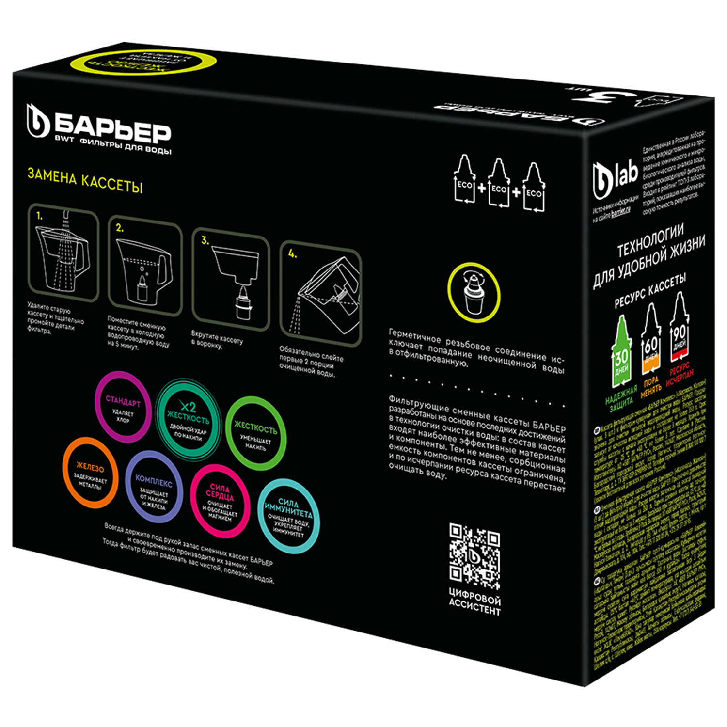Сменная кассета БАРЬЕР "Жесткость Железо" для жесткой и железистой воды, КОМПЛЕКТ 3 шт., ресурс 3х350 л Код товара: 702822 1 224 ₽ Купить Производитель:БАРЬЕР Комплект из трёх сменных кассет БАРЬЕР "Жесткость Железо" – это целевое решение для домов и дач, где водопроводная вода отличается высокой жёсткостью и повышенным содержанием железа. Вода с высоким содержанием железа оставляет белую накипь в чайниках, рыжеватый осадок на посуде и придаёт напиткам неприятный металлический привкус. Кассеты этой серии решают обе проблемы одновременно: специальная смесь ионообменных смол и ионообменное волокно эффективно удаляют соли жёсткости и растворённое железо, предотвращая образование налёта и окрашивания. При этом вода проходит полную многоступенчатую очистку: кокосовый активированный уголь, обработанный серебром, устраняет хлор, хлороформ, посторонние запахи и привкусы, а также подавляет рост бактерий; фильтр тонкой очистки задерживает механические примеси, а дополнительные компоненты защищают от тяжёлых металлов. В результате – кристально чистая, мягкая, приятная на вкус вода без следов ржавчины или накипи. Ресурс каждой кассеты – до 350 литров (примерно 60 дней для одного человека), а благодаря герметичному резьбовому соединению вы можете быть уверены: неочищенная вода не попадёт в готовый продукт. Все кассеты БАРЬЕР универсальны – этот комплект подходит ко всем фильтрам-кувшинам бренда. Предприятие-изготовитель оставляет за собой право вносить изменения в конструкцию, не влияющие на правила и условия эксплуатации, без отражения в документации. Представленные ниже характеристики носят справочный характер.Производство: РоссияТип модуля: кассетаСерия: Жесткость ЖелезоТип воды: жесткий, с повышенным содержанием железаСпециализация: умягчение и очистка водыСредний ресурс кассеты: 350 лКоличество в комплекте: 3 шт.Производительность: 0.2 л/минСрок годности: 36 месВес: 457 грРазмер упаковки: 6.6 × 19.3 × 14.1 смОбъём: 0.0021 м3Промежуточная упаковка: 12 штТранспортная упаковка: 12 штШтрих-код: 4601032994341 Файлы Сертификат-1.jpg Сертификат-2.jpg Сертификат-3.jpg Сертификат-4.jpg Сертификат-5.jpg