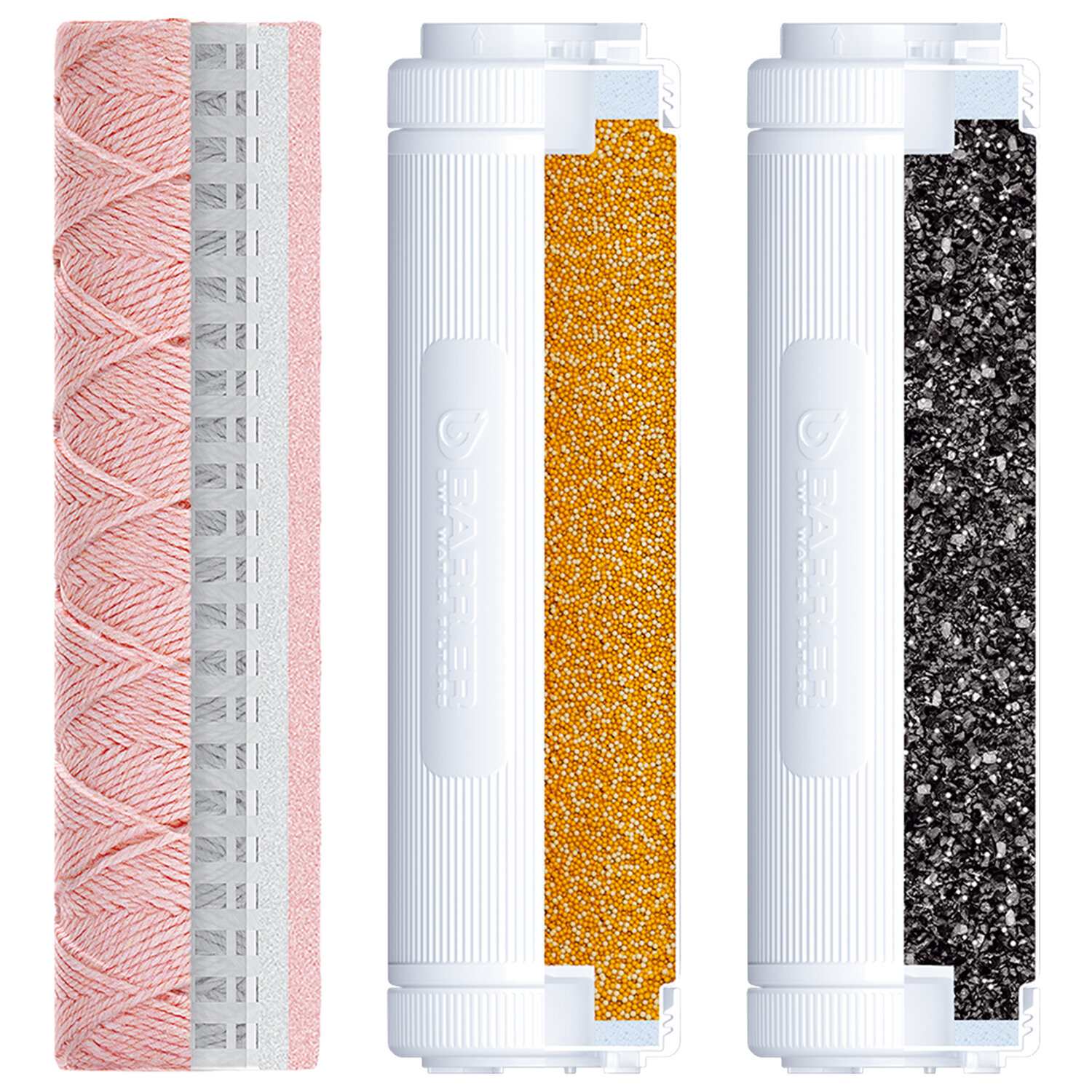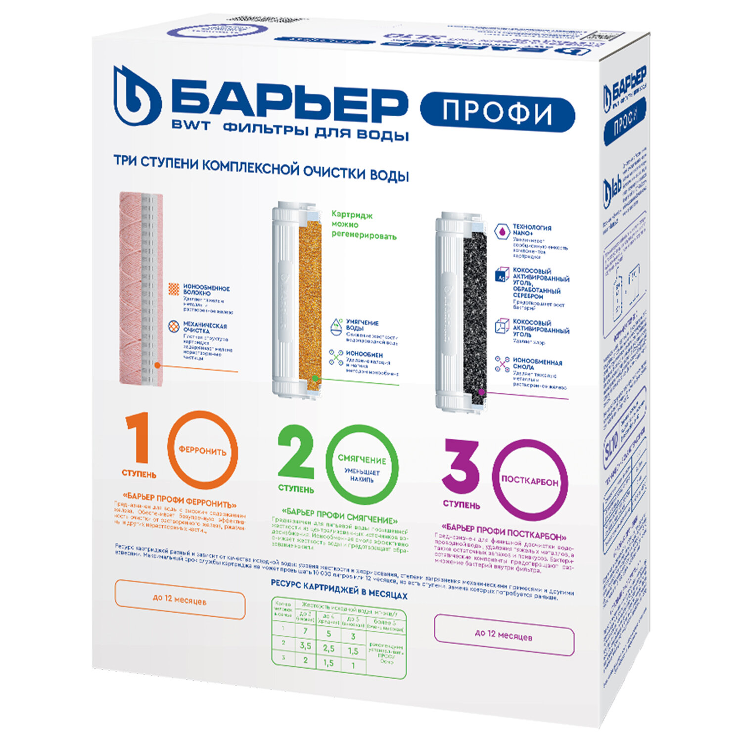 Картриджи сменные БАРЬЕР "ПРОФИ Комплекс", 3 ступени, ресурс 10000 л, КОМПЛЕКТ 3 шт. Код товара: 702837 2 758,4 ₽ Купить Производитель:БАРЬЕР Комплект сменных картриджей БАРЬЕР "ПРОФИ Комплекс" – это мощное решение для домов и дач, где вода одновременно жёсткая и насыщена железом: она оставляет белый налёт в чайниках, рыжий осадок на сантехнике и придаёт напиткам металлический привкус. Сменные картриджи для проточного фильтра БАРЬЕР стандарта Slim Line 10 (SL10) подходят к любой проточной системе БАРЬЕР "ПРОФИ". Комплект сменных картриджей БАРЬЕР "ПРОФИ Комплекс" для жесткой воды с высоким содержанием железа. Позволит забыть о накипи, неприятном металлическом привкусе воды и желтоватом осадке в чайнике. Производительность – 2 л/мин, ресурс – 10 000 литров. Вода проходит три этапа очистки: 1 ступень – картридж "ФерроНить" для фильтра БАРЬЕР "ПРОФИ". Навитой материал с прочными ионообменными связями для удаления железа и тяжелых металлов даже при высоких концентрациях. 2 ступень – картридж "Смягчение" для фильтра БАРЬЕР "ПРОФИ". Снижает карбонатную жесткость, из-за которой образуется накипь в чайнике. Ресурс до 6 месяцев, однако картридж может быть подвергнут регенерации в домашних условиях с помощью простой поваренной НЕ йодированной соли (не более 8 раз). 3 ступень – картридж "ПостКарбон" для фильтра БАРЬЕР "ПРОФИ". Осуществляет финишную очистку и кондиционирование, устраняет хлор, тяжелые металлы и неприятные привкусы. Для замены и установки сменного картриджа потребуется ключ из комплекта фильтра для воды БАРЬЕР "ПРОФИ". Сменные картриджи БАРЬЕР "ПРОФИ" подходят к системам других производителей при условии фактического соответствия универсальному стандарту SL10. Производитель оставляет за собой право без предварительного уведомления вносить изменения в технические характеристики, комплектацию и конструкцию, не ухудшающие эксплуатационные характеристики изделия.Производство: РоссияТип модуля: картриджСерия: ПРОФИТип воды: жесткий, с повышенным содержанием железаСпециализация: умягчение и очистка водыСредний ресурс кассеты: 10000 лКоличество в комплекте: 3 шт.Производительность: 2 л/минСрок годности: 36 месВес: 1,41 кгРазмер упаковки: 7.6 × 26.4 × 22.4 смОбъём: 0.0053 м3Промежуточная упаковка: 6 штТранспортная упаковка: 6 штШтрих-код: 4601032932015 Файлы Приложение-1.pdf Сертификат-1.jpg Сертификат-2.jpg Сертификат-3.jpg Сертификат-4.jpg Сертификат-5.jpg