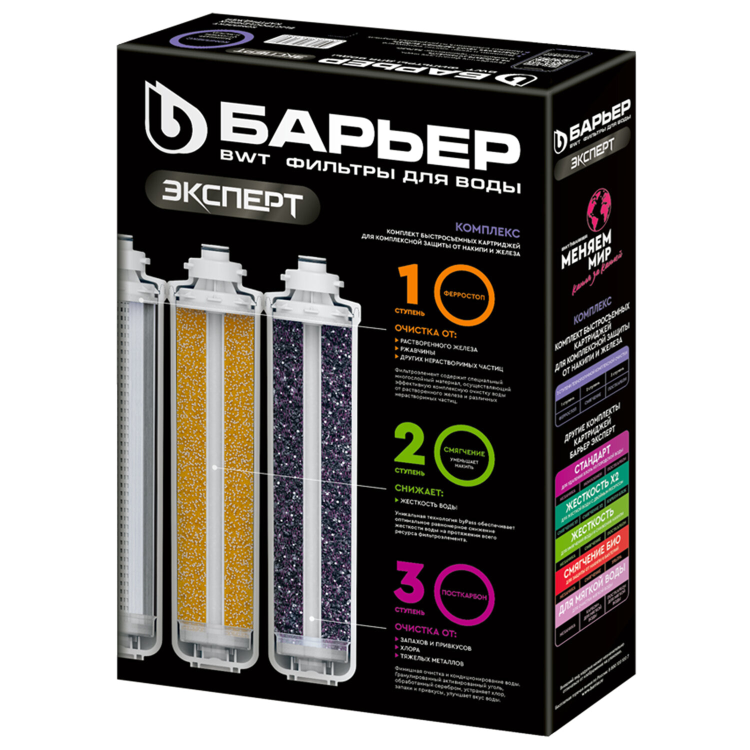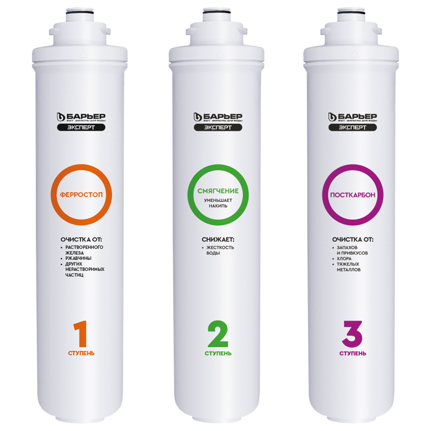 Картриджи сменные БАРЬЕР "ЭКСПЕРТ Комплекс", 3 ступени, ресурс 10000 л, КОМПЛЕКТ 3 шт. Код товара: 702844 3 235,2 ₽ Купить Производитель:БАРЬЕР Комплект сменных картриджей БАРЬЕР "ЭКСПЕРТ Комплекс" – это мощное решение для домов и дач, где вода одновременно жёсткая и насыщена железом: она оставляет белый налёт в чайниках, рыжий осадок на посуде и придаёт напиткам неприятный металлический привкус. Сменные быстросъемные картриджи для проточного фильтра БАРЬЕР "ЭКСПЕРТ". Комплект сменных картриджей БАРЬЕР "ЭКСПЕРТ Комплекс" позволяет забыть о накипи, неприятном металлическом привкусе воды и желтоватом осадке в чайнике. Производительность – 2 л/мин. Ресурс – 10 000 литров. Вода проходит три этапа очистки: 1 ступень – картридж "Ферростоп" для фильтра БАРЬЕР "ЭКСПЕРТ". Содержит специальный многослойный материал, эффективно удаляющий железо как в растворенной, так и нерастворенной форме. Финишный слой препятствует сбросу отфильтрованного железа в чистую воду. 2 ступень – картридж "Смягчение" для фильтра БАРЬЕР "ЭКСПЕРТ". Предотвращает образование накипи: эффективно снижает карбонатную жесткость, из-за которой образуется осадок в чайнике. Рекомендованная частота замены картриджа – не реже 1 раза в 6 месяцев. 3 ступень – картридж "ПостКарбон" для фильтра БАРЬЕР "ЭКСПЕРТ". Осуществляет финишную очистку и кондиционирование, устраняет хлор, тяжелые металлы и неприятные привкусы. Картриджи подходят к фильтрам линеек БАРЬЕР "ЭКСПЕРТ", БАРЬЕР "ЭКСПЕРТ СЛИМ", БАРЬЕР "Актив", БАРЬЕР "ОНИКС". Не требуют для замены специальных ключей, инструментов или навыков. Производитель оставляет за собой право без предварительного уведомления вносить изменения в технические характеристики, комплектацию и конструкцию, не ухудшающие эксплуатационные характеристики изделия.Производство: РоссияТип модуля: картриджСерия: ЭкспертТип воды: жесткий, с повышенным содержанием железаСпециализация: умягчение и очистка водыСредний ресурс кассеты: 10000 лКоличество в комплекте: 3 шт.Производительность: 2 л/минСрок годности: 36 месВес: 2,17 кгРазмер упаковки: 8.1 × 33.8 × 23.3 смОбъём: 0.0074 м3Промежуточная упаковка: 5 штТранспортная упаковка: 5 штШтрих-код: 4601032931308 Файлы Сертификат-1.jpg Сертификат-2.jpg Сертификат-3.jpg Сертификат-4.jpg Сертификат-5.jpg Сертификат-6.jpg