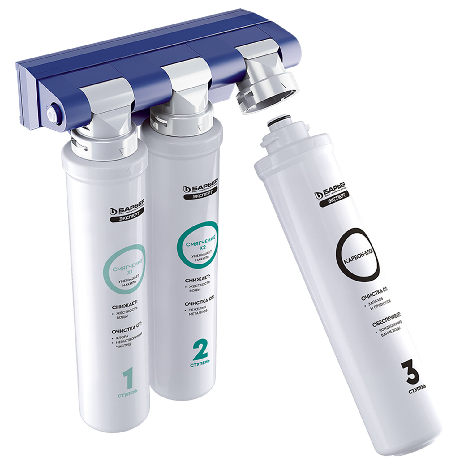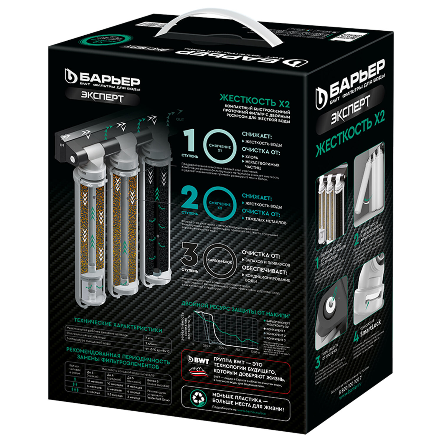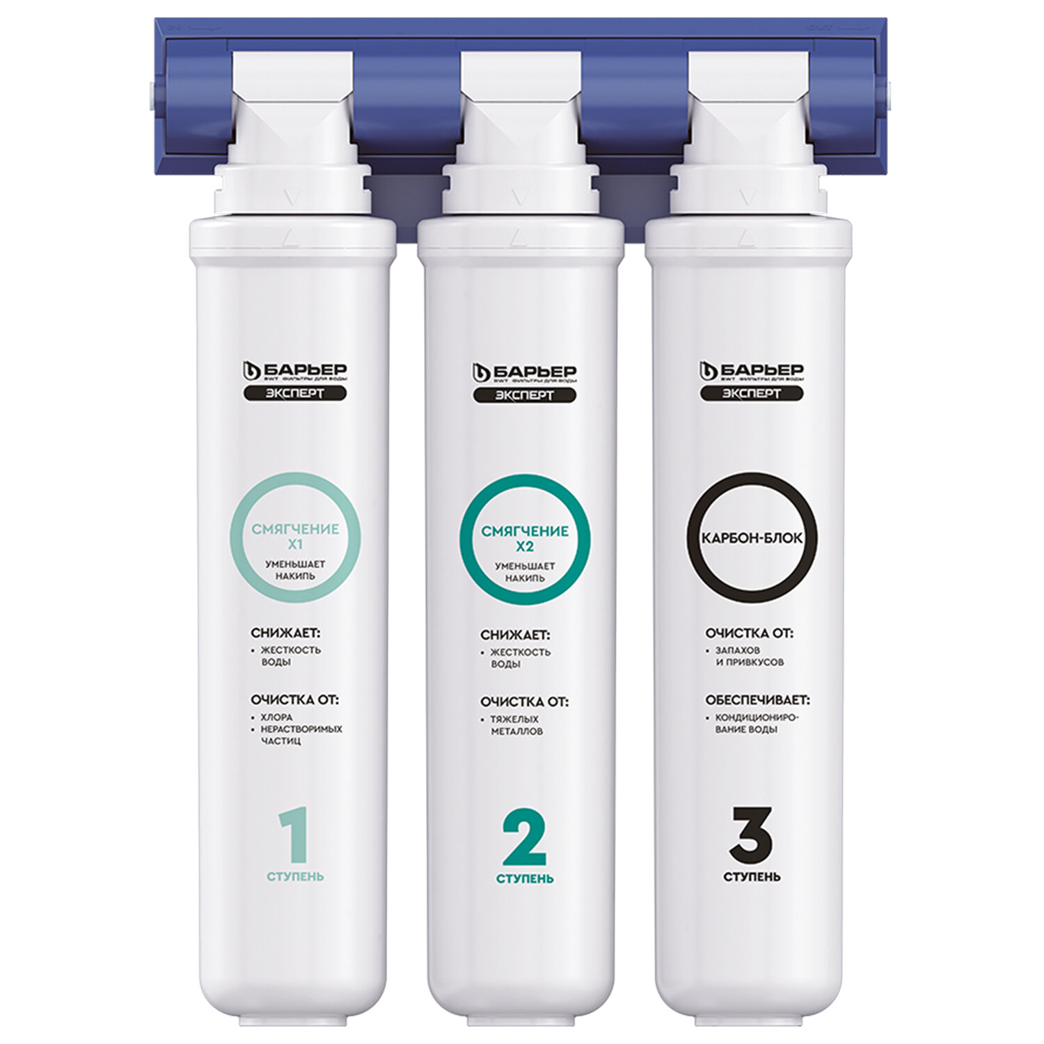 Фильтр для воды БАРЬЕР "ЭКСПЕРТ Жесткость Х2", 3 ступени, ресурс 1000 л Код товара: 702849 4 824 ₽ Купить Производитель:БАРЬЕР Фильтр БАРЬЕР "ЭКСПЕРТ Жесткость Х2 – это усиленная защита от жёсткой воды, разработанная для тех, кто хочет забыть о накипи на целый год! Проточный фильтр с двойным ресурсом защиты от накипи без крана в комплекте. Благодаря оптимально подобранному сочетанию компонентов обеспечивает не только базовую очистку, но и эффективно удаляет накипь до 12 месяцев. Производительность системы – 2 л/мин. Конструкция фильтра для воды БАРЬЕР позволяет менять картриджи без инструментов, специальных ключей и навыков за 30 секунд. Компактный размер позволяет установить систему очистки воды под мойку даже на небольшой кухне. Вода проходит три этапа очистки: 1 ступень – БАРЬЕР "ЭКСПЕРТ Смягчение X1". Сочетание сорбционной и механической очистки, предварительное умягчение. Удаляет соли жесткости, тяжелые металлы, соединения хлора и механические частицы. 2 ступень – БАРЬЕР "ЭКСПЕРТ Смягчение X2". Сорбционная очистка и второй этап умягчения. Удаляет остаточные тяжелые металлы и соли жесткости. 3 ступень – БАРЬЕР "ЭКСПЕРТ Карбон-Блок". Убирает остаточные соединения хлора, кондиционирует воду и улучшает ее вкусовые свойства. Производитель оставляет за собой право без предварительного уведомления вносить изменения в технические характеристики, комплектацию и конструкцию, не ухудшающие эксплуатационные характеристики изделия.Производство: РоссияТип фильтра: проточныйЧисло ступеней очистки: 3Производительность: 2 л/мин.Максимальная температура очищаемой воды: 35 °CРабочее давление в системе водоснабжения: 2-7 атмНазначение : умягчение водыУровень жесткости воды: жесткая (от 8 до 12 мг-экв/л)Наличие крана в комплекте: даСпособ установки : под мойкуСерия: ЭкспертОбъем накопительного бака: 0 лРазмер: 26,7х9,6х36,7 смВес (без упаковки): 3.5 кгСрок годности: 36 месВес: 3,3 кгРазмер упаковки: 15 × 33.7 × 25 смОбъём: 0.0145 м3Промежуточная упаковка: 2 штТранспортная упаковка: 2 штШтрих-код: 4601032001605 Файлы Приложение-1.pdf Сертификат-1.jpg Сертификат-2.jpg Сертификат-3.jpg Сертификат-4.jpg Сертификат-5.jpg Сертификат-6.jpg