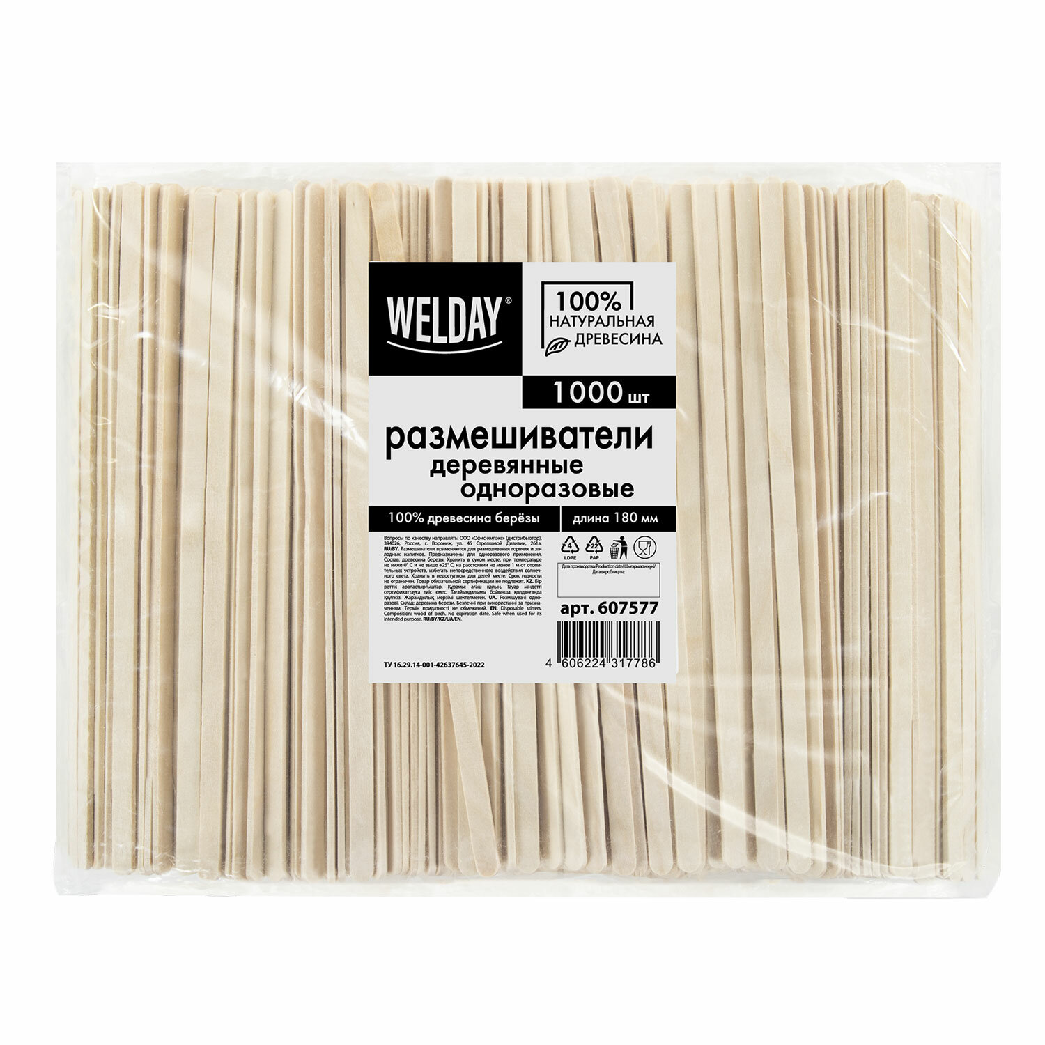 Размешиватель одноразовый деревянный 180 мм, КОМПЛЕКТ 1000 шт., WELDAY (ВЭЛДЭЙ) Код товара: 607577 448,56 ₽ Купить Производитель:WELDAY Одноразовые размешиватели WELDAY используются в офисе, на предприятиях общественного питания, в дороге и быту. Размешиватели изготовлены из древесины березы. Безопасны при использовании, так как не выделяют вредных веществ при взаимодействии с горячей жидкостью. Подойдут как для холодных, так и для горячих блюд (до +95°). Предназначены для одноразового применения, легко утилизируются. Длина - 180 мм. В комплекте 1000 штук.Производство: РоссияТип товара: размешивательНазначение: для горячегоДлина: 180 ммСоответствует требованиям ГОСТа: нетМатериал: березаКоличество в упаковке: 1000 шт.Цвет: бежевыйВес: 1,21 кгРазмер упаковки: 7.2 × 22.5 × 18.4 смОбъём: 0.003 м3Промежуточная упаковка: 10 штТранспортная упаковка: 10 штШтрих-код: 4606224317786 Сертификат-1.jpg Сертификат-2.jpg Сертификат-3.jpg