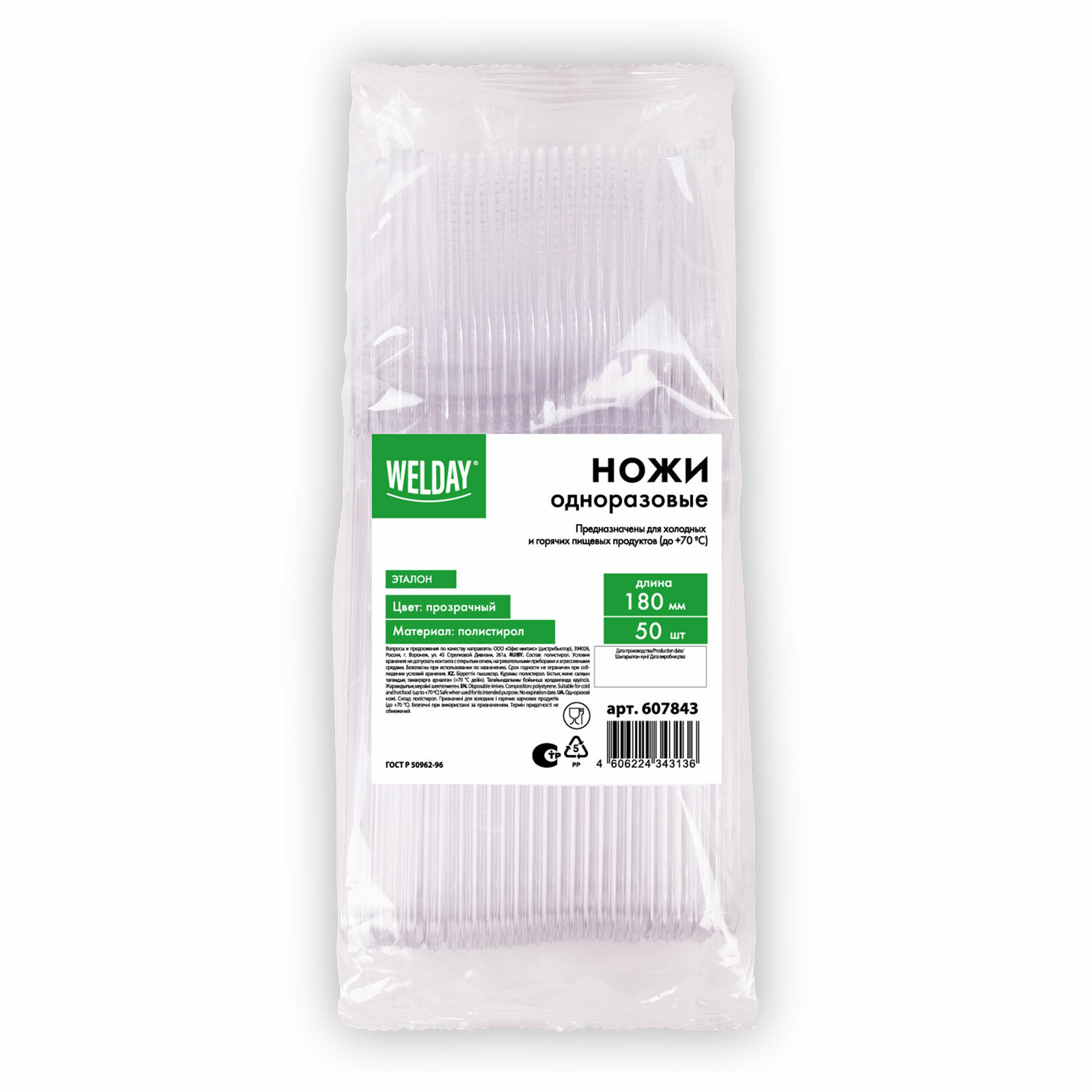 Нож одноразовый пластиковый 180 мм, прозрачный, КОМПЛЕКТ 50 шт., ЭТАЛОН, WELDAY (ВЭЛДЭЙ) Код товара: 607843 173,8 ₽ Купить Производитель:WELDAY Одноразовые пластиковые ножи WELDAY подходят как для холодных, так и для горячих блюд. Используются на предприятиях общественного питания, в дороге, на пикнике, а также дома и в офисе. Приборы изготовлены из высококачественного пищевого прозрачного полистирола, поэтому они легкие и безопасные в использовании. Подойдут как для холодных, так и для горячих (до +70°) блюд. Длина — 180 мм. В упаковке 50 штук.Производство: РоссияДлина: 180 ммКоличество в упаковке: 50 шт.Соответствует требованиям ГОСТа: ГОСТ Р 50962-96Материал: полистиролЦвет: прозрачныйВес: 191 грРазмер упаковки: 4.2 × 18.8 × 8.6 смОбъём: 0.0008 м3Промежуточная упаковка: 40 штТранспортная упаковка: 40 штШтрих-код: 4606224343136 Файлы Сертификат-1.jpg Сертификат-2.jpg Сертификат-3.jpg Сертификат-4.jpg