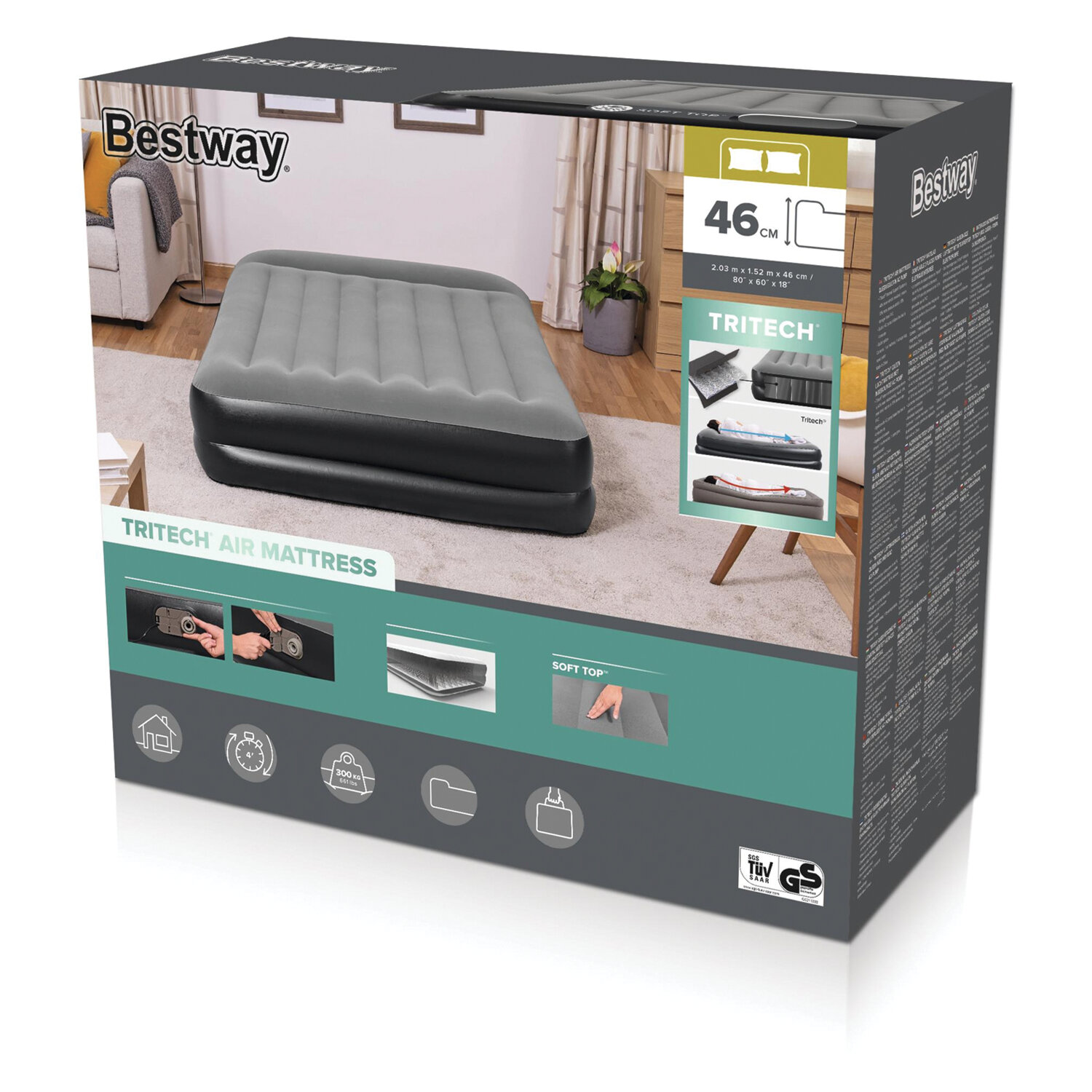 Надувная кровать 152х203х46 см, с подголовником, встроенный насос 220В, до 300 кг, BESTWAY Код товара: 680168 4 576,32 ₽ Купить Производитель:BESTWAY Надувная кровать BESTWAY размером с подголовником предназначена для использования в помещении. Двуспальная надувная кровать изготовлена по технологии I-Beam Construction. Внутренние перегородки под весом тела не деформируются и постоянно остаются устойчивыми. Вес распространяется равномерно по всей площади надувной кровати. Кровать имеет удобный подголовник. Приятное флокированное покрытие (искусственная замша) поверхности кровати не даёт соскальзывать постельному белью, легко чистится без применения специальных средств. Кровать имеет надежный встроенный электронасос, который позволяет за несколько минут надувать и сдувать кровать, а также даёт возможность отрегулировать её упругость. Насос подключается к стандартной электрической розетке. При отсутствии электричества кровать можно накачать обычным механическим насосом. Для этого кровать снабжена специальным клапаном для подключения внешнего насоса. В комплект входит удобная сумка для переноски кровати и специальная самоклеющаяся заплатка. Характеристики: • Серия – Tritech Airbed. • Размер – 152х203х46 см. • Высота спального места – 46 см. • Вес упаковки – 7,04 кг. • Максимальная нагрузка – 300 кг. • Время накачивания – 4 минуты. В комплект входят: 1 надувной матрас, 1 мешок для хранения, ремонтная заплата.Производство: КитайТип товара: надувная кроватьМаксимальная нагрузка: 300 кгВозраст: -Количество в комплекте: 1 шт.Особенности: встроенный электронасосКомплектация: насос, сумкаДлина: 203 смШирина: 152 смВысота: 46 смЦвет: черно-серыйМатериал: ПВХУпаковка: картонная коробкаВес: 7,27 кгРазмер упаковки: 18.7 × 39.3 × 35 смОбъём: 0.0287 м3Промежуточная упаковка: 2 штТранспортная упаковка: 2 штШтрих-код: 6941607329597 Файлы Сертификат-1.jpg Сертификат-2.jpg Сертификат-3.jpg Сертификат-4.jpg Сертификат-5.jpg Сертификат-6.jpg