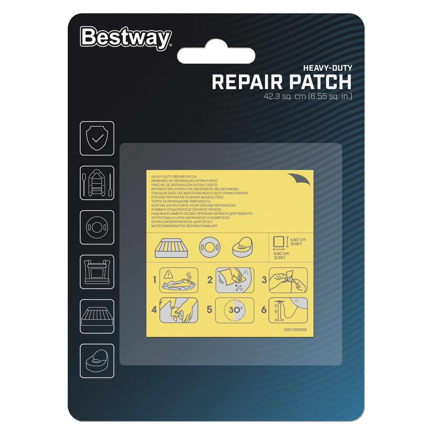 Ремонтный комплект для надувной продукции 6,5х6,5 см, самоклеящиеся заплатки, 10 шт., BESTWAY Код товара: 700957 209,89 ₽ Купить Производитель:BESTWAY Ремонтный комплект BESTWAY особой прочности с самоклейками 6,5х6,5 см предназначен для ремонта и реставрации любых надувных изделий INTEX и BESTWAY. Последовательность ремонта: 1) Очистить поверхность, подлежащую ремонту. 2) Отделить заплатку от подложки. 3) Прижать заплатку к поврежденному участку. 4) Не надувать изделие в течение 30 минут. В комплект входит: 10 прозрачных самоклеящихся заплаток размером 6,5х6,5 см.Производство: КитайТип товара: Ремонтный комплектВозраст: -Форма: квадратнаяРазмер: 6,5х6,5 смОбъем: 0 лОсобенности: -Количество в комплекте: 10 шт.Цвет: прозрачныйРисунок: нетСерия: аксессуары для бассейнаУпаковка: блистер с европодвесомВес: 25 грРазмер упаковки: 0.6 × 15.6 × 11.2 смОбъём: 0.0001 м3Промежуточная упаковка: 36 штТранспортная упаковка: 36 штШтрих-код: 6941607307557 Файлы Сертификат-1.jpg Сертификат-2.jpg Сертификат-3.jpg Сертификат-4.jpg Сертификат-5.jpg Сертификат-6.jpg