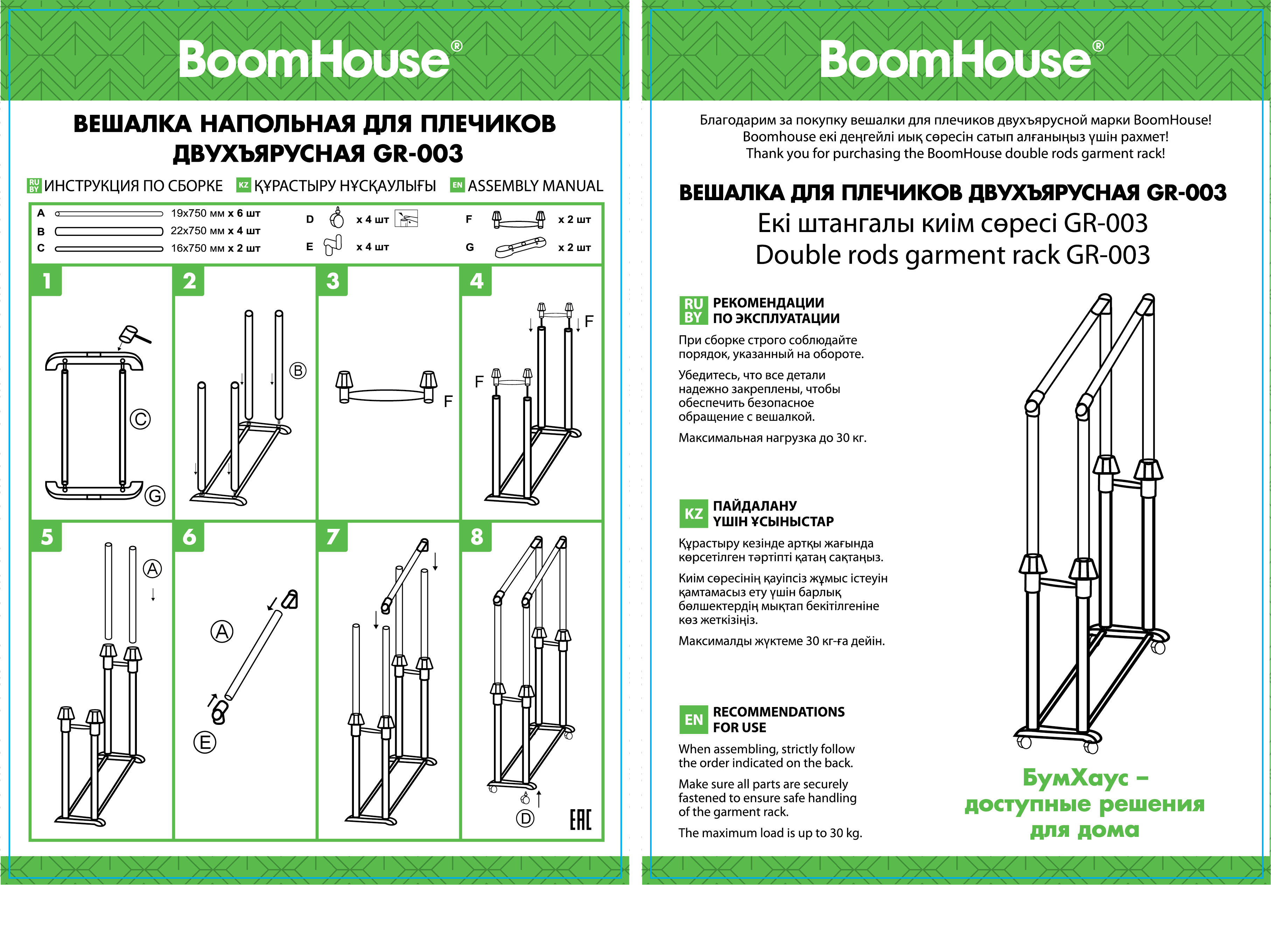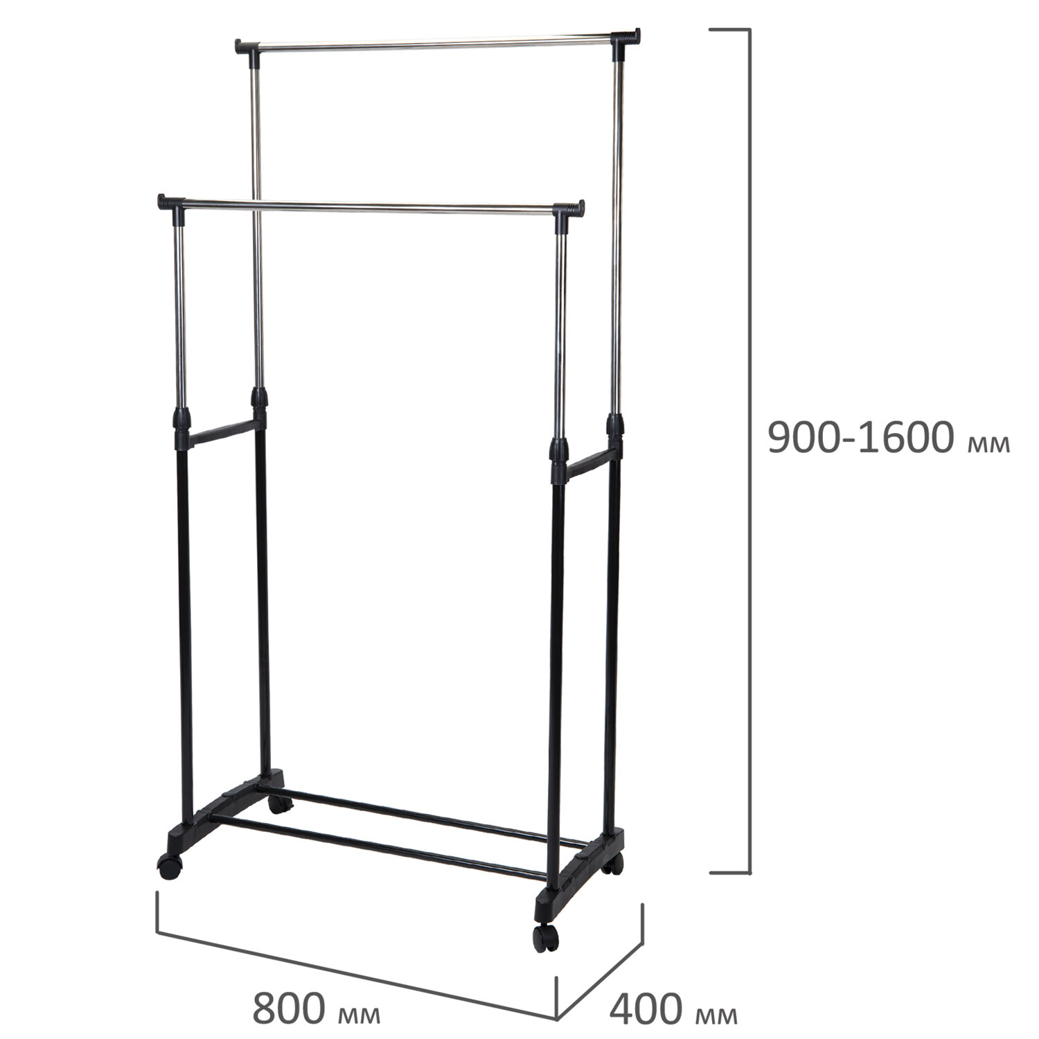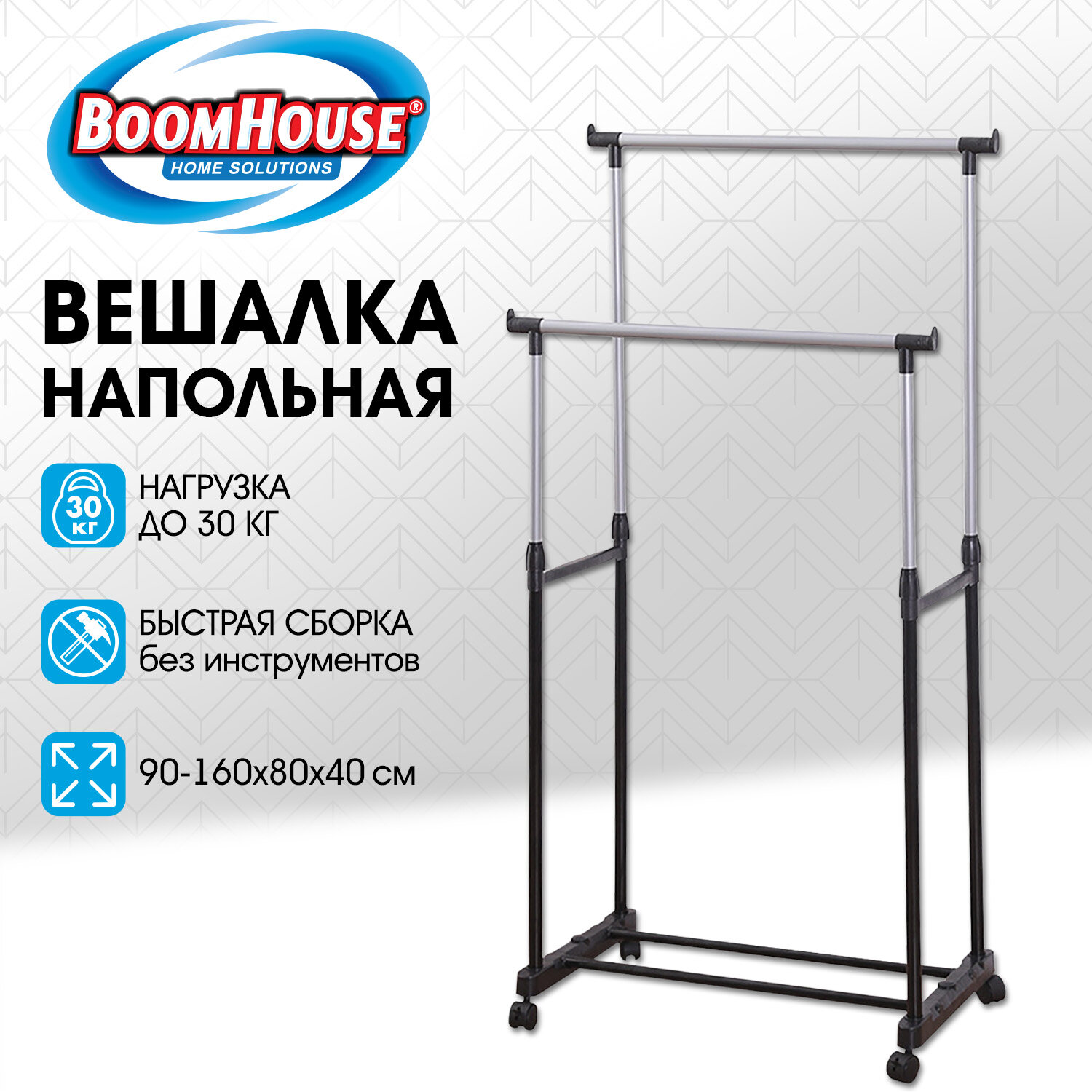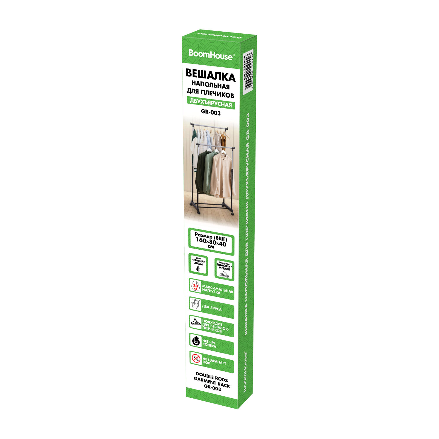 Вешалка для плечиков двухъярусная BOOMHOUSE (БУМХАУС) GR-003 (900-1600x800x400 мм), пластик/металл, черный/хром Код товара: 701438 990 ₽ Купить Производитель:BoomHouse Двухъярусная вешалка для плечиков BOOMHOUSE GR-003 предназначена для открытого хранения вещей дома или в офисе. Это не просто вешалка, это гардеробная система со штангами для плечиков и полкой для обуви. Каркас выполнен из стальной трубы диаметром 21,5 мм с полимерным покрытием, а трубы для вешалок диаметром 19 мм. Настраиваемая высота ярусов от 90 до 160 см. Две железных перекладины вмещают до 25 плечиков, распределенная нагрузка – до 30 кг. Перекладина оснащена ограничителями, предотвращающими соскальзывание плечиков. Внизу полка для размещения обуви, коробок или органайзеров. На ножки устанавливаются колесики для удобного перемещения. Мобильная благодаря минимальному весу. Изделие поставляется в разобранном виде в картонной коробке. Простая сборка согласно инструкции.Производство: КитайТип: для плечиковМатериал основания: металл, пластикСерия: GR-003Соответствует требованиям ГОСТа: нетВысота: 1600 ммШирина: 800 ммГлубина: 400 ммЦвет: черный/серыйПоставляется в разобранном виде: даВес: 1,74 кгРазмер упаковки: 7.9 × 76.6 × 11.7 смОбъём: 0.0084 м3Промежуточная упаковка: 6 штТранспортная упаковка: 6 штШтрих-код: 4606224510156 Файлы Приложение-1.jpg Сертификат-1.jpg Сертификат-2.jpg Сертификат-3.jpg