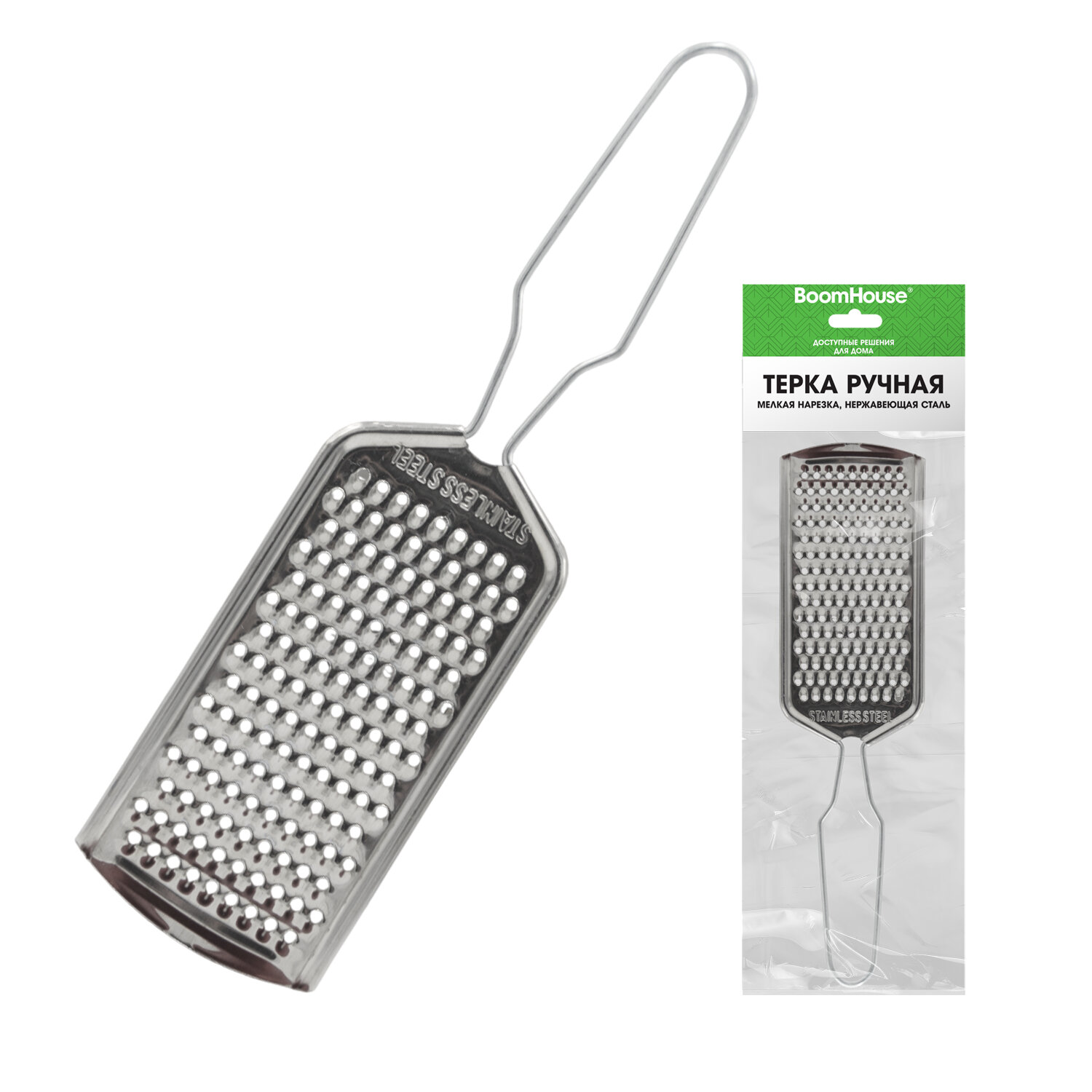 Терка ручная, мелкая нарезка, нержавеющая сталь, BOOMHOUSE Код товара: 702091 59,18 ₽ Купить Производитель:BoomHouse Ручная терка BOOMHOUSE – ваша незаменимая помощница на кухне. Благодаря острым лезвиям, прочной конструкции, компактному размеру и удобной ручке она легко справится с любыми продуктами и сделает приготовление блюд максимально простым и комфортным. Терки и овощерезки находятся в прямом контакте с пищевыми продуктами, поэтому важную роль играет материал, из которого сделан инструмент. Терка BOOMHOUSE изготовлена из качественного материала, который соответствует всем требованиям безопасности – это мартенситная нержавеющая сталь SUS410, отличающаяся высокой коррозионной стойкостью, прочностью и устойчивостью к окислению. Тёрка – это универсальный ручной кухонный прибор для обработки овощей, фруктов и других продуктов. Устройство оснащено функциональной поверхностью с прорезью: • Мелкая терка – отличается от стандартных лезвий терок уменьшенным размером отверстий (2 мм), что позволяет измельчать продукты в 2-3 раза сильнее. Является универсальным решением для работы абсолютно с любыми продуктами. Часто используется при создании салатов, закусок или кондитерских изделий, идеальна для измельчения сыра, чеснока, цедры, шоколада, орехов и овощей. Все лезвия превосходно заточены, что обеспечивает качественное и быстрое измельчение продуктов. Терку удобно держать использовать и хранить благодарю оптимальному размеру – 21,5х6х0,3 см. А легкий вес изделия (30 г) позволит вам не уставать при долгом использовании. Рекомендации по использованию: 1) Сразу после каждого использования терку следует очистить, тщательно вымыть и высушить. 2) При засорении отверстий не рекомендуется использовать абразивные средства или металлические скребки – можно воспользоваться щеткой, которой удобно очистить все поверхности. 3) Храните терку в сухом месте, вдали от агрессивных химикатов, которые могут вызвать коррозию, и металлических приборов, подверженных коррозии.Производство: КитайТип товара: терка ручнаяНазначение: универсальнаяКоличество типов лезвий: 1Тип лезвий: мелкиеМатериал граней: Нержавеющая стальМатериал ручки: Нержавеющая стальЦвет ручки: стальнойВысота: 21.5 смШирина: 6 смГлубина: 0.3 смСерия: -Упаковка: -Вес: 32 грРазмер упаковки: 0.3 × 21.5 × 7.5 смОбъём: 0.0001 м3Промежуточная упаковка: 250 штТранспортная упаковка: 250 штШтрих-код: 4606224519982 Файлы