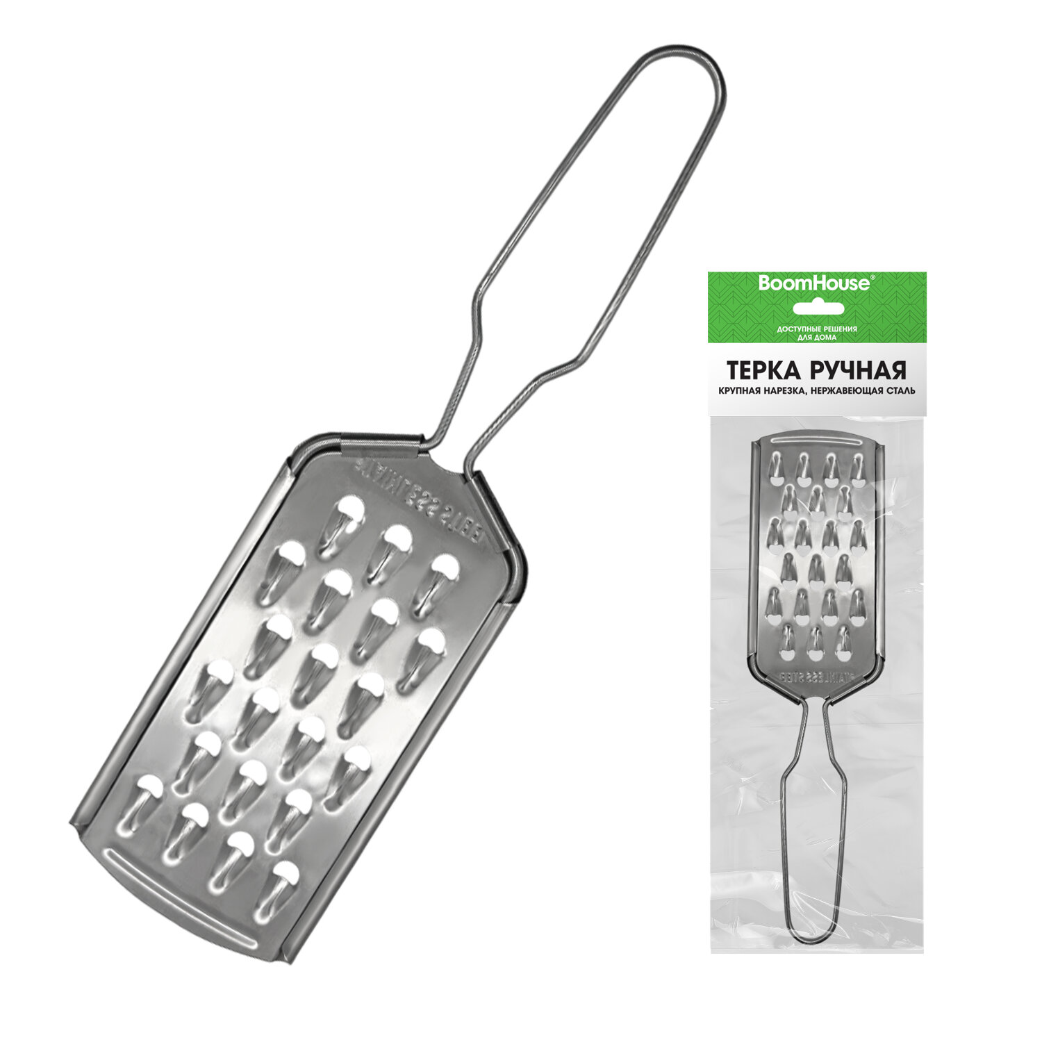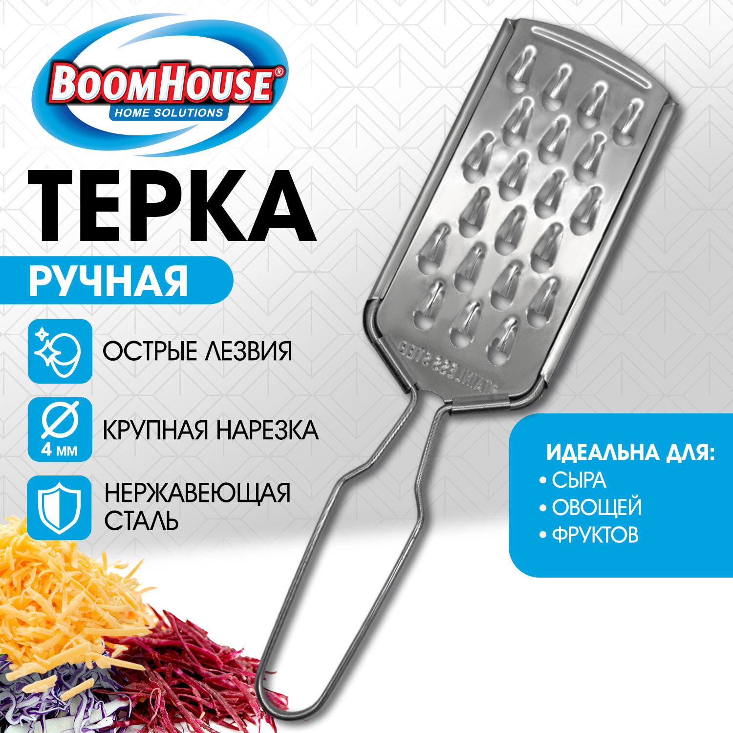 Терка ручная, крупная нарезка, нержавеющая сталь, BOOMHOUSE Код товара: 702093 59,18 ₽ Купить Производитель:BoomHouse Ручная терка BOOMHOUSE – ваша незаменимая помощница на кухне. Благодаря острым лезвиям, прочной конструкции, компактному размеру и удобной ручке она легко справится с любыми продуктами и сделает приготовление блюд максимально простым и комфортным. Терки и овощерезки находятся в прямом контакте с пищевыми продуктами, поэтому важную роль играет материал, из которого сделан инструмент. Терка BOOMHOUSE изготовлена из качественного материала, который соответствует всем требованиям безопасности – это мартенситная нержавеющая сталь SUS410, отличающаяся высокой коррозионной стойкостью, прочностью и устойчивостью к окислению. Тёрка – это универсальный ручной кухонный прибор для обработки овощей, фруктов и других продуктов. Устройство оснащено функциональной поверхностью с прорезью: • Крупная терка – отличается от стандартных лезвий терок уменьшенным размером отверстий (4 мм), что позволяет измельчать продукты в 2-3 раза сильнее. Является универсальным решением для работы абсолютно с любыми продуктами. Часто используется при создании салатов, закусок или кондитерских изделий, идеальна для измельчения сыра, цедры, шоколада, орехов и овощей. Все лезвия превосходно заточены, что обеспечивает качественное и быстрое измельчение продуктов. Терку удобно держать использовать и хранить благодарю оптимальному размеру – 21,5х6х0,3 см. А легкий вес изделия (30 г) позволит вам не уставать при долгом использовании. Рекомендации по использованию: 1) Сразу после каждого использования терку следует очистить, тщательно вымыть и высушить. 2) При засорении отверстий не рекомендуется использовать абразивные средства или металлические скребки – можно воспользоваться щеткой, которой удобно очистить все поверхности. 3) Храните терку в сухом месте, вдали от агрессивных химикатов, которые могут вызвать коррозию, и металлических приборов, подверженных коррозии.Производство: КитайТип товара: терка ручнаяНазначение: универсальнаяКоличество типов лезвий: 1Тип лезвий: крупныеМатериал граней: Нержавеющая стальМатериал ручки: Нержавеющая стальЦвет ручки: стальнойВысота: 21.5 смШирина: 6 смГлубина: 0.3 смСерия: -Упаковка: -Вес: 32 грРазмер упаковки: 0.4 × 21.3 × 7.4 смОбъём: 0.0001 м3Промежуточная упаковка: 250 штТранспортная упаковка: 250 штШтрих-код: 4606224520001 Файлы