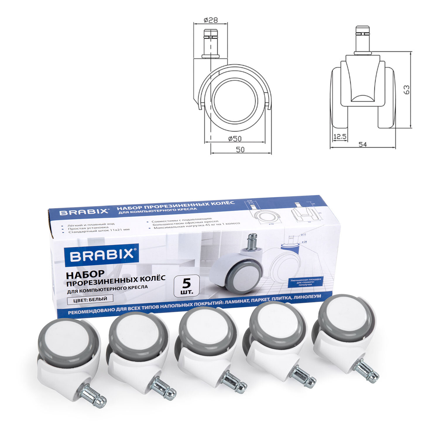 Колеса (ролики) BRABIX для кресла, прорезиненные, SLIM, КОМПЛЕКТ 5 шт., шток d 11 мм, белые Код товара: 533086 765,98 ₽ Купить Производитель:BRABIX Комплект роликов для офисных кресел. Стандартный размер штока – 11х21 мм. Максимальная нагрузка – 45 кг на 1 колесо. Полиуретановое покрытие обеспечивает бесшумный ход и защищает пол от повреждений. Рекомендованы для ламината, паркета, плитки, линолеума.Производство: КитайТип товара: колесаКоличество в комплекте: 5 шт.Серия: Колеса (ролики) BRABIXДиаметр: 50 ммНагрузка: 225 кгДиаметр основания штока: 28 ммСоответствует требованиям ГОСТа: нетМатериал: пластик/полиуретанЦвет: белый/серыйВес: 565 грРазмер упаковки: 6.1 × 27.7 × 9.3 смОбъём: 0.0019 м3Промежуточная упаковка: 30 штТранспортная упаковка: 30 штШтрих-код: 4606224461601 Файлы Сертификат-1.jpg Сертификат-2.jpg Сертификат-3.jpg Сертификат-4.jpg Сертификат-5.jpg Сертификат-6.jpg Сертификат-7.jpg Сертификат-8.jpg Сертификат-9.jpg Сертификат-10.jpg Сертификат-11.jpg Сертификат-12.jpg Сертификат-13.jpg Сертификат-14.jpg Сертификат-15.jpg Сертификат-16.jpg Сертификат-17.jpg Сертификат-18.jpg Сертификат-19.jpg Сертификат-20.jpg Сертификат-21.jpg Сертификат-22.jpg Сертификат-23.jpg Сертификат-24.jpg Сертификат-25.jpg Сертификат-26.jpg