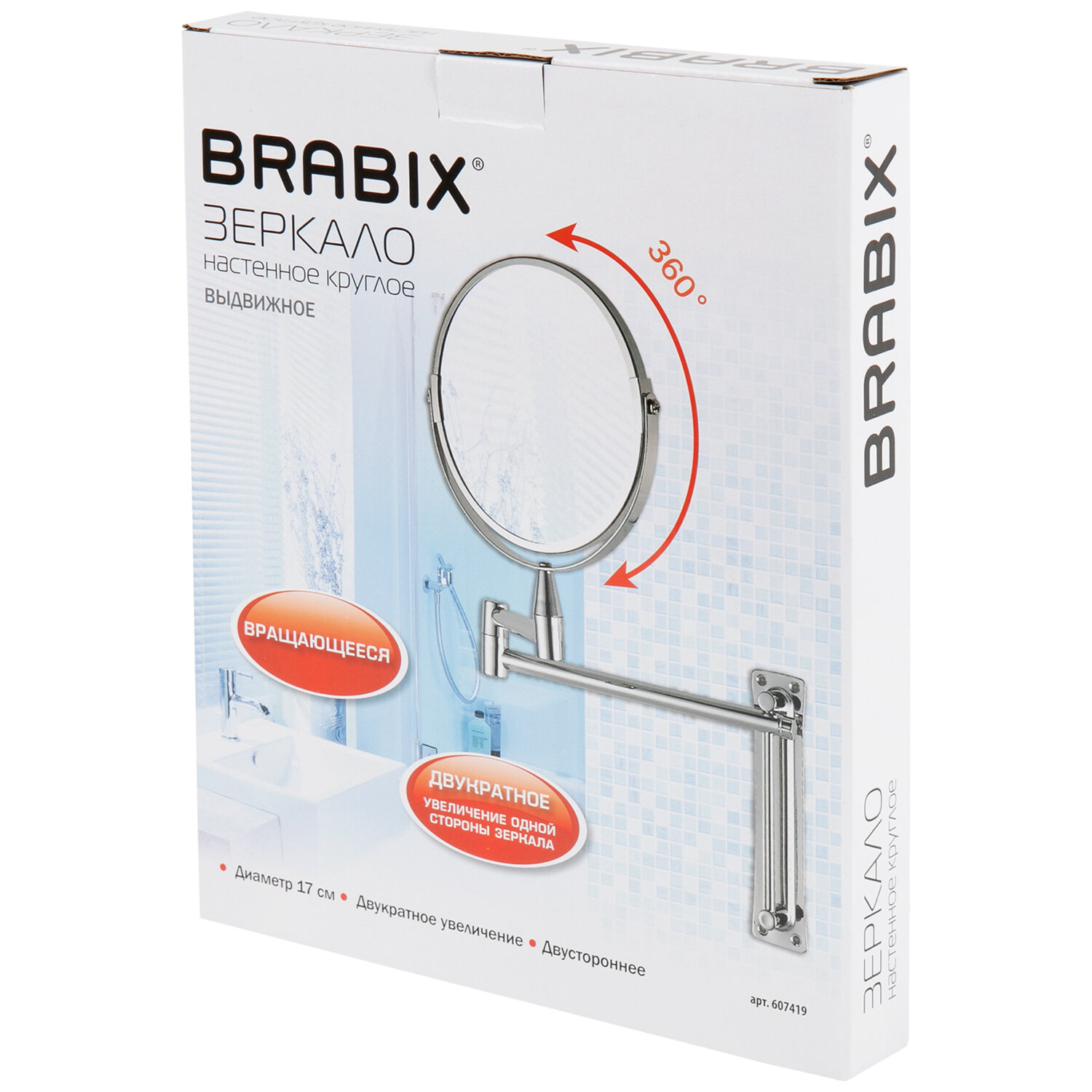 Зеркало настенное BRABIX, диаметр 17 см, двусторонее, с увеличением, нержавеющая сталь, выдвижное (петли) Код товара: 607419 1 156,33 ₽ Купить Производитель:BRABIX Настенное двустороннее зеркало BRABIX станет отличным помощником в уходе за кожей, нанесении макияжа, проведении лечебных процедур для лица. С подробной детализацией размеров данного зеркала можно ознакомиться на одной из фотографий. Эффект 2-х кратного увеличения позволит тщательно и аккуратно произвести самые сложные манипуляции в макияже. Также удобно для использования во время бритья. Зеркало поворачивается вокруг своей оси, что создает дополнительные удобства при использовании. Оправа выполнена из хромированной стали. Диаметр зеркала составляет 17 см. Условия хранения: хранить при комнатной температуре. Избегать попадания прямых солнечных лучей.Производство: КитайТип размещения: настенноеФорма: круглаяВысота: 17 смШирина: 17 смДвухстороннее: даС увеличительным эффектом: даВыдвижное: даТип регулировки положения: петлиВращающееся: даОбъем аккумулятора: без подсветкиМатериал оправы: хромированная стальЦвет оправы*: серебристыйЦвет оправы: серебристыйВес: 683 грРазмер упаковки: 7.1 × 31.7 × 26.6 смОбъём: 0.0069 м3Промежуточная упаковка: 12 штТранспортная упаковка: 12 штШтрих-код: 4606224302072 Файлы Сертификат-1.jpg Сертификат-2.jpg Сертификат-3.jpg Сертификат-4.jpg Сертификат-5.jpg Сертификат-6.jpg Сертификат-7.jpg Сертификат-8.jpg Сертификат-9.jpg Сертификат-10.jpg Сертификат-11.jpg Сертификат-12.jpg Сертификат-13.jpg Сертификат-14.jpg Сертификат-15.jpg Сертификат-16.jpg Сертификат-17.jpg Сертификат-18.jpg Сертификат-19.jpg Сертификат-20.jpg Сертификат-21.jpg Сертификат-22.jpg Сертификат-23.jpg Сертификат-24.jpg Сертификат-25.jpg Сертификат-26.jpg
