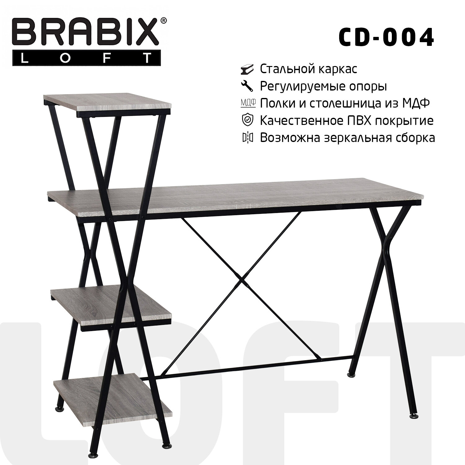 Стол на металлокаркасе BRABIX "LOFT CD-004", 1200х535х1110 мм, 3 полки, цвет дуб антик Код товара: 641219 8 577 ₽ Купить Производитель:BRABIX Функциональное рабочее место трудно представить без стола "LOFT CD-004". Стол на металлокаркасе с "матовым" напылением, столешницей из МДФ с покрытием, устойчивым к повреждениям, + 3 дополнительные полки - качественное решение для экономии пространства. Материал столешницы - МДФ с устойчивым к повреждениям и влаге ПВХ-покрытием. Опоры стола выполнены из металла с "матовым" покрытием и сечением 20х20 мм - надежная, безопасная и долговечная конструкция. Ножки стола оснащены пластиковыми накладками, которые защищают пол от повреждений.Функциональность стола обеспечивается тремя дополнительными полками, где можно хранить необходимые для вашей работы вещи: от канцелярских принадлежностей и книг до ноутбука. Оптимальные габариты BRABIX "LOFT CD-004" подходят даже для небольших помещений.Стол выдерживает нагрузку до 40 кг.Лёгкая сборка, функциональность, лаконичный, современный дизайн и компактный размер по разумной цене - это безусловные преимущества стола BRABIX "LOFT CD-004".Производство: КитайНабор мебели: LOFTШирина стола: 1200 ммГлубина стола: 535 ммВысота стола: 1110 мм Материал столешницы: МДФЦвет столешницы/полок: дуб антикТолщина столешницы/полок: 15 ммКоличество полок: 3 шт.Материал каркаса: металлЦвет каркаса: черныйСечение каркаса: 20х20 ммПоставляется в разобранном виде: даСерия: LOFT CD-004Соответствует требованиям ГОСТа: нетВес: 17,5 кгРазмер упаковки: 9.5 × 125.5 × 58 смОбъём: 0.0692 м3Промежуточная упаковка: 1 штТранспортная упаковка: 1 штШтрих-код: 4606224257150 Приложение-1.pdf Сертификат-1.jpg Сертификат-2.jpg