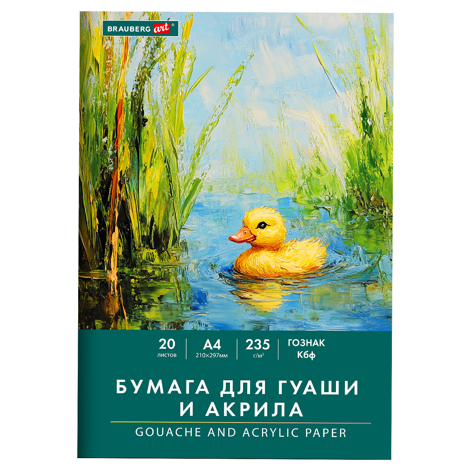 Бумага для гуаши и акрила А4 20 л., 235 г/м2, 210х297 мм, в папке, BRAUBERG ART CLASSIC, "Уточка" Код товара: 117732 191,2 ₽ Купить Производитель:BRAUBERG ART Бумага для гуаши и акрила BRAUBERG ART "CLASSIC" предназначена для рисования водорастворимыми красками (гуашь, акрил, акварель), а также подойдет для рисования карандашами, тушью, ручками и фломастерами. Подходит для профессионального занятия живописью. Рекомендована преподавателями художественных школ. Качественные листы высокой плотности 235 г/м2 устойчивы к истиранию, воздействию влаги, обеспечивают чистую, реалистичную передачу цвета. Текстура бумаги подходит для разных техник рисования, позволяя краскам ложиться на лист ровно и ярко. Папка содержит 20 листов формата А4 (210х297 мм). Белизна 100%. Обложка выполнена из мелованного картона.Производство: РоссияФормат: А4Серия: ClassicПлотность внутреннего блока: 235 г/м2Тип товара: бумага для гуаши и акрила в папкеКоличество листов: 20Внутренний блок: бумага для гуаши и акрилаШирина: 210 ммДлина: 297 ммТекстура: нетЦвет внутреннего блока: белыйБелизна 100%: даБез кислот: даОбложка: мелованный картонТип скрепления: отсутствуетДизайн обложки: УточкаКоличество дизайнов в упаковке: 1 шт.Индивидуальная упаковка: даВес: 330 грРазмер упаковки: 0.6 × 30.3 × 21.7 смОбъём: 0.0005 м3Промежуточная упаковка: 15 штТранспортная упаковка: 15 штШтрих-код: 4606224519272 Сертификат-1.jpg Сертификат-2.jpg Сертификат-3.jpg