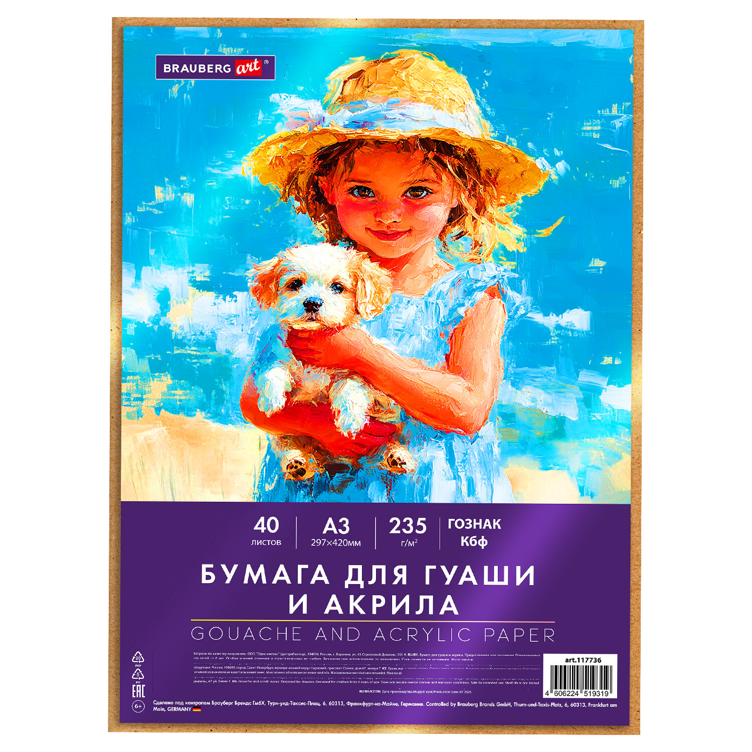 Бумага для гуаши и акрила А3 40 л., 235 г/м2, в коробке, BRAUBERG ART CLASSIC, "Девочка с собачкой" Код товара: 117736 547,25 ₽ Купить Производитель:BRAUBERG ART Бумага для гуаши и акрила BRAUBERG ART "CLASSIC" предназначена для рисования водорастворимыми красками (гуашь, акрил, акварель), а также подойдет для рисования карандашами, тушью, ручками и фломастерами. Подходит для профессионального занятия живописью. Рекомендована преподавателями художественных школ. Качественные листы высокой плотности 235 г/м2 устойчивы к истиранию, воздействию влаги, обеспечивают чистую, реалистичную передачу цвета. Текстура бумаги подходит для разных техник рисования, позволяя краскам ложиться на лист ровно и ярко. Бумага упакована в короб из микрогофрокартона, что позволяет сохранить товар в привлекательном виде при транспортировке. Коробка содержит 40 листов формата А3 (297х420 мм). Белизна 100%.Производство: РоссияФормат: А3Серия: ClassicПлотность внутреннего блока: 235 г/м2Тип товара: бумага для гуаши и акрила в коробкеКоличество листов: 40Внутренний блок: бумага для гуаши и акрилаШирина: 297 ммДлина: 420 ммТекстура: нетЦвет внутреннего блока: белыйБелизна 100%: даБез кислот: даОбложка: плотный картонТип скрепления: папкаДизайн обложки: Девочка с собачкойКоличество дизайнов в упаковке: 1 шт.Индивидуальная упаковка: даВес: 1,36 кгРазмер упаковки: 1.7 × 43.5 × 30.5 смОбъём: 0.0028 м3Промежуточная упаковка: 5 штТранспортная упаковка: 5 штШтрих-код: 4606224519319 Сертификат-1.jpg Сертификат-2.jpg Сертификат-3.jpg