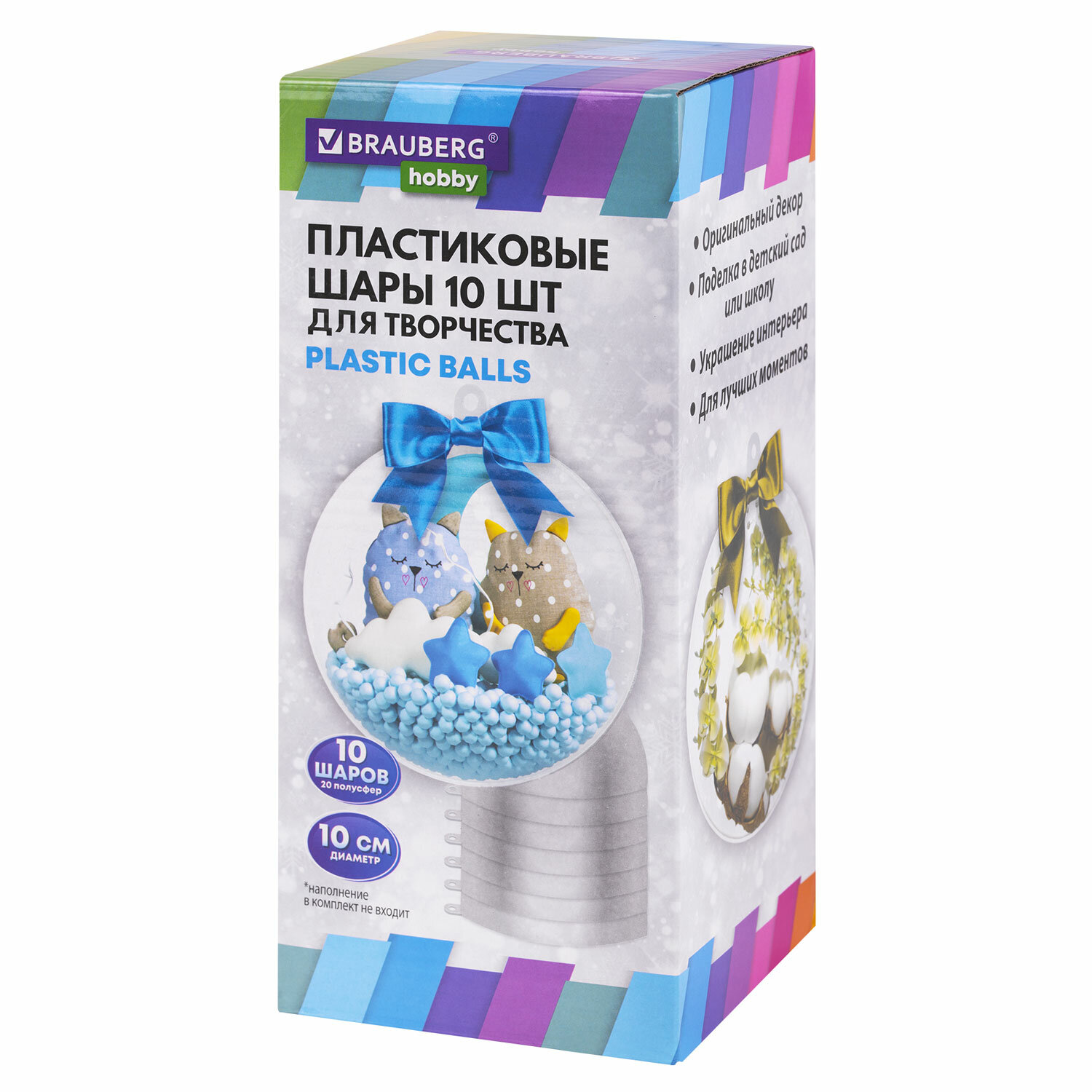 Пластиковые шары для поделок, 10 см, 10 шт., BRAUBERG HOBBY, 665395 Код товара: 665395 624,69 ₽ Купить Производитель:BRAUBERG HOBBY Пластиковые шары для поделок BRAUBERG HOBBY предназначены для создания уникальных новогодних украшений, красочных поделок и аксессуаров для дома. Пластиковые шары для поделок BRAUBERG HOBBY предназначены для взрослых, увлекающихся творчеством, и детей старше 3 лет. В набор входят 20 половинок (полусфер) из прозрачного пластика диаметром 10 см. Они имеют удобную конструкцию с "ушками", которые необходимо соединить для образования петли для подвешивания. Таким образом из 20 половинок образуются 10 прозрачных пластиковых шаров, являющихся замечательными заготовками как для новогоднего творчества, так и для интерьерных украшений – гирлянд, фотоподелок, мобиля. Шарики можно заполнить сладостями, конфетти, светодиодными свечами, фруктами или другими мелочами, добавить украшение из бархата или перьев, чтобы создать эффектный декор. Получившиеся изделия станут оригинальным украшением или подарком. От них веет безмятежностью и умиротворением, а сам процесс работы всегда приносит настоящее удовольствие. Товар упакован в картонную подарочную коробку, которая надежно защищает от влаги и деформирования. Пластиковые шары относятся к товарам средней ценовой категории. Срок годности не ограничен.Производство: КитайФорма: шарикиКоличество в упаковке: 10 шт.Длина: 100 ммШирина: 100 ммЦвет: прозрачныйВозрастная группа: старше 3 летМатериал: пластикУпаковка: Картонная коробкаВес: 540 грРазмер упаковки: 10.9 × 25.9 × 11.7 смОбъём: 0.0039 м3Промежуточная упаковка: 16 штТранспортная упаковка: 16 штШтрих-код: 4606224412566 Сертификат-1.jpg Сертификат-2.jpg Сертификат-3.jpg