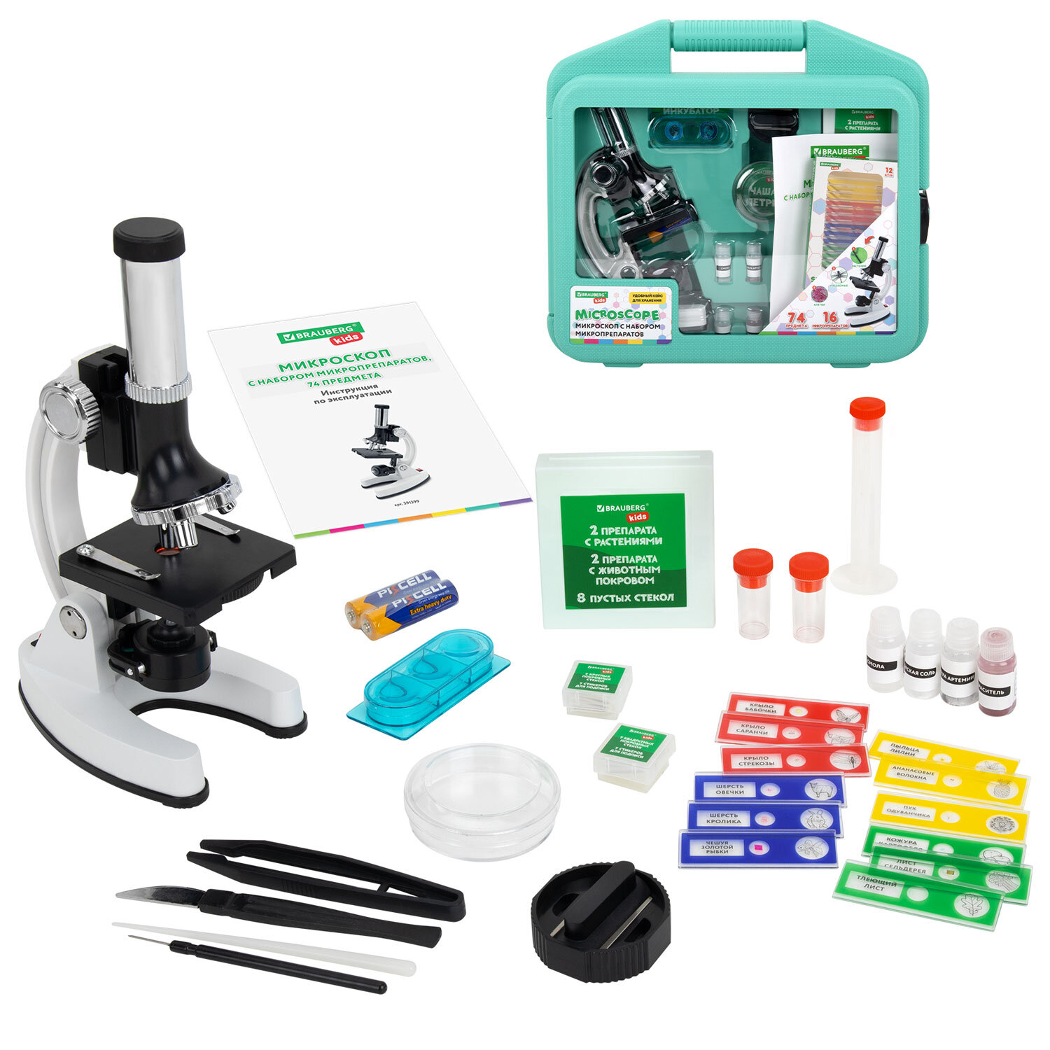 Микроскоп BRAUBERG KIDS – готовый набор юного учёного! Он прост в использовании и укомплектован всем необходимым для того, чтобы каждый ребёнок мог почувствовать себя настоящим исследователем сразу после покупки. Оптика высокого качества позволяет достичь кратности увеличения (произведения кратности увеличения окуляра на кратность увеличения объектива) в 300х, 600х и даже 1200х. Встроенная LED-подсветка (батарейки в комплекте) обеспечит наилучший результат при наблюдениях.