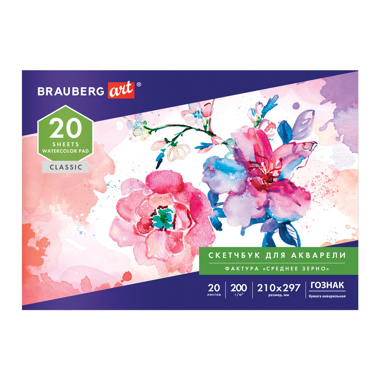 Альбом для акварели, бумага ГОЗНАК СПб 200 г/м2, 210x297 мм, 20 л., склейка, BRAUBERG ART Код товара: 106141 173,15 ₽ Купить Производитель:BRAUBERG ART Альбом для рисования BRAUBERG ART предназначен для профессионалов и людей, увлекающихся живописью. В альбоме использована специальная бумага для рисования акварелью производства ГОЗНАК СПб. Содержит 20 листов плотностью 200 г/м2 формата А4 (210х297 мм). Красочная обложка выполнена из мелованного картона. Скрепление листов осуществляется с помощью склейки. Подходит для смешанных техник рисования: красками, карандашами и фломастерами.Производство: РоссияФормат: А4Серия: ClassicПлотность внутреннего блока: 200 г/м2Тип товара: альбомы для акварелиКоличество листов: 20Внутренний блок: художественная бумага для акварели ГОЗНАКШирина: 210 ммДлина: 297 ммТекстура: среднее зерноЦвет внутреннего блока: белыйБелизна 100%: даБез кислот: даОбложка: мелованный картонТип скрепления: склейкаЖесткая подложка: даДизайн обложки: Прекрасные цветыКоличество дизайнов в упаковке: 1 шт.Индивидуальная упаковка: даВес: 314 грРазмер упаковки: 0.7 × 29.9 × 20.9 смОбъём: 0.0006 м3Промежуточная упаковка: 34 штТранспортная упаковка: 34 штШтрих-код: 4606224324999 Сертификат-1.jpg Сертификат-2.jpg Сертификат-3.jpg