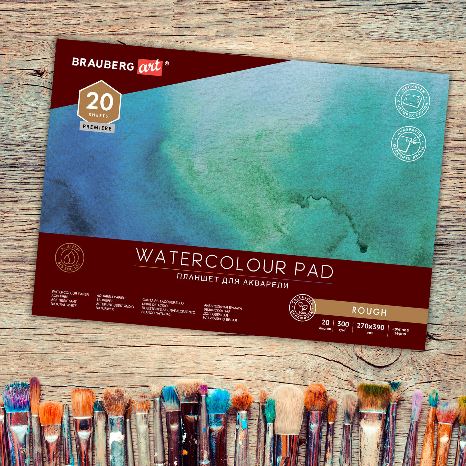 Папка для акварели/планшет, 300 г/м2, 270х390 мм, склейка, крупное зерно, 20 л., BRAUBERG ART PREMIERE Ликвидация Код товара: 113250 473,22 ₽ Купить Производитель:BRAUBERG ART Планшет для акварели BRAUBERG ART PREMIERE предназначен для профессионалов и людей, увлекающихся живописью. В альбоме использована профессиональная импортная акварельная бумага. Планшет для акварели с профессиональной импортной бумагой плотностью 300 г/м2 из 100% целлюлозы. Блок проклеен с 4-х сторон, надежно фиксируя рабочий лист. Предусмотрен непроклеенный уголок для более легкого отделения листа с готовой работой (рекомендуется отделять листы канцелярским ножом, мастихином). Планшет содержит жесткую подложку, обеспечивающую твердую и ровную основу. Прекрасно подойдет как для мокрой акварели (по-сырому), так и для классической техники акварели. При впитывании воды бумага не деформируется, что обеспечивает равномерную и плавную заливку, стойка к стиранию, скоблению. Идеально держит цвет - тона останутся выразительными и экспрессивными. Без кислот, что гарантирует долговечность творений! Бумага BRAUBERG ART PREMIERE подойдет как для начинающих любителей акварельной живописи, так и станет верным помощником для выражения самых комплексных идей профессионалов.Производство: КитайФормат: 270х390 ммСерия: PremiereПлотность внутреннего блока: 300 г/м2Тип товара: планшет для акварелиКоличество листов: 20Внутренний блок: бумага для акварелиШирина: 270 ммДлина: 390 ммТекстура: крупное зерноЦвет внутреннего блока: белыйБелизна 100%: даБез кислот: даОбложка: мелованный картонТип скрепления: склейкаЖесткая подложка: даДизайн обложки: ЛазурьКоличество дизайнов в упаковке: 1 шт.Индивидуальная упаковка: даВес: 841 грРазмер упаковки: 1.2 × 38.8 × 27.1 смОбъём: 0.0021 м3Промежуточная упаковка: 10 штТранспортная упаковка: 20 штШтрих-код: 4606224325460 Сертификат-1.jpg Сертификат-2.jpg